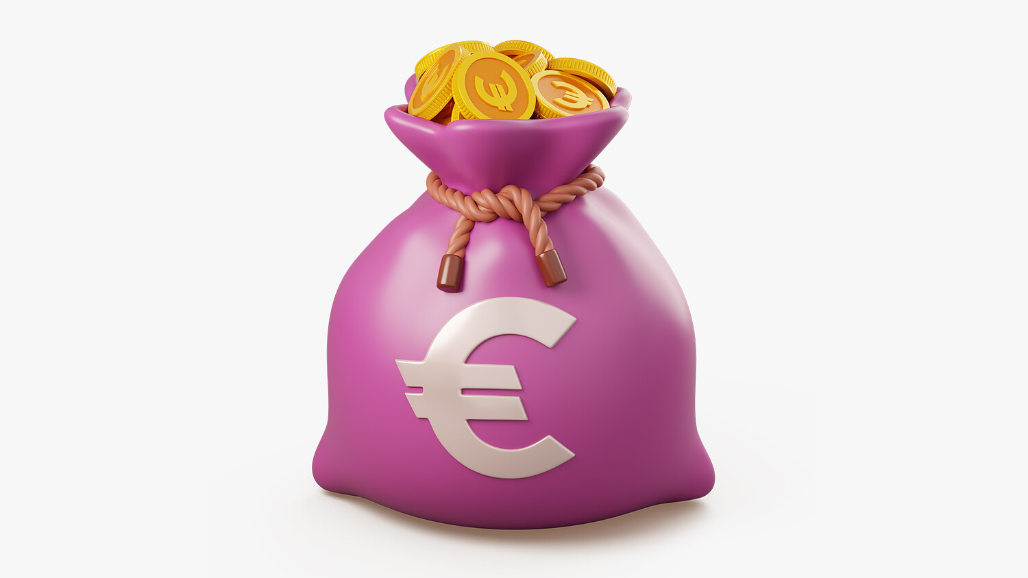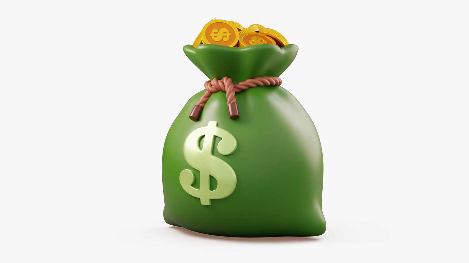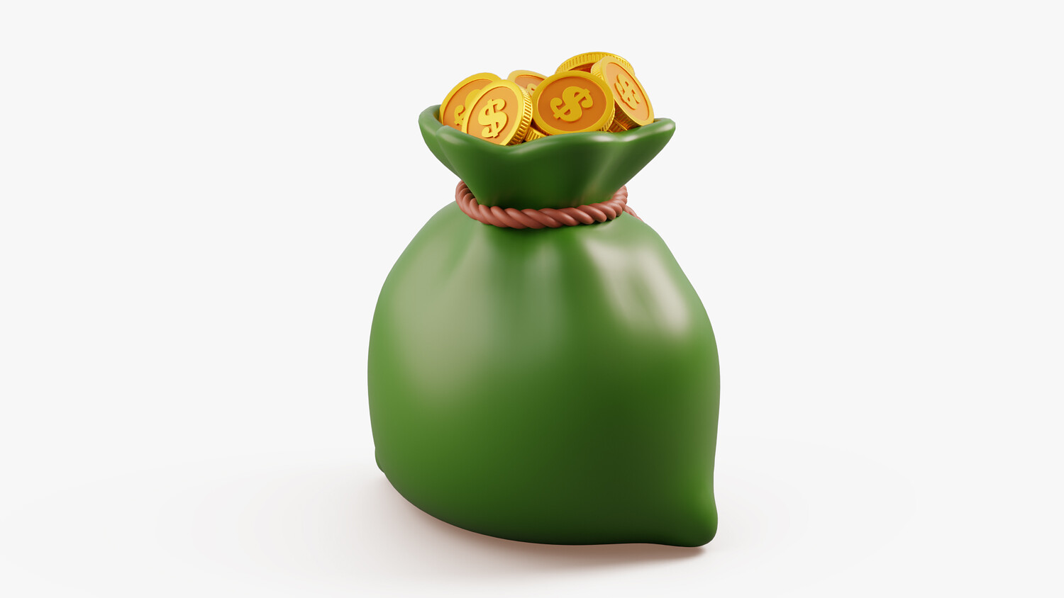 This 3D stylized money bag set includes three colorful coin sacks, each marked with a bold currency symbol: Bitcoin (₿), Dollar ($), and Euro (€). The bags are filled with shiny gold coins and secured with twisted ropes, making them ideal for game rewards, banking or crypto UI, mobile interfaces, or playful finance scenes.