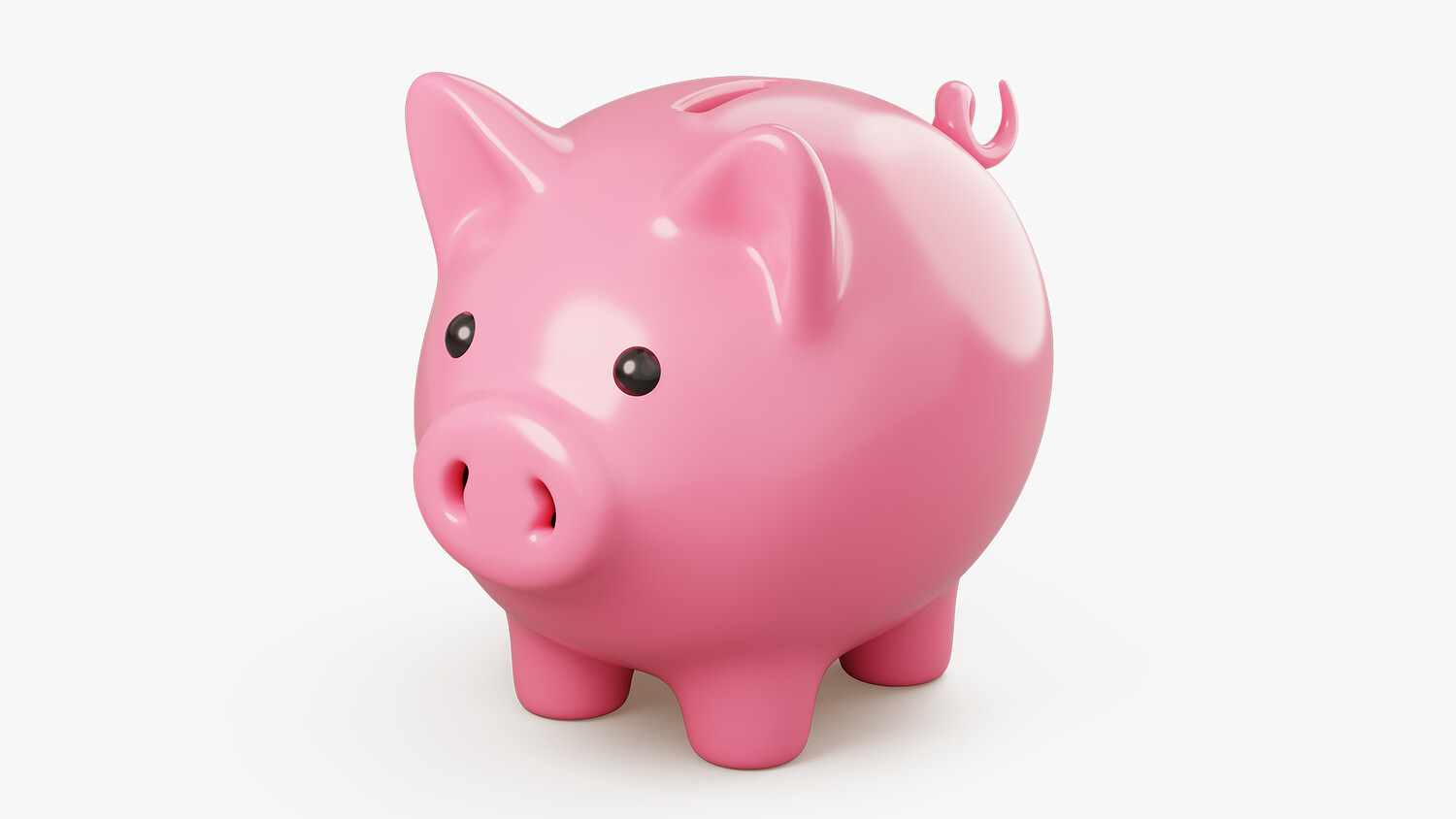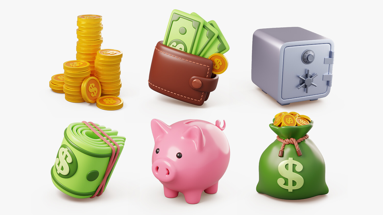A vibrant and playful 3D icon set featuring six stylized finance-themed objects: Stacks of golden coins; A leather wallet filled with cash; A secure metal vault; Rolled-up banknotes with rubber bands; A classic pink piggy bank; A money bag overflowing with coins.