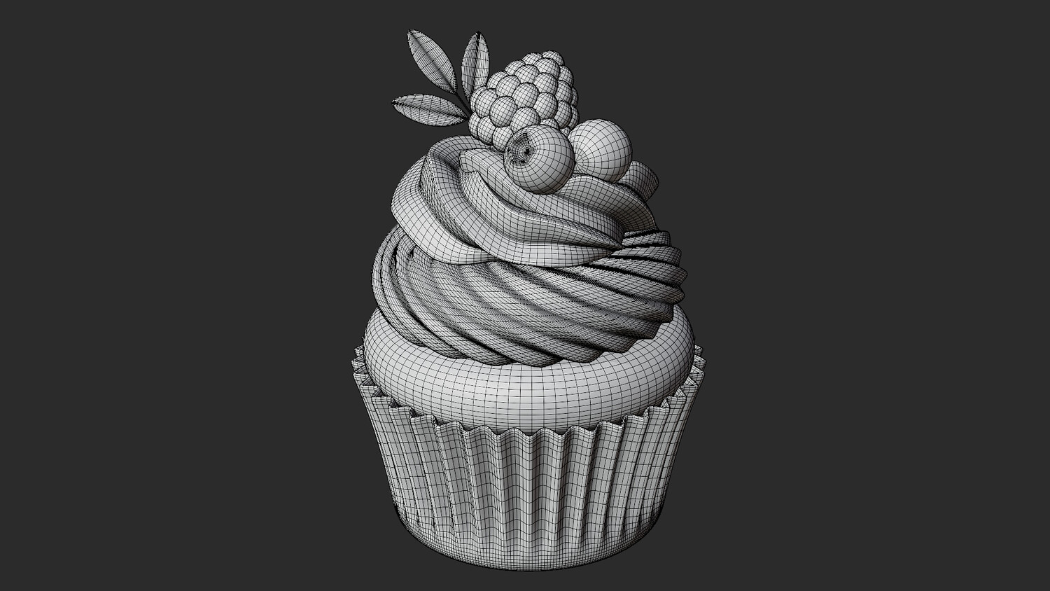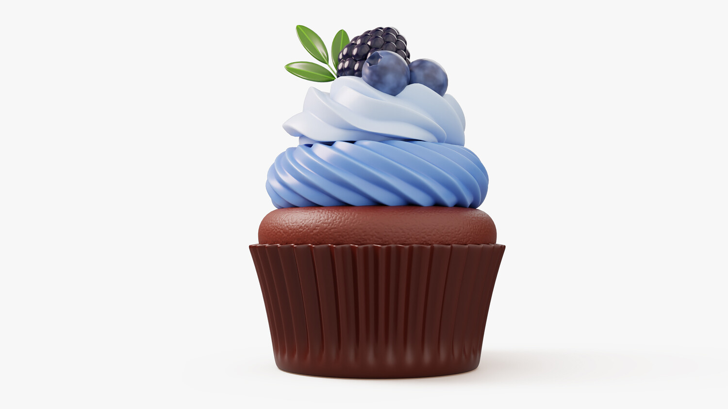 A vibrant and charming 3D blueberry cupcake in a cartoon-style design, perfect for a wide range of visual projects. This dessert features a rich chocolate base topped with swirled blue and white frosting, adorned with realistic blueberries, a blackberry, and green leaves for a fresh, appealing touch. Ideal for use in advertising, packaging, mobile games, children’s content, or AR/VR scenes. Its playful look and clean stylization make it an excellent fit for sweet-themed visuals, bakery promotions, or festive illustrations.