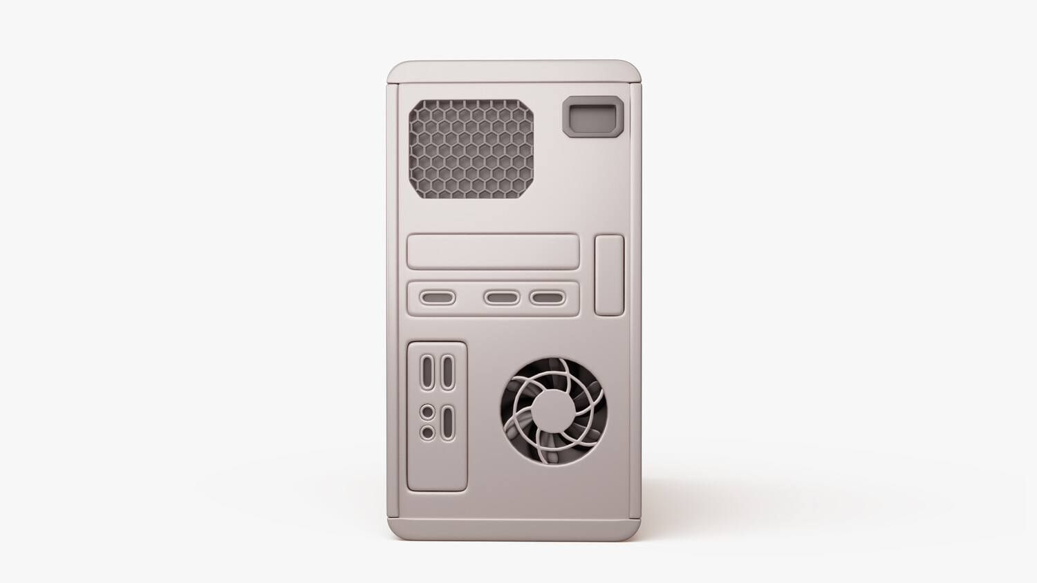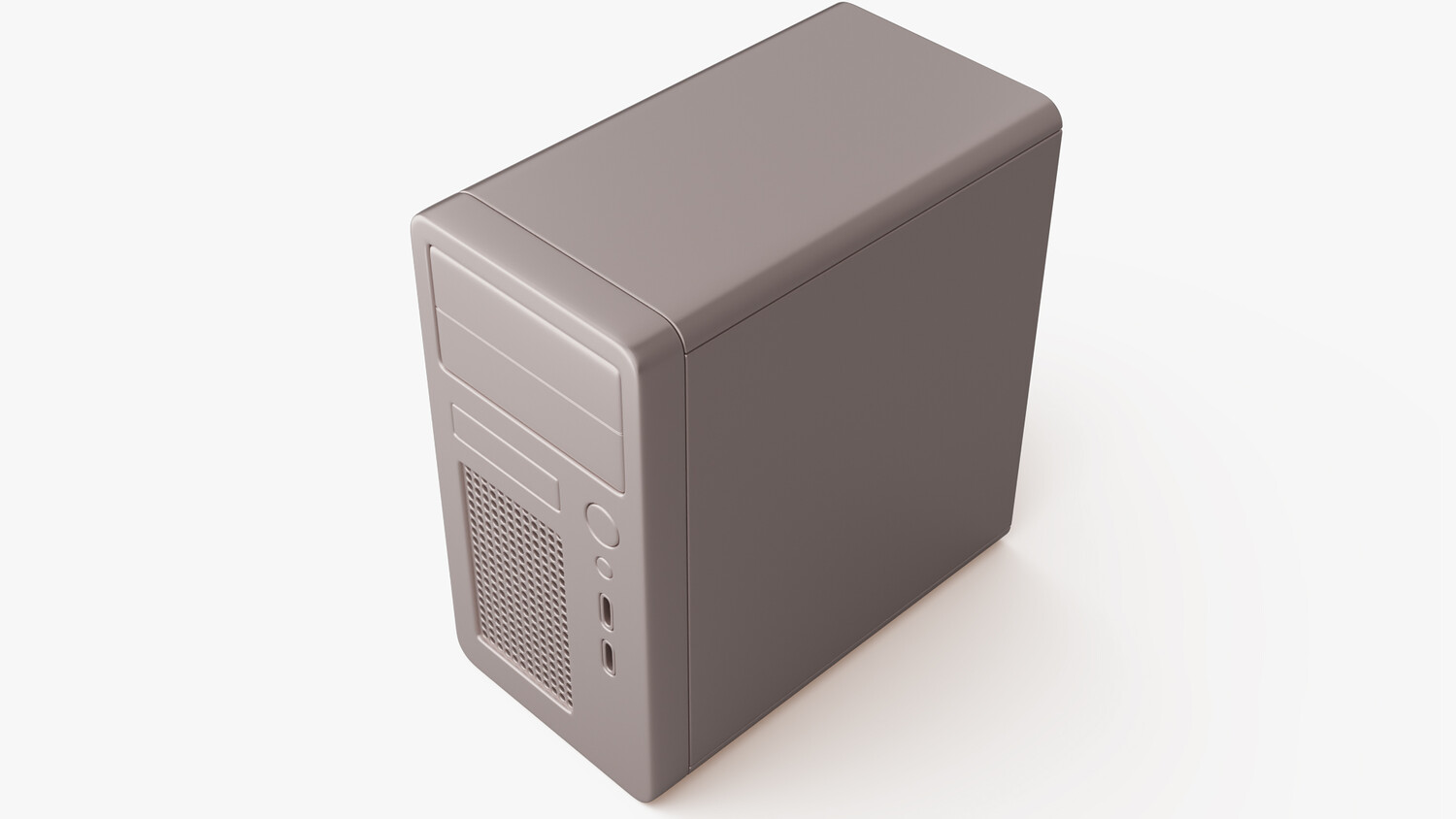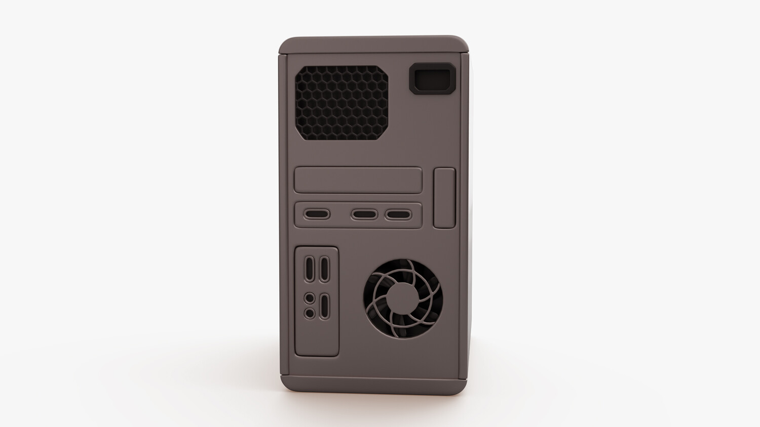 Detailed 3D model of a computer tower in a clean, cartoon-style design. The model features a rectangular case with a front panel that includes ventilation grills, drive bays, and minimalistic port details. Perfect for use in technology-themed scenes, gadget collections, educational projects, and game environments. Ideal for animations, AR/VR applications, and visualizations where a simplified yet recognizable computer hardware representation is needed.