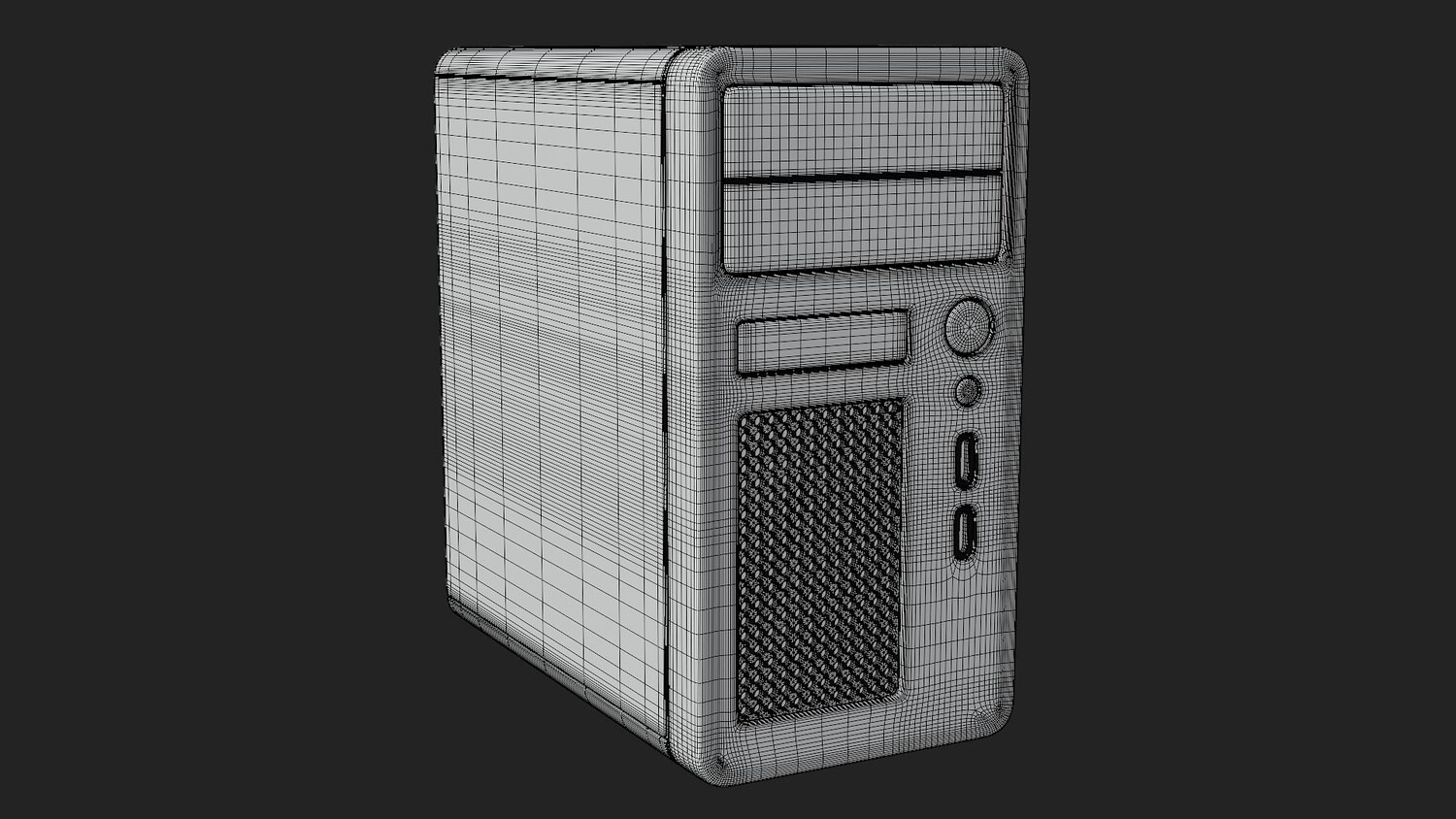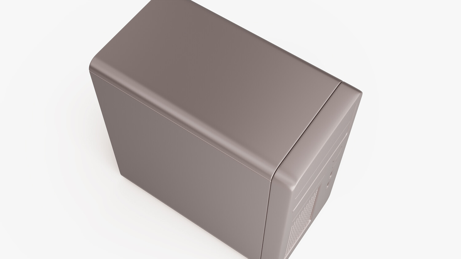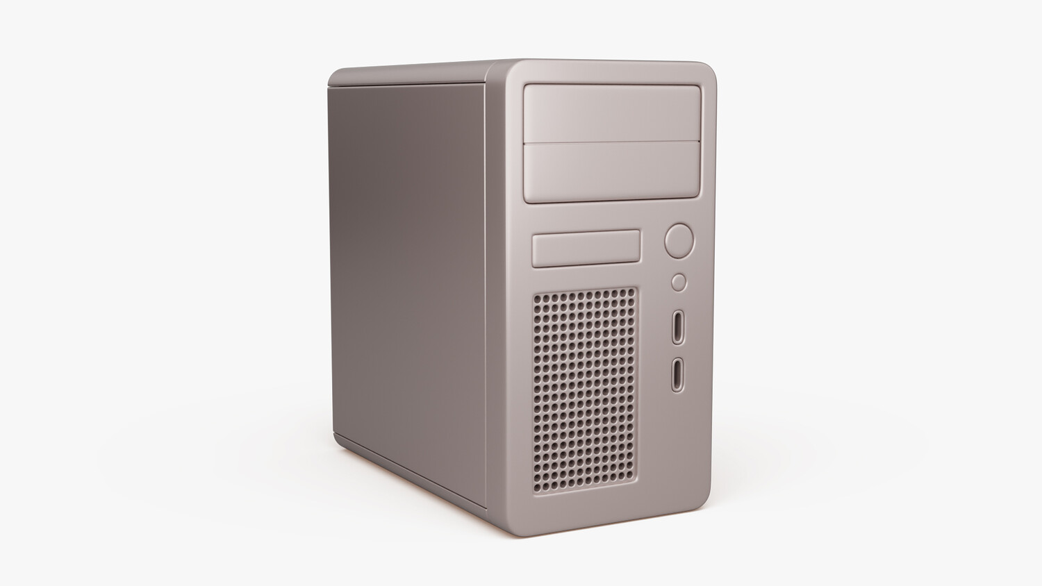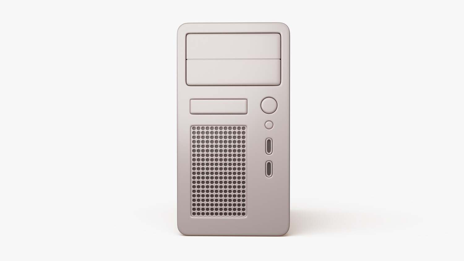 Detailed 3D model of a computer tower in a clean, cartoon-style design. The model features a rectangular case with a front panel that includes ventilation grills, drive bays, and minimalistic port details. Perfect for use in technology-themed scenes, gadget collections, educational projects, and game environments. Ideal for animations, AR/VR applications, and visualizations where a simplified yet recognizable computer hardware representation is needed.