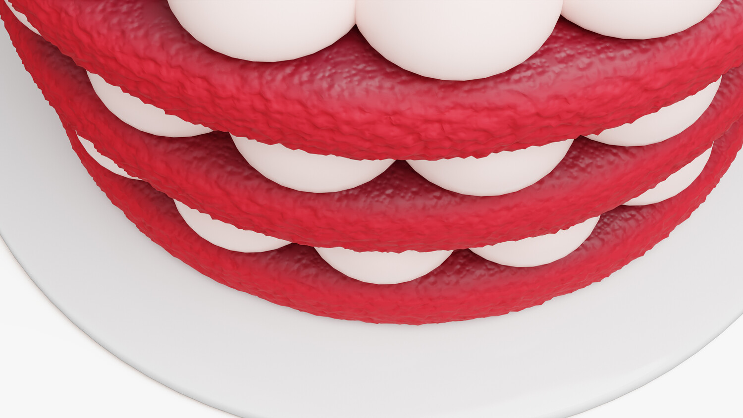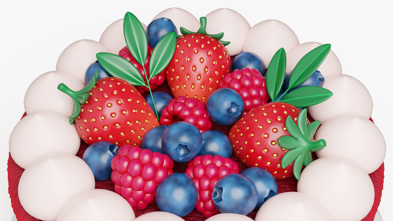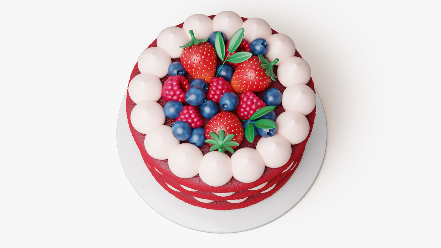 This stylized Red Velvet cake features an open-layer design with two vivid crimson sponge rings and evenly spaced white cream dollops that form a clean circular rhythm. The top is filled with a bright berry mix—strawberries, raspberries, and blueberries—accented by simple green leaves. Smooth surfaces, soft shadows, and precise proportions keep every element readable, while the saturated palette delivers a cheerful, modern bakery look with clear, cartoon-friendly shapes.