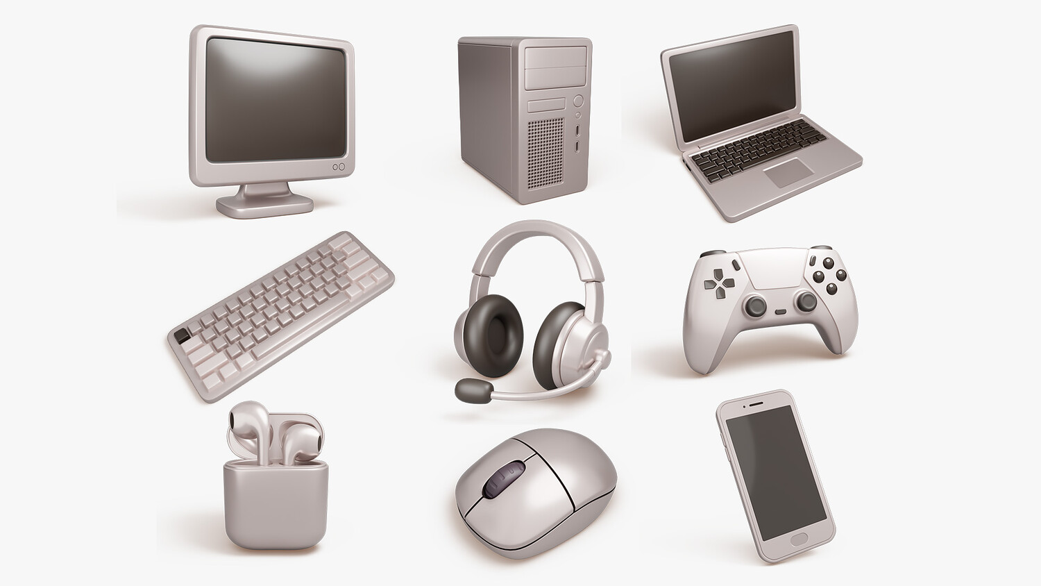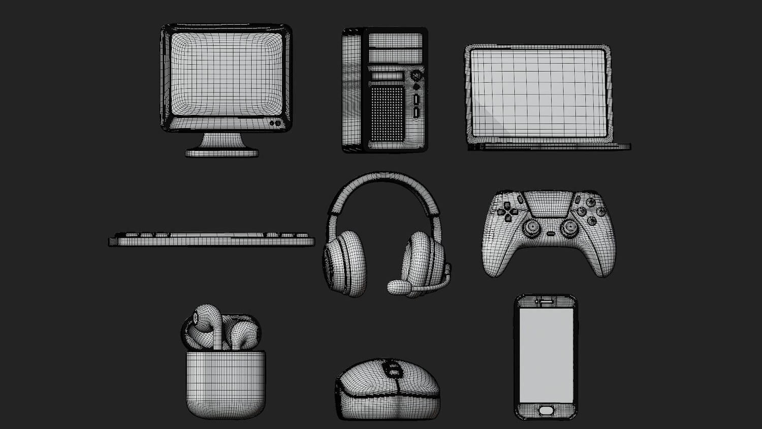 A collection of nine high-quality 3D models of digital devices and accessories, including a monitor, computer tower, laptop, keyboard, headset, game controller, wireless earbuds, computer mouse, and smartphone. Designed in a clean, minimalist, and modern style, these models are perfect for use in visualizations, advertising projects, infographics, and technology-related presentations. Ideal for stock images, UI design, and educational materials.