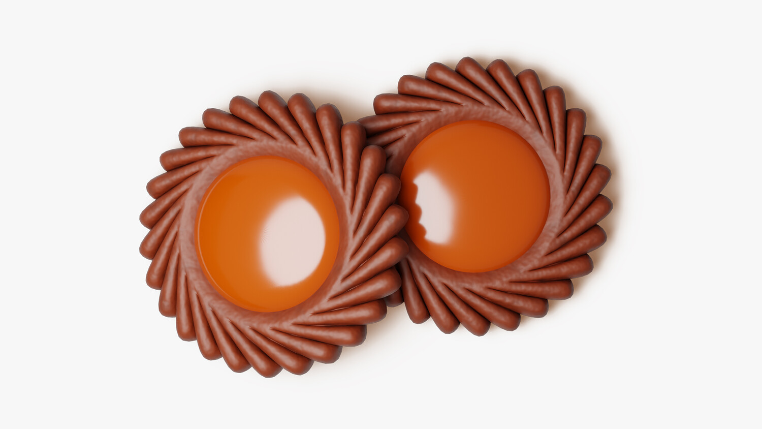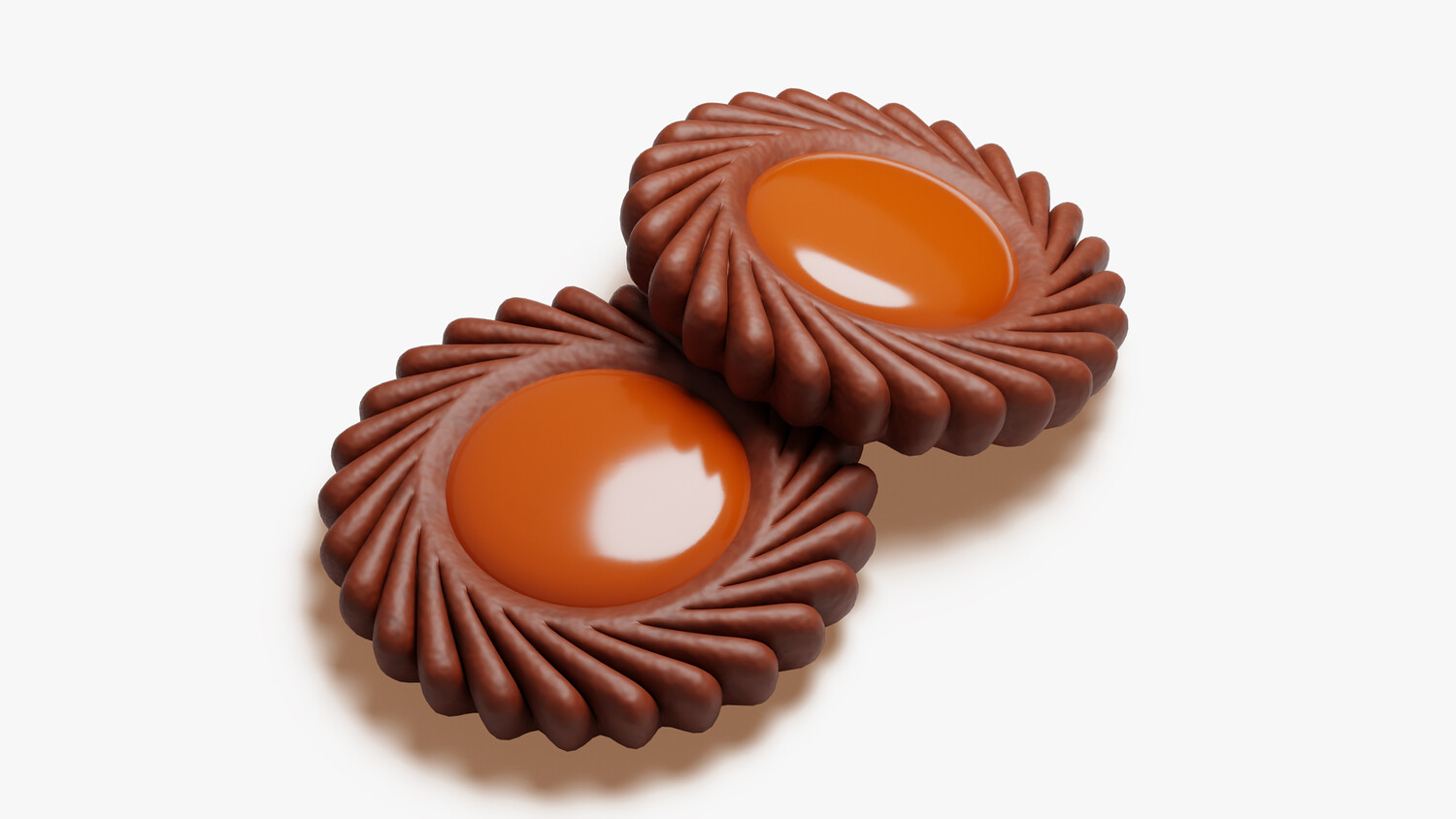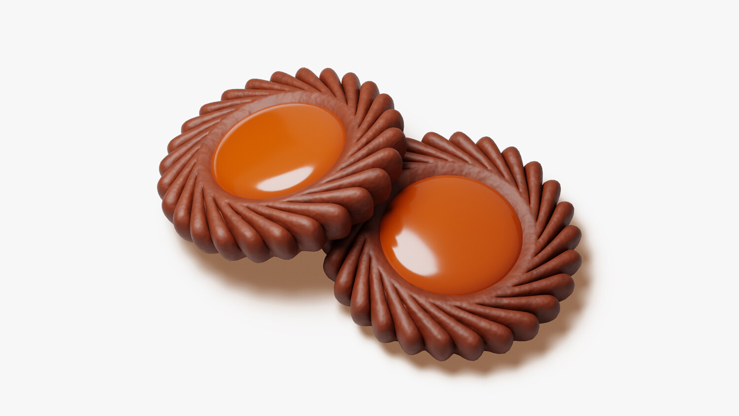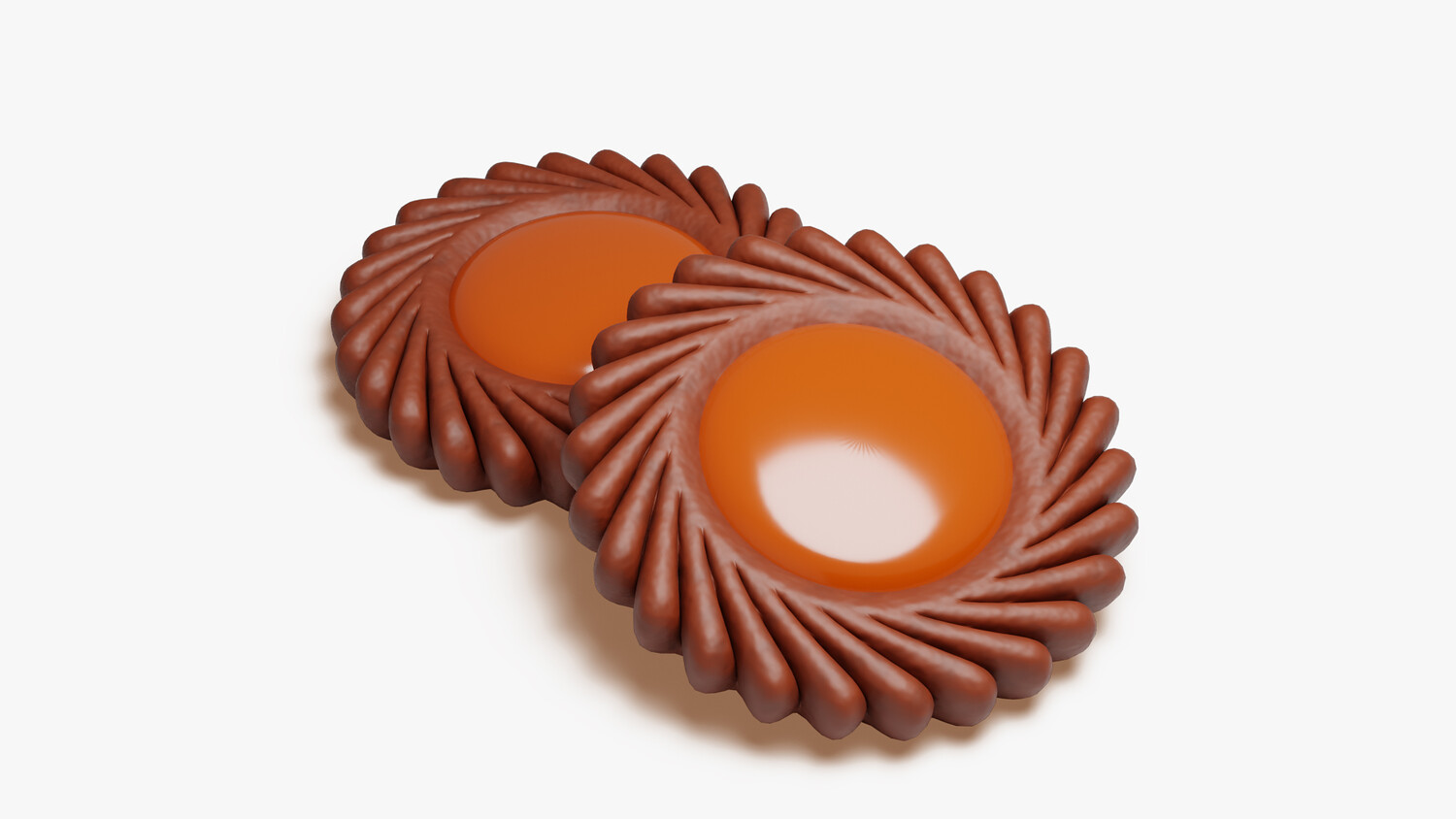 A stylized ring cookie piped from cocoa dough with deep, even ridges that spiral toward a glossy center. The middle is filled with a smooth jam-like dome in warm amber orange, creating a clean contrast against the chocolatey biscuit. Rounded edges, subtle crumb texture, and soft highlights give the cookie a polished, appetizing look that reads clearly in closeups and thumbnails. The proportions are tidy and symmetrical, emphasizing the circular flow of the ridged border around the bright filling.