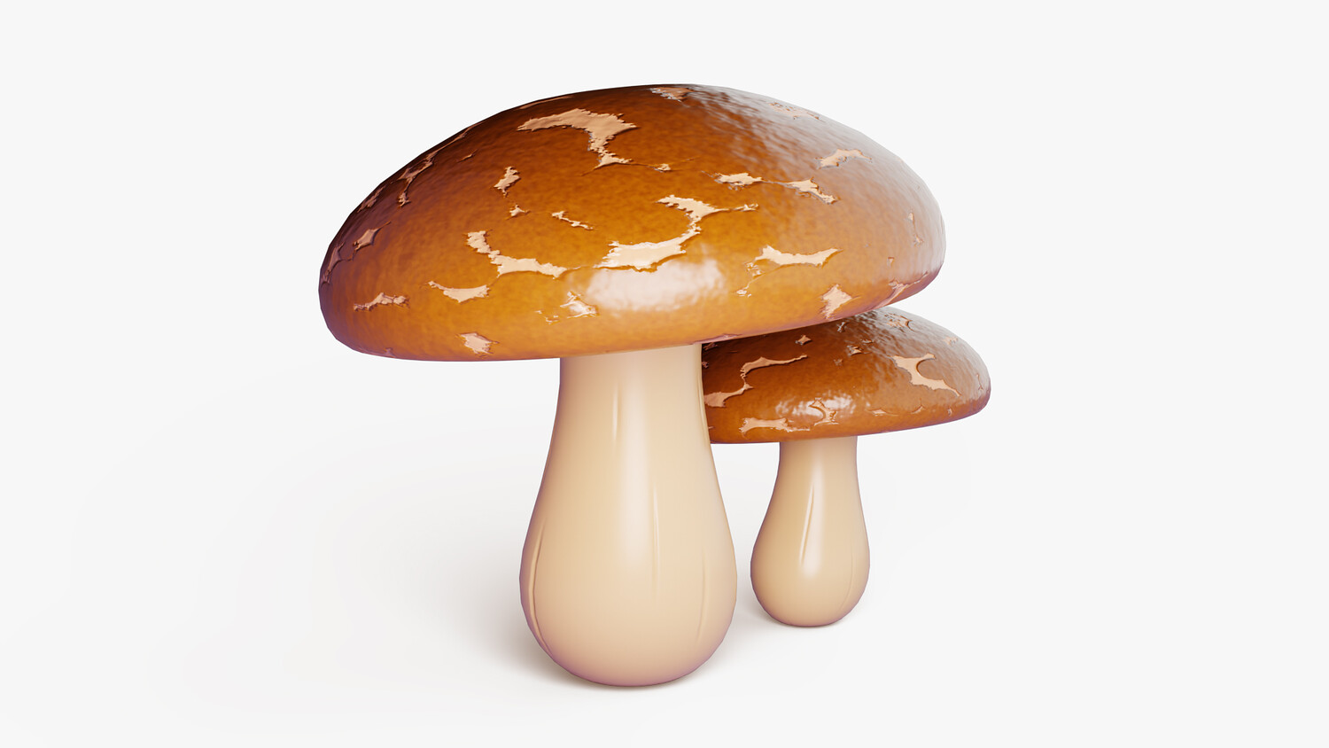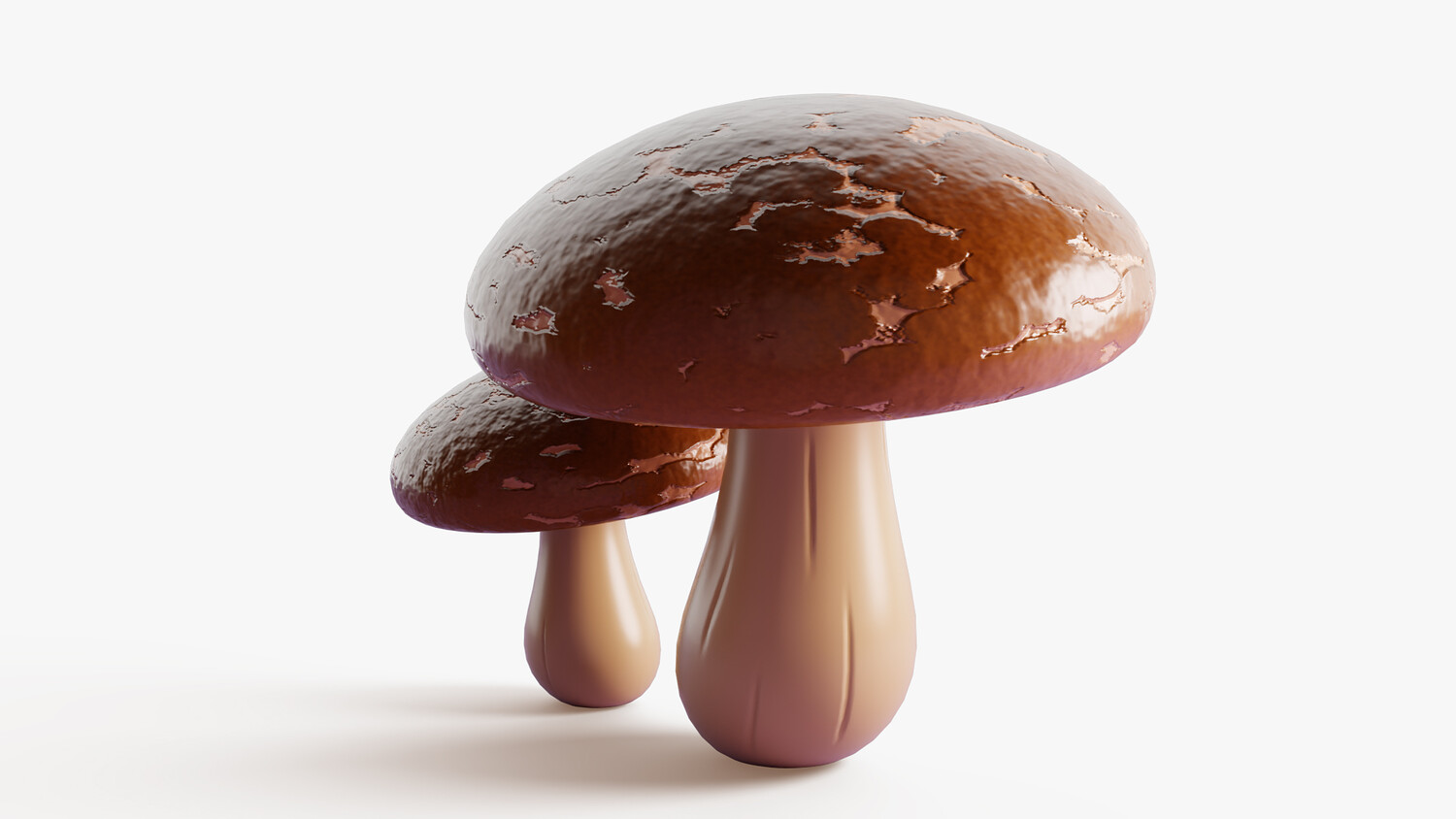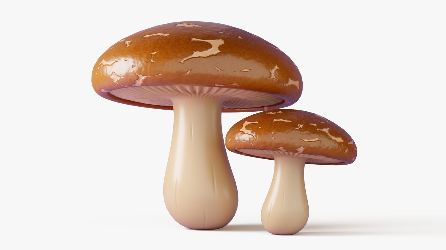 Stylized cartoon 3D model set of two shiitake mushrooms (lentinula edodes) with glossy brown caps and smooth creamy stems. The caps have soft natural variation and a slightly mottled surface, while the underside shows subtle gill detail for extra realism without noise. Clean simplified shapes and a strong silhouette make the mushrooms easy to recognize in thumbnails, icons, and scene dressing. Perfect for food themed visuals, cozy kitchens, grocery and market scenes, restaurants, farms, and stylized forest environments. Use them as a cooking ingredient, decorative prop, collectible item, or crafting resource in casual projects. The warm neutral palette blends well with many art directions and lighting setups. Great for dioramas, animations, product mockups, and AR/VR scenes where you need a polished toon look.