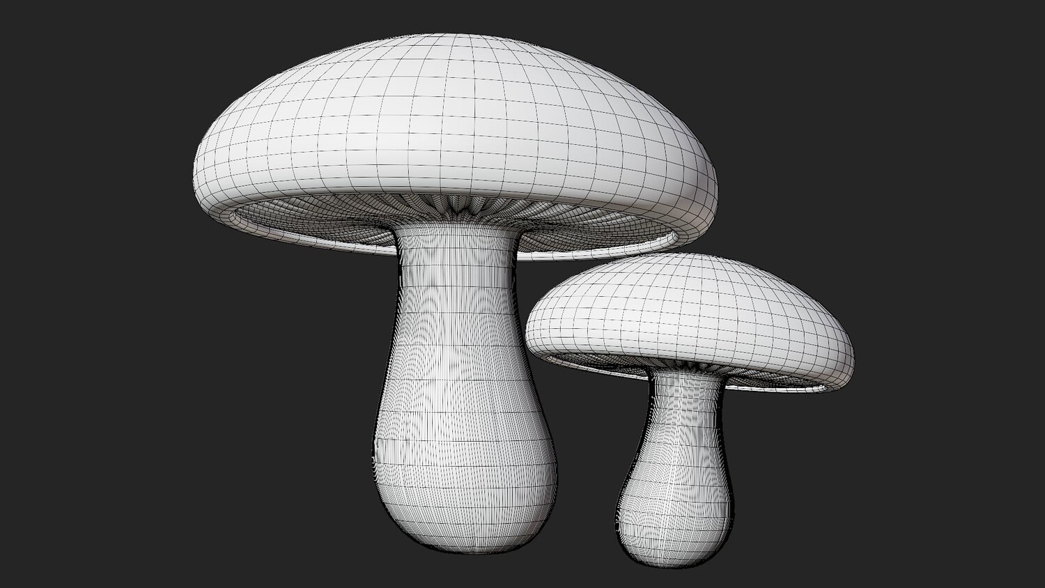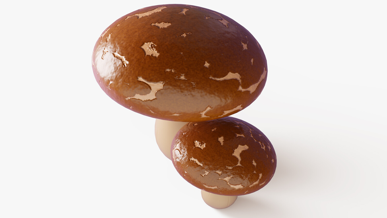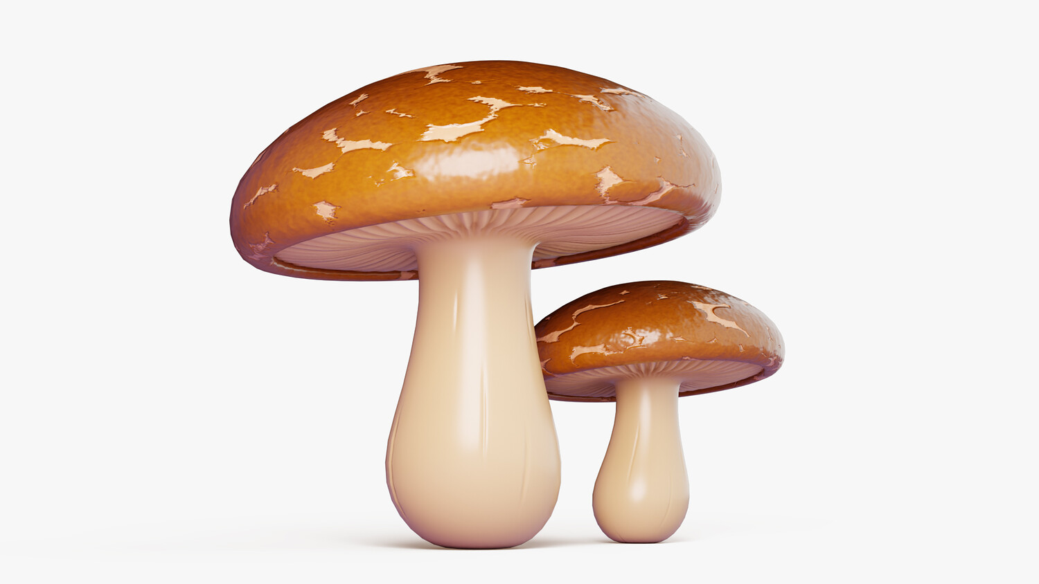Stylized cartoon 3D model set of two shiitake mushrooms (lentinula edodes) with glossy brown caps and smooth creamy stems. The caps have soft natural variation and a slightly mottled surface, while the underside shows subtle gill detail for extra realism without noise. Clean simplified shapes and a strong silhouette make the mushrooms easy to recognize in thumbnails, icons, and scene dressing. Perfect for food themed visuals, cozy kitchens, grocery and market scenes, restaurants, farms, and stylized forest environments. Use them as a cooking ingredient, decorative prop, collectible item, or crafting resource in casual projects. The warm neutral palette blends well with many art directions and lighting setups. Great for dioramas, animations, product mockups, and AR/VR scenes where you need a polished toon look.