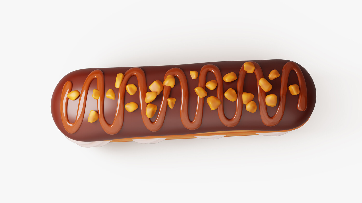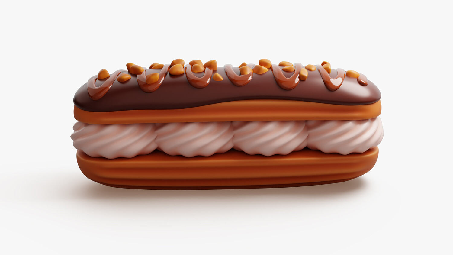 3D cartoon-style illustration of a classic chocolate Γ©clair filled with fluffy cream, topped with glossy chocolate icing, caramel drizzle, and crunchy nut pieces. This stylized dessert model is perfect for games, icons, food illustrations, bakery branding, or sweet-themed projects. Clean topology, soft shading, and a playful aesthetic make it ideal for both mobile and web use in stylized environments.