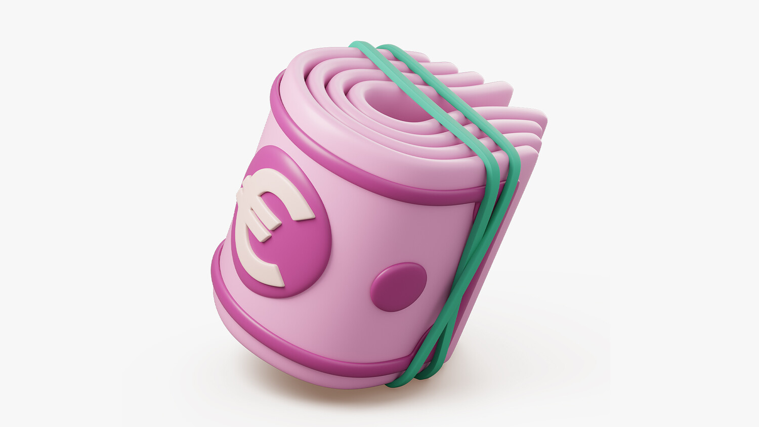 A colorful and playful 3D model of rolled-up banknotes, featuring two stylized versions: Dollar ($) and Euro (€). Each roll is secured with vibrant rubber bands and marked with a bold currency sign, making them perfect for game UI, financial apps, mobile rewards, or stylized economic scenes.