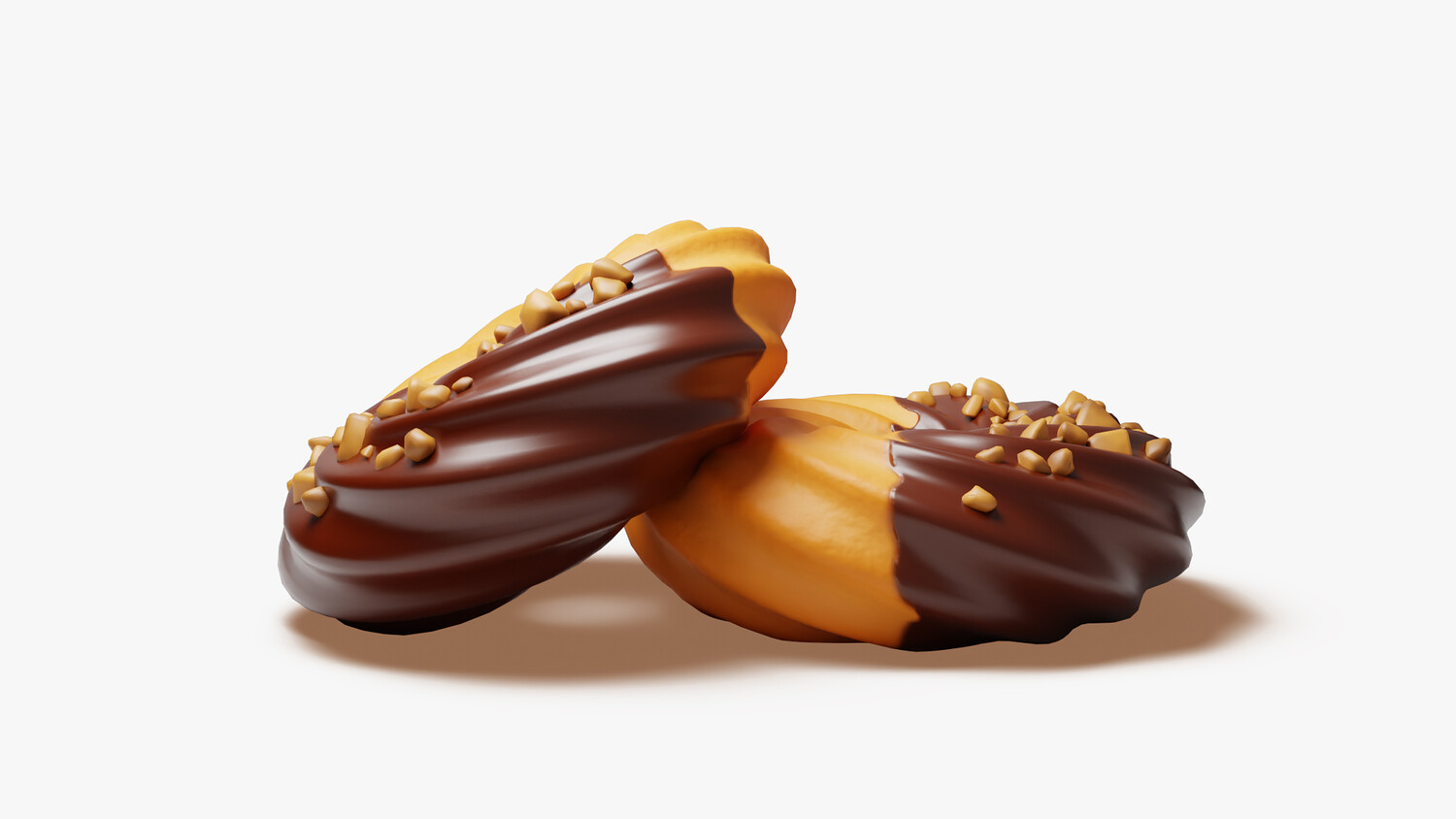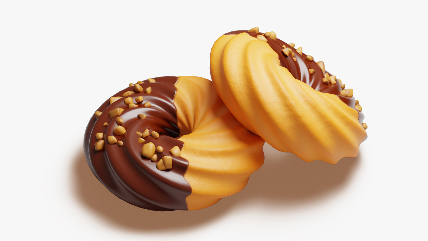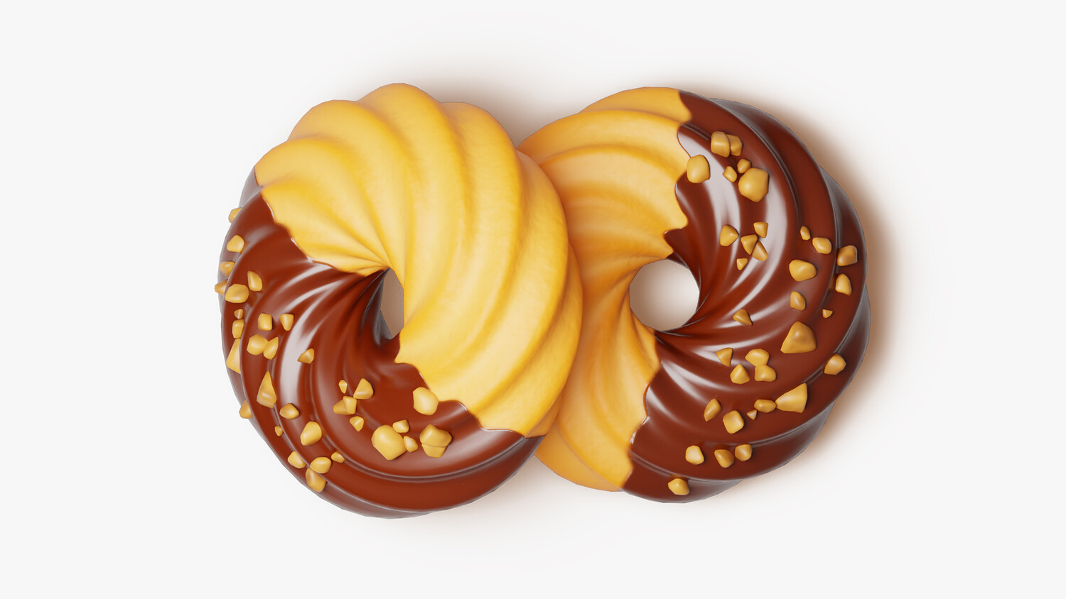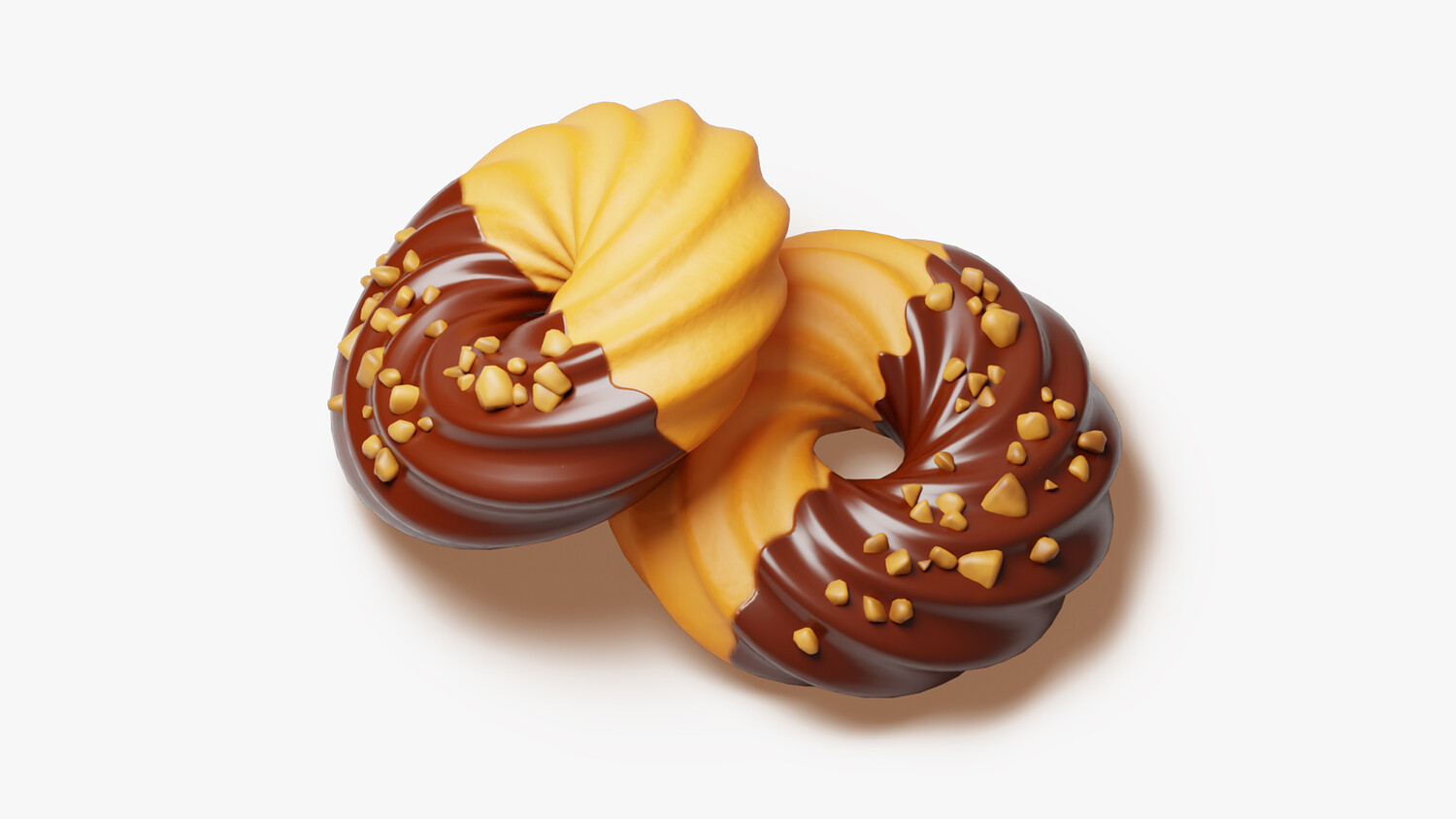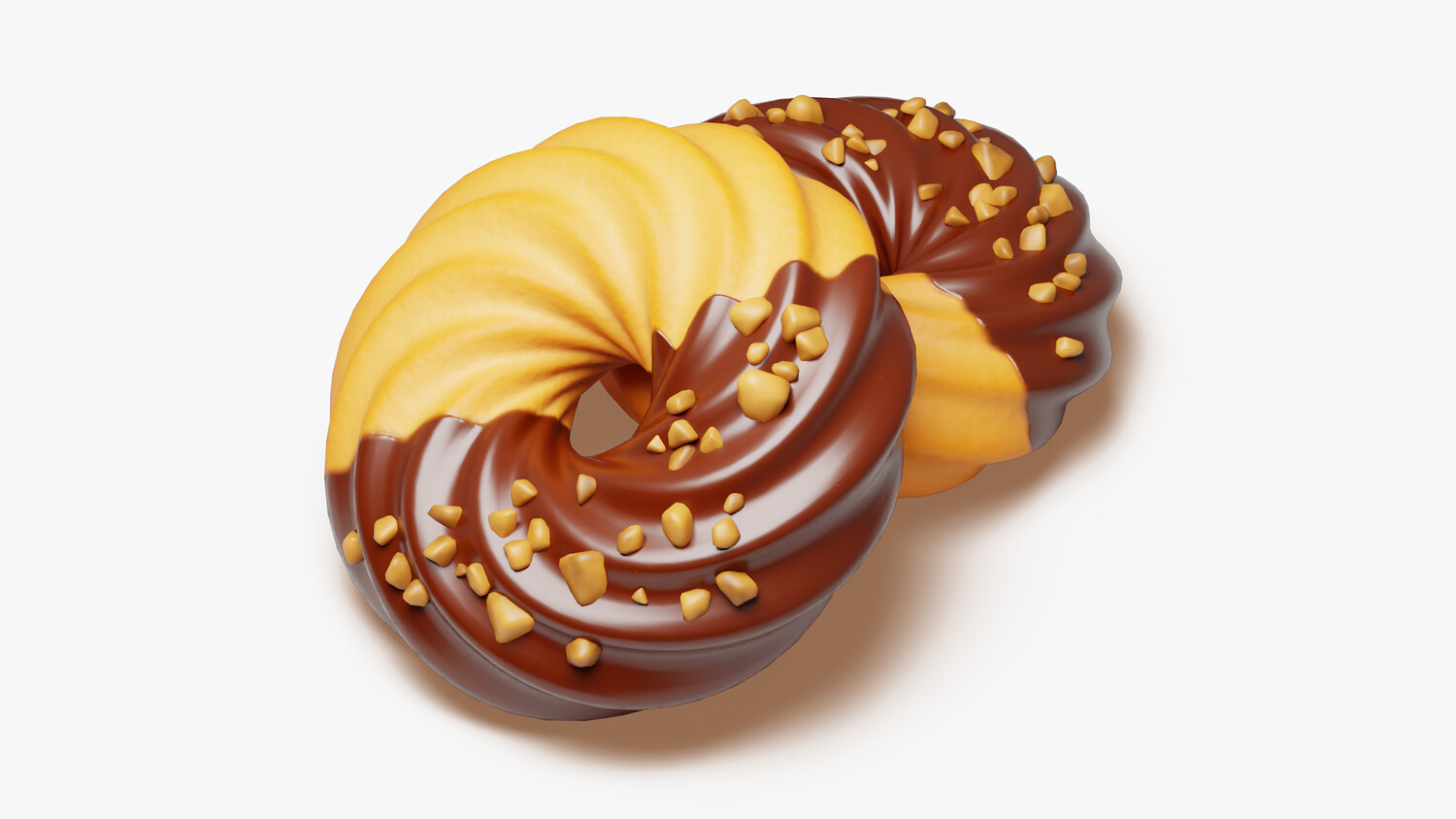 A stylized ring spritz cookie piped into a tight spiral with deep ridges and a clean open center. The golden shortbread is half coated in glossy chocolate, finished with small crunchy nut sprinkles that add texture and contrast. Rounded edges, subtle crumb, and soft highlights create a fresh-baked look, while the warm honey base and rich cocoa glaze keep the treat appetizing and instantly readable in closeups or thumbnails. Balanced proportions emphasize the flowing twist and tidy scalloped profile.