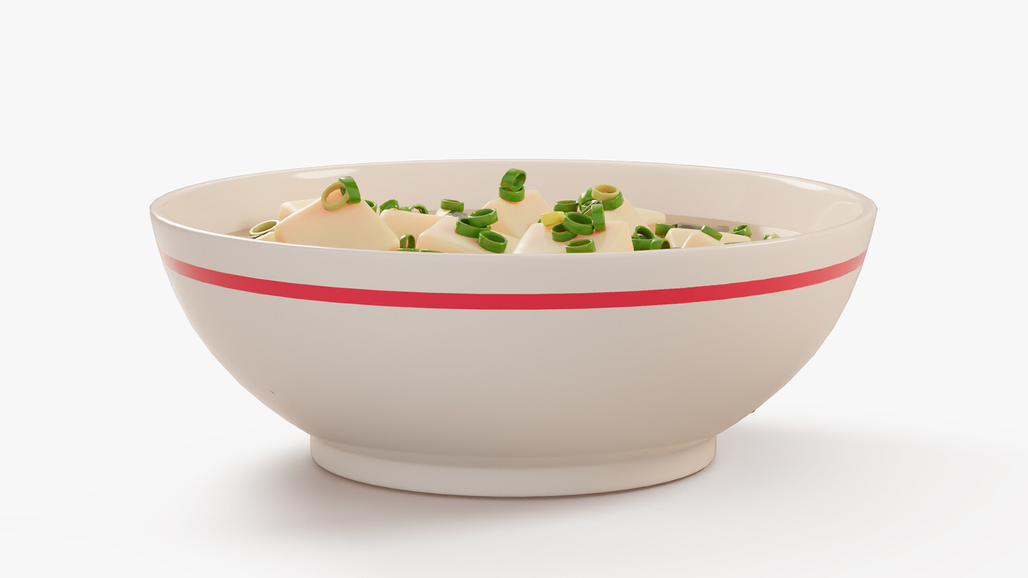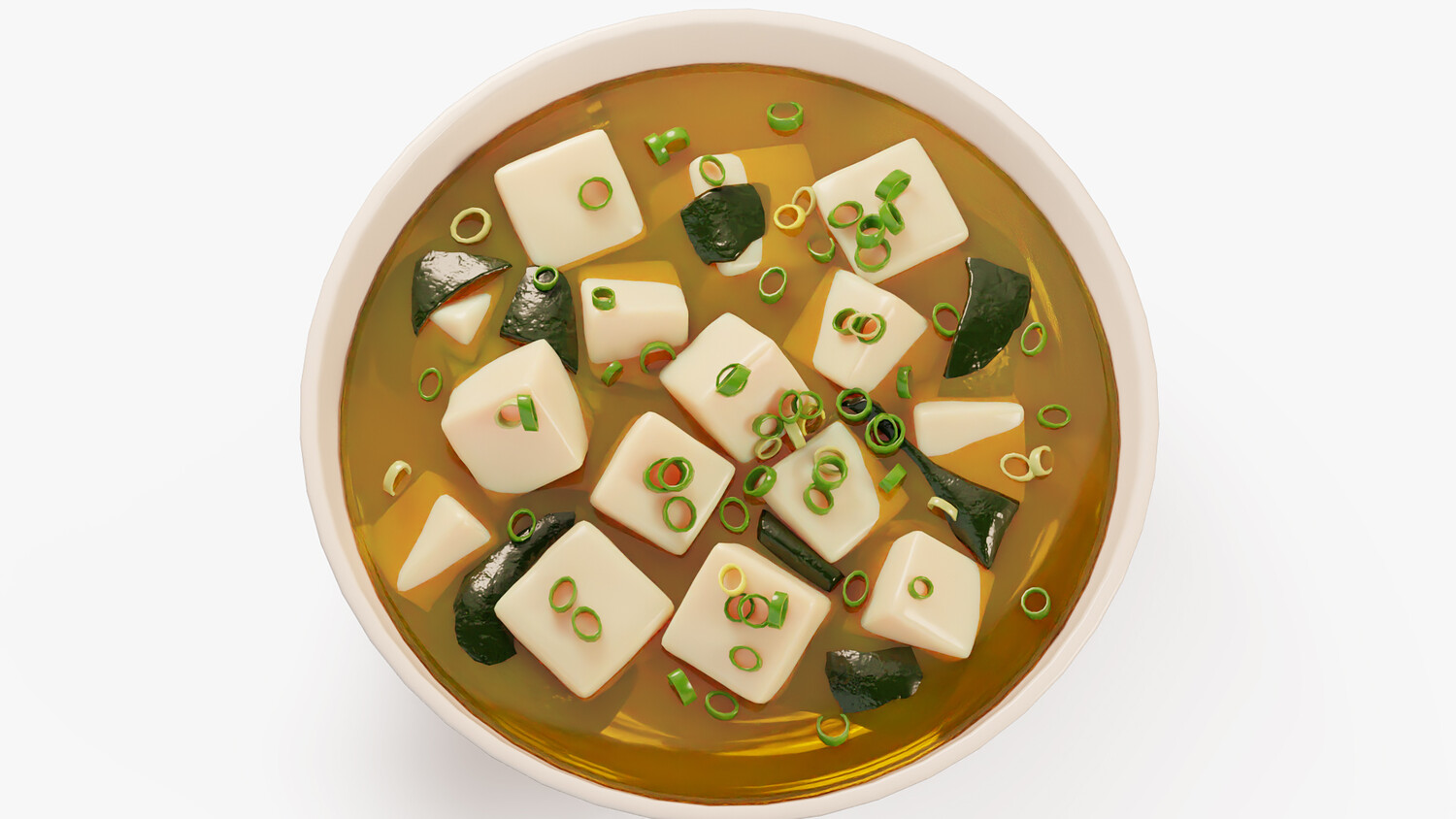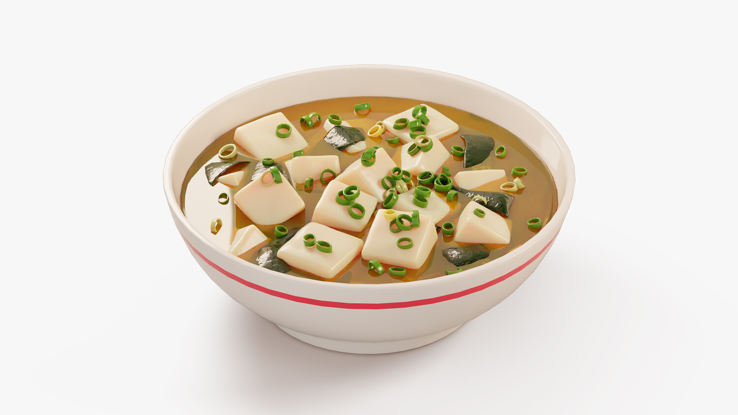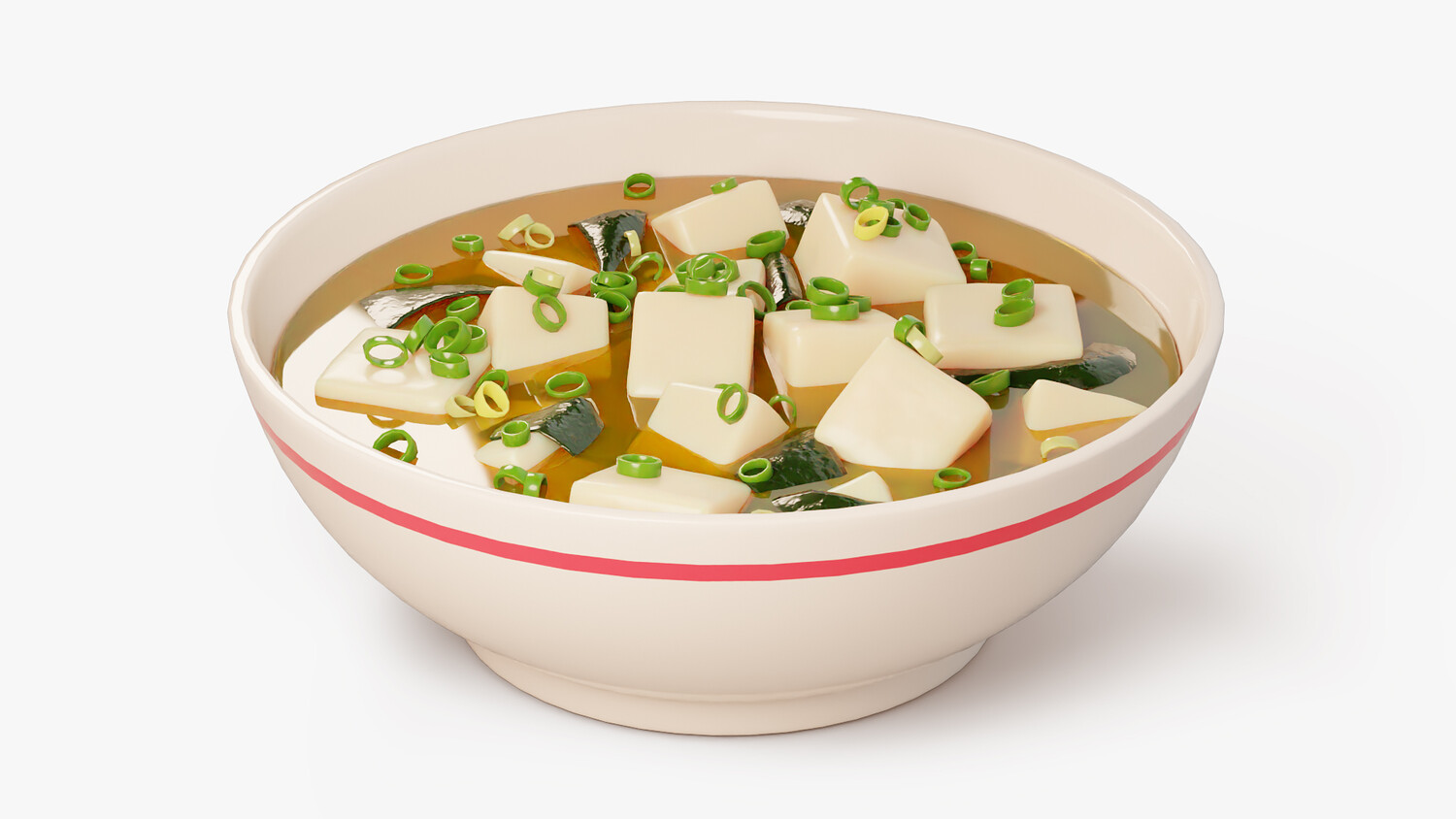 Stylized cartoon 3D model of a miso soup bowl with tofu cubes, wakame seaweed, and chopped green onion floating in warm broth. The model has clean simplified shapes, glossy highlights, and soft gradients that keep the food readable and appealing in any lighting. Perfect for Japanese cuisine scenes, restaurant and cafe visuals, kitchen and dining renders, menu presentations, delivery app graphics, and cozy stylized environments. Use it as a hero food prop on a table scene, in a sushi bar composition, or as a standalone dish for thumbnails and product mockups. The bowl design and toppings are recognizable while staying pleasantly non realistic, making it ideal for casual visuals, educational food content, animations, and AR VR scenes. Easy to combine with other Japanese dishes to build a full set.