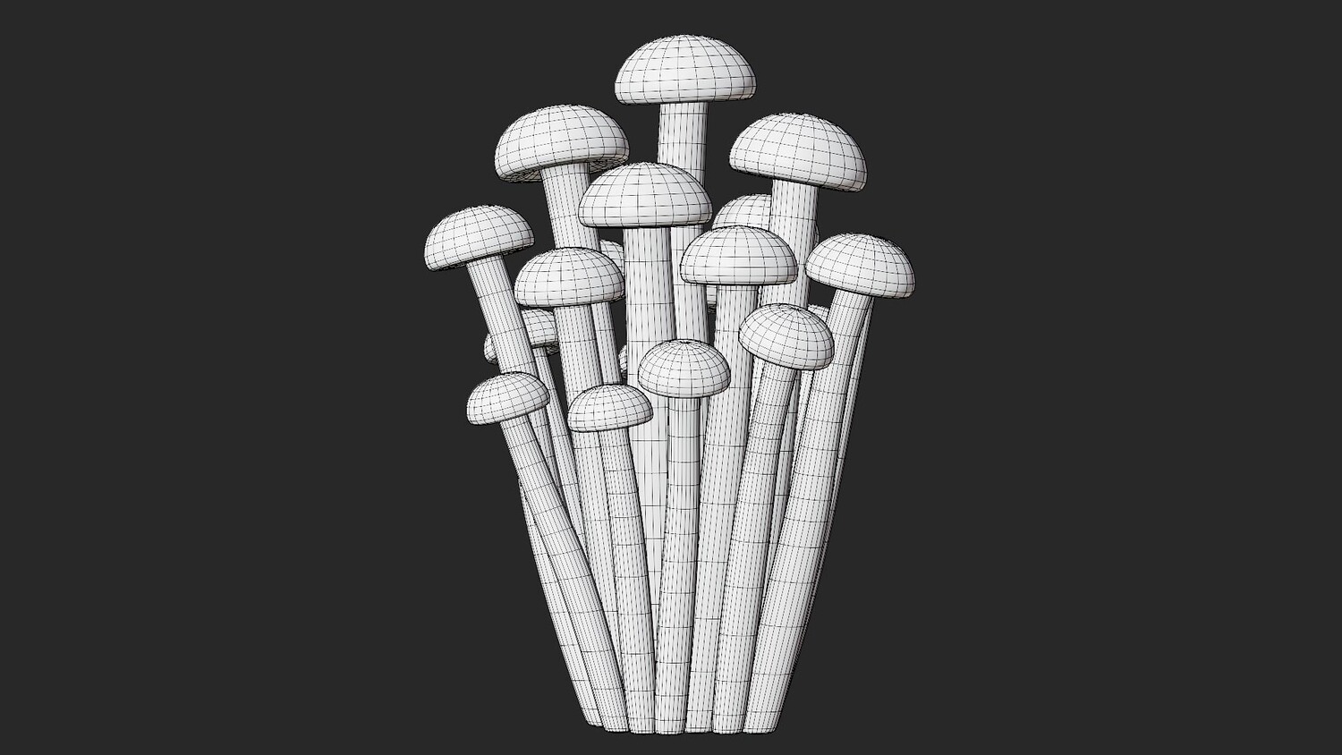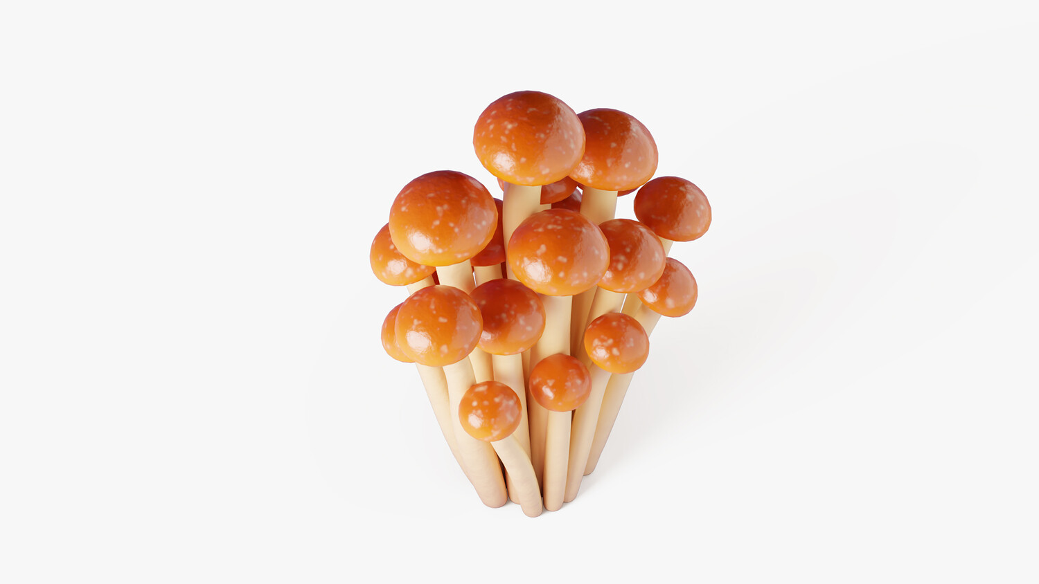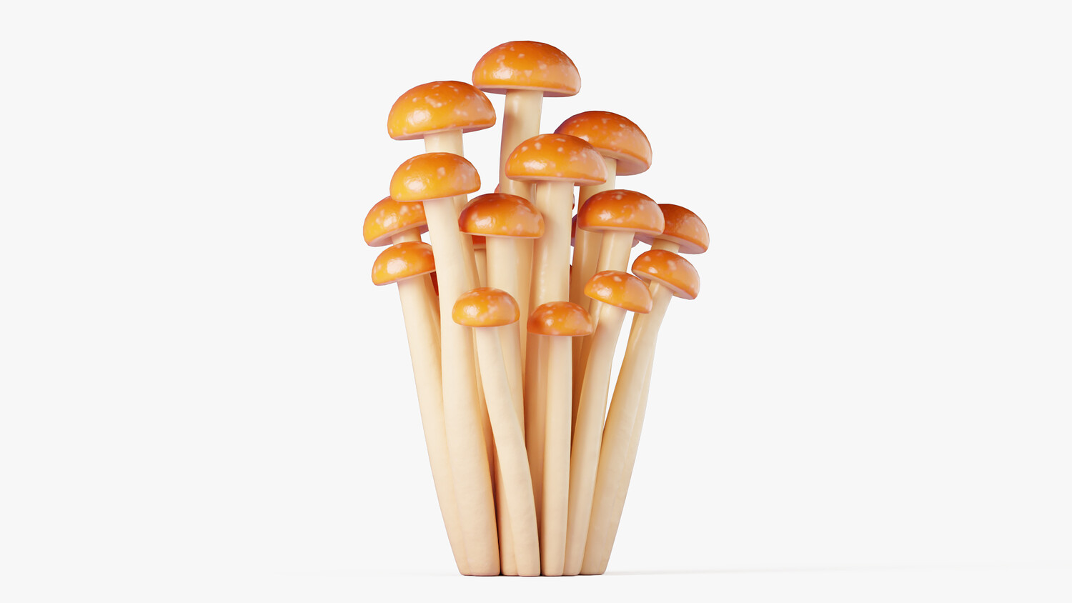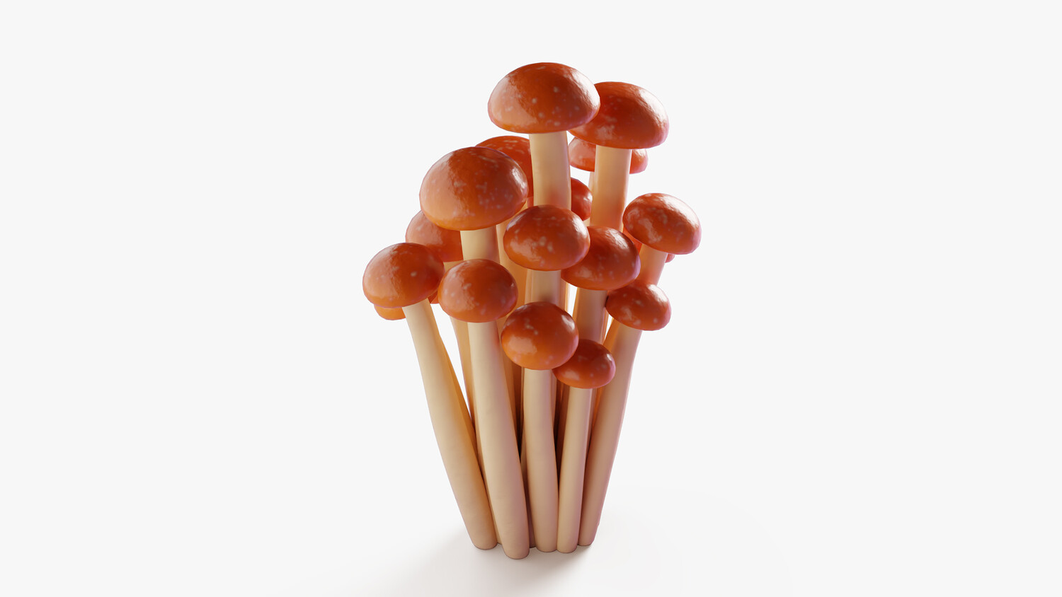 Stylized cartoon 3D model of honey mushrooms as a clustered bunch with long slender stems and small rounded caps in warm amber tones. The glossy finish and soft gradients create a clean, friendly look with a strong readable silhouette, ideal for stylized projects. Perfect for games and mobile apps as a forest prop, crafting ingredient, collectible item, or kitchen and market decoration. Use it in autumn and woodland scenes, cozy cabins, fantasy biomes, farms, grocery environments, restaurant visuals, and food themed renders. The tall cluster shape works great in thumbnails and UI presentation, and it can be scaled, duplicated, or combined with other fungi to build mushroom patches and ground scatter. Suitable for close ups and background placement, with smooth shading that responds nicely to different lighting setups. Great for dioramas, animations, educational content about fungi, product mockups, and AR/VR scenes where you need simple shapes without heavy realism.