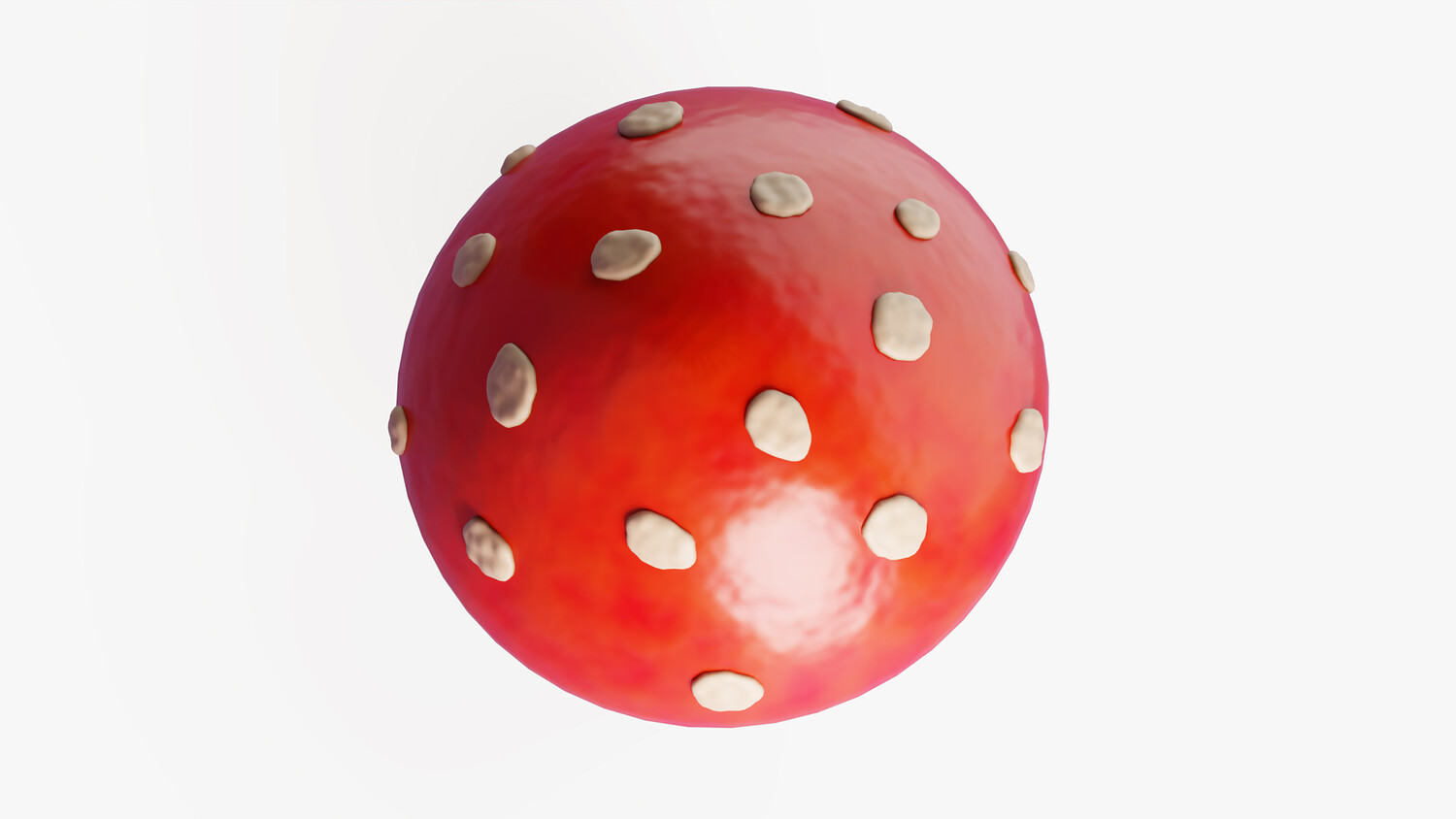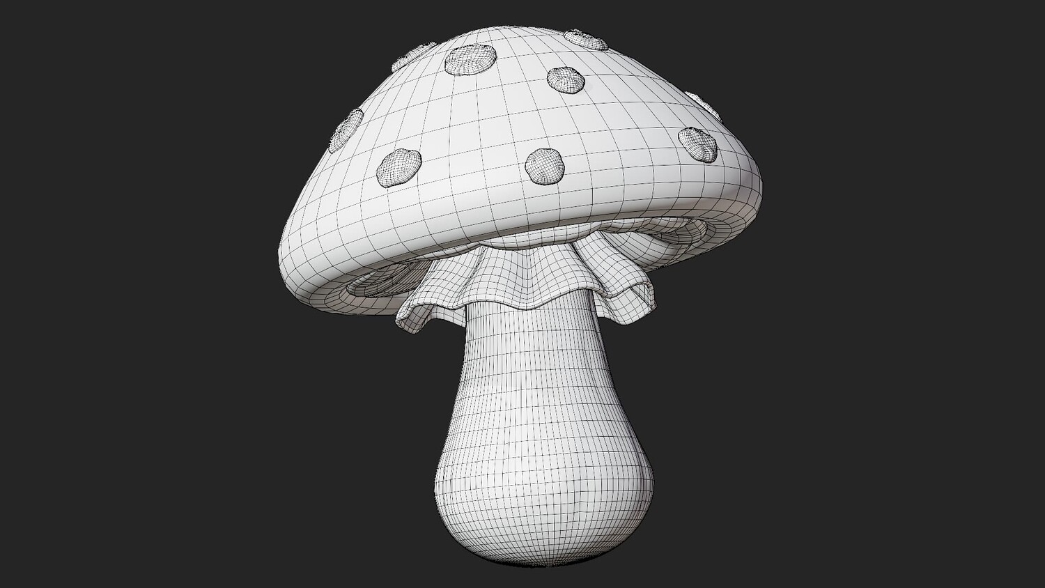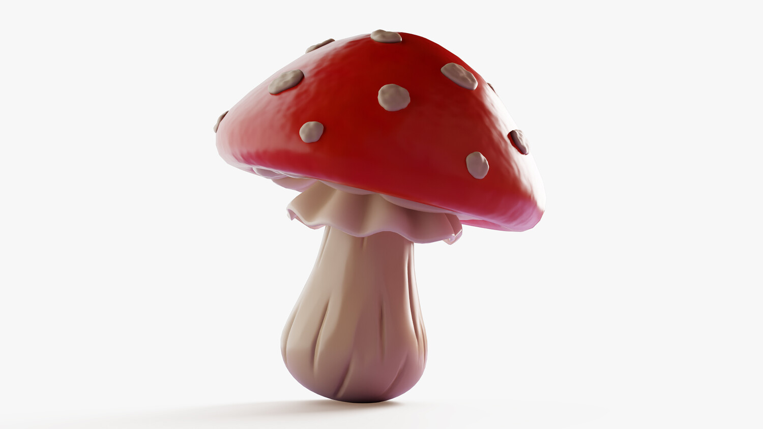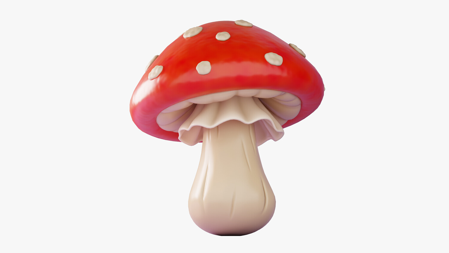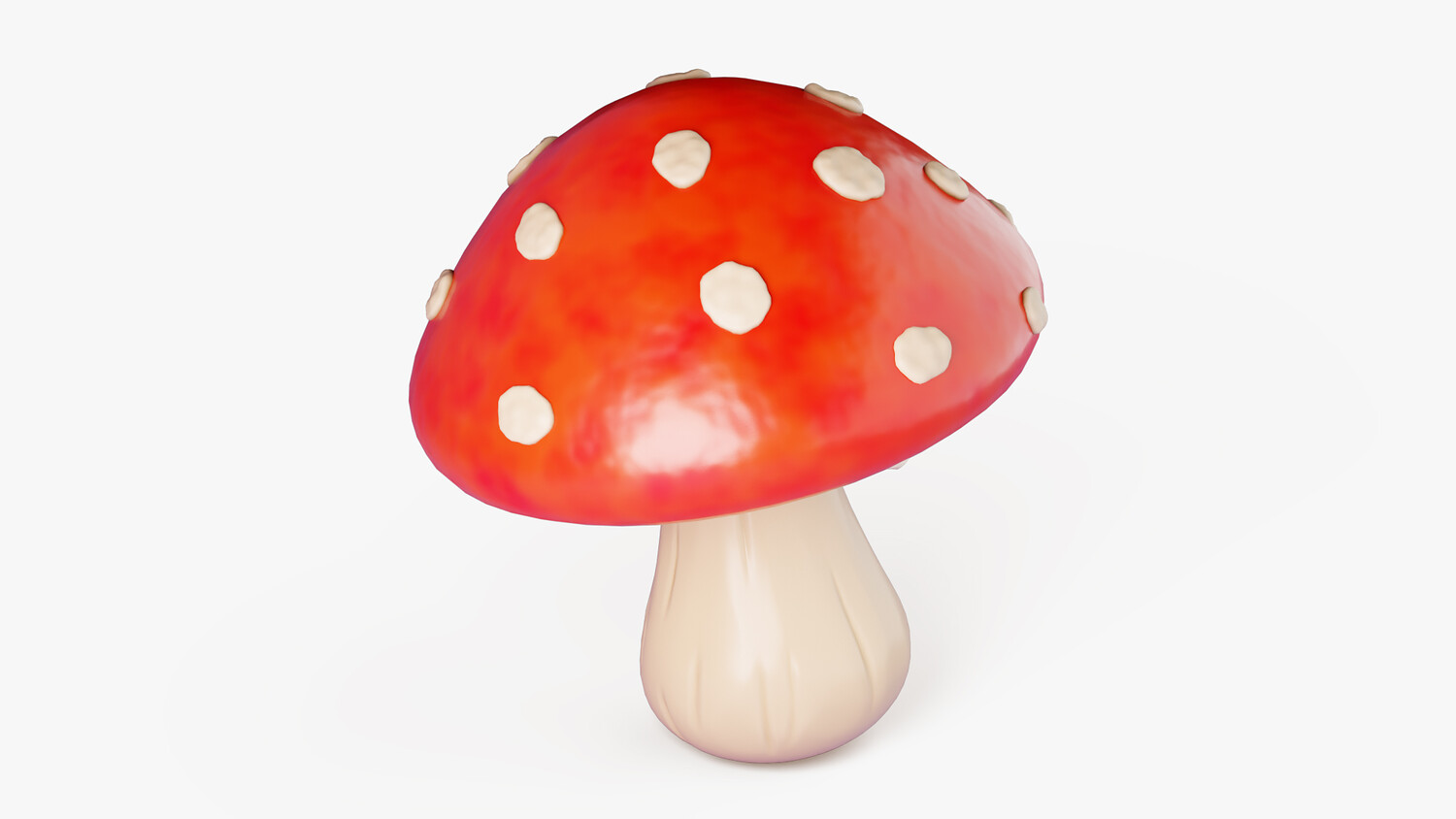 Stylized cartoon 3D model of a fly agaric mushroom (amanita muscaria) with a bright red cap and classic white spots. The glossy shading and smooth gradients create a clean, readable look, while the soft stem and decorative ring under the cap add recognizable detail. Perfect for fantasy and fairy tale scenes, forest environments, magical props, collectibles, and UI icon style renders. Use it in games and mobile projects as a pickup item, potion ingredient, quest object, or decorative set dressing for cozy woods, witch huts, and enchanted biomes. The strong silhouette and high contrast colors work great in thumbnails, menus, and educational visuals about fungi. Easy to scale and combine with other mushrooms to build clusters and ground scatter. Suitable for dioramas, animations, product mockups, and AR/VR scenes where you need a friendly toon style without heavy realism.