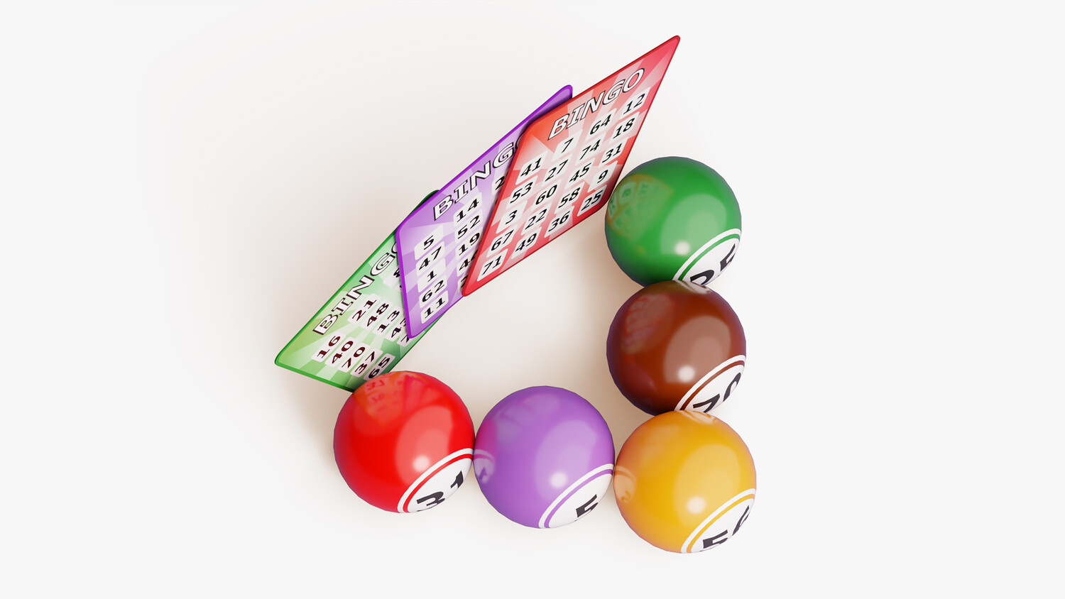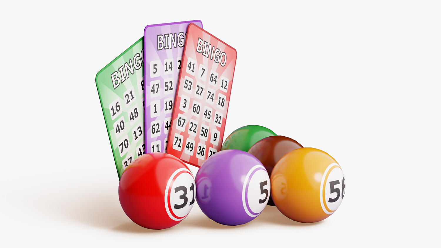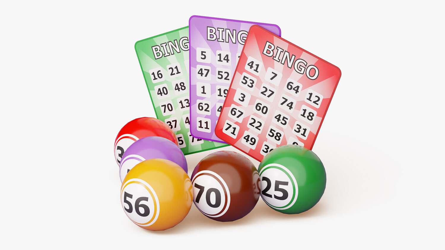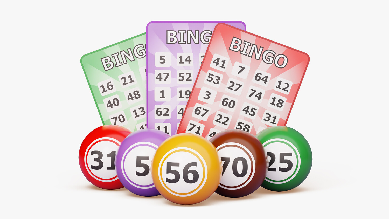 Bright bingo scene with three fan-out cards and five numbered balls staged up front for instant readability and strong thumbnail impact. Clean typography, vivid color blocks, and a balanced layout make the numbers easy to scan, while the white background keeps the composition simple to place in any design. Use it for casino or lottery themes, event flyers, stream overlays, mobile UI mockups, promo banners, landing pages, newsletters, or social posts about prize draws and community game nights. The playful palette suggests fun and accessibility without skewing to any brand, so it works for charity events, club promotions, classroom activities, or entertainment apps alike. The foreground balls (31, 5, 56, 70, 25) add depth and a focal point, while the staggered cards provide space for copy and logos. Ideal wherever you need clear “bingo” storytelling, luck, excitement, and anticipation at a glance.