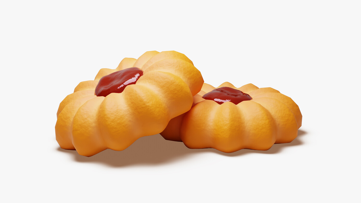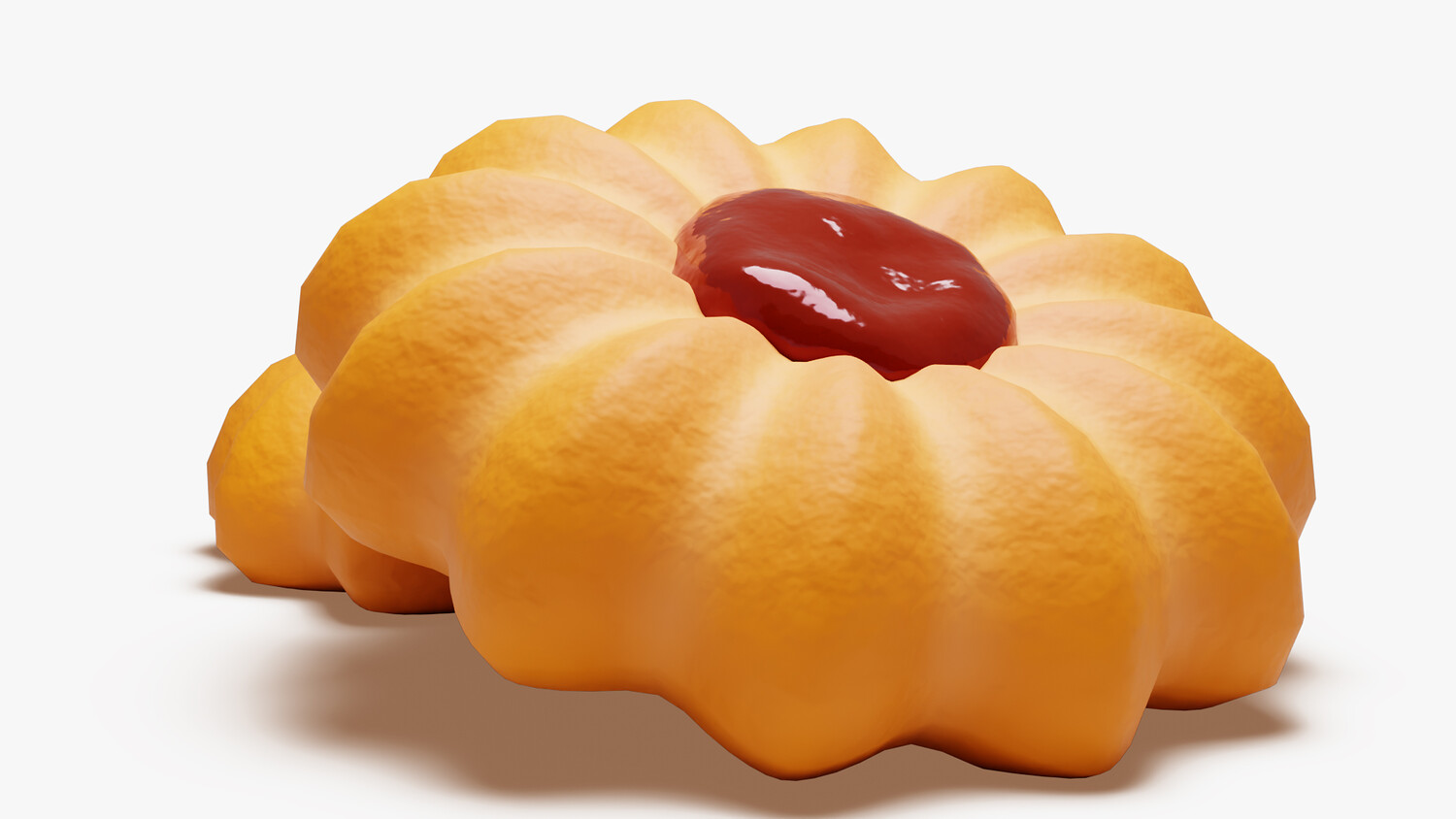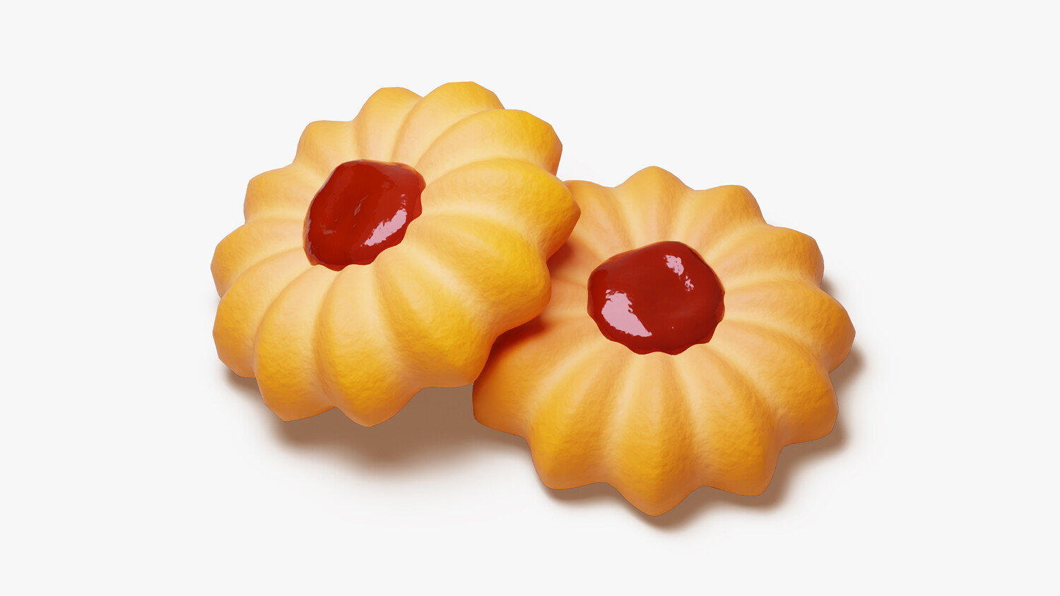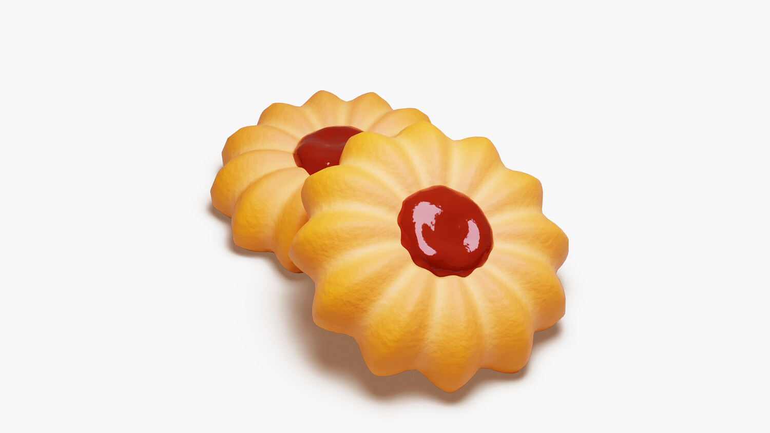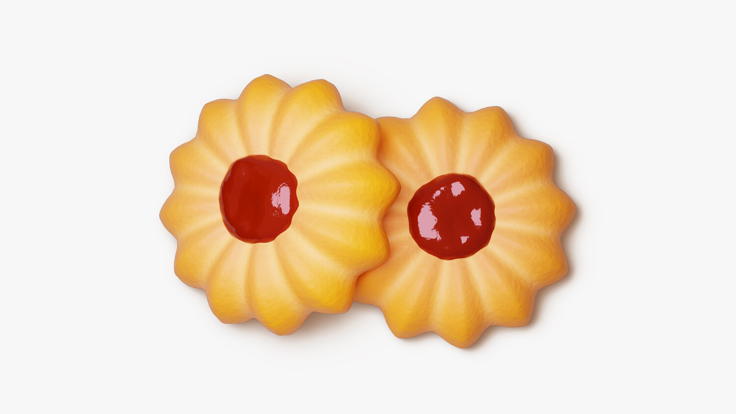 A bright, stylized butter cookie shaped like a soft flower with deep, even ridges. The golden shortbread holds a glossy red jam dollop at the center, suggesting strawberry or raspberry. Subtle crumb texture, rounded edges, and gentle highlights give a fresh-baked look that reads clearly in closeups and thumbnails. The warm biscuit tone contrasts crisply with the saturated filling, keeping the silhouette tidy and appetizing.