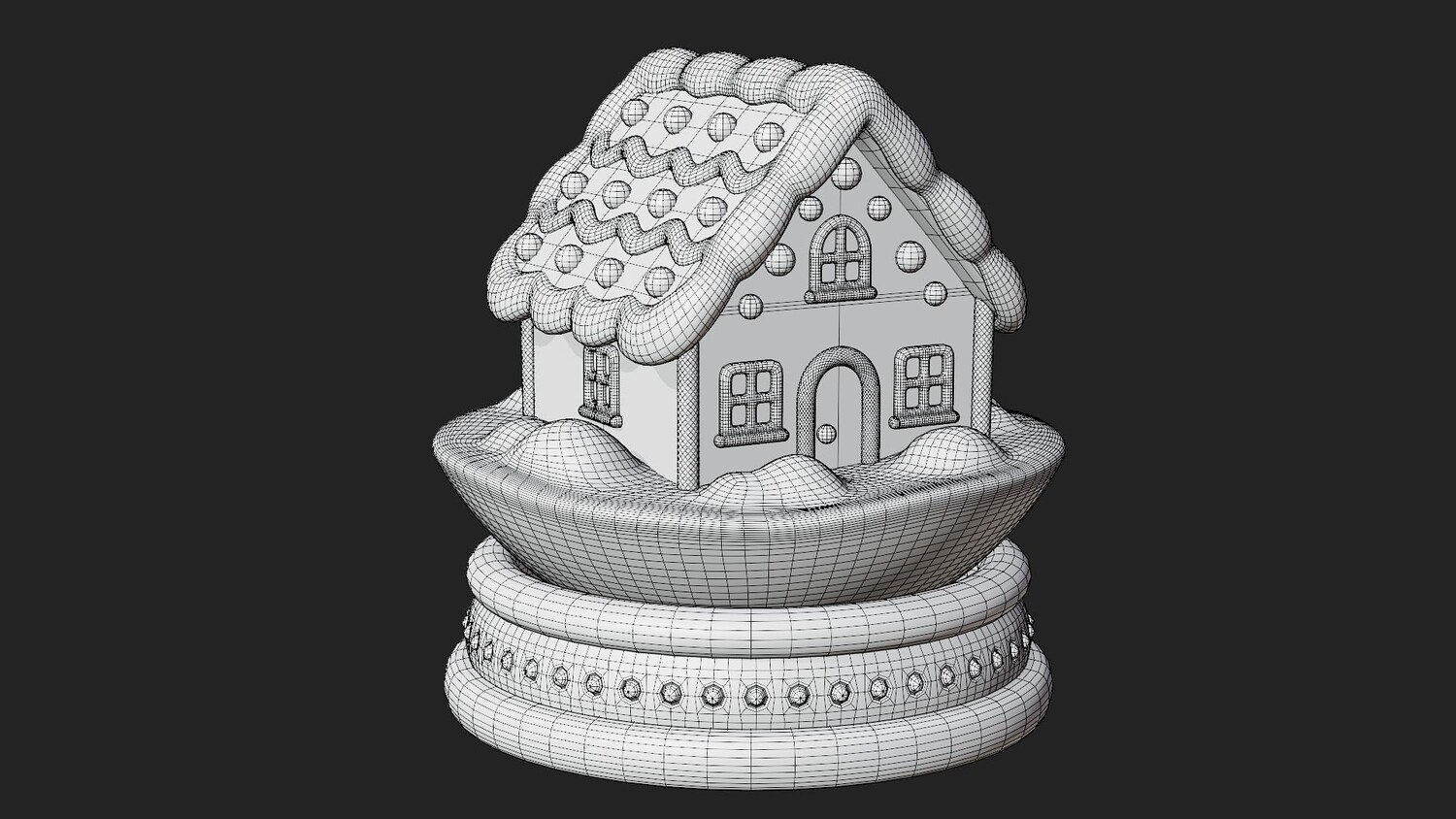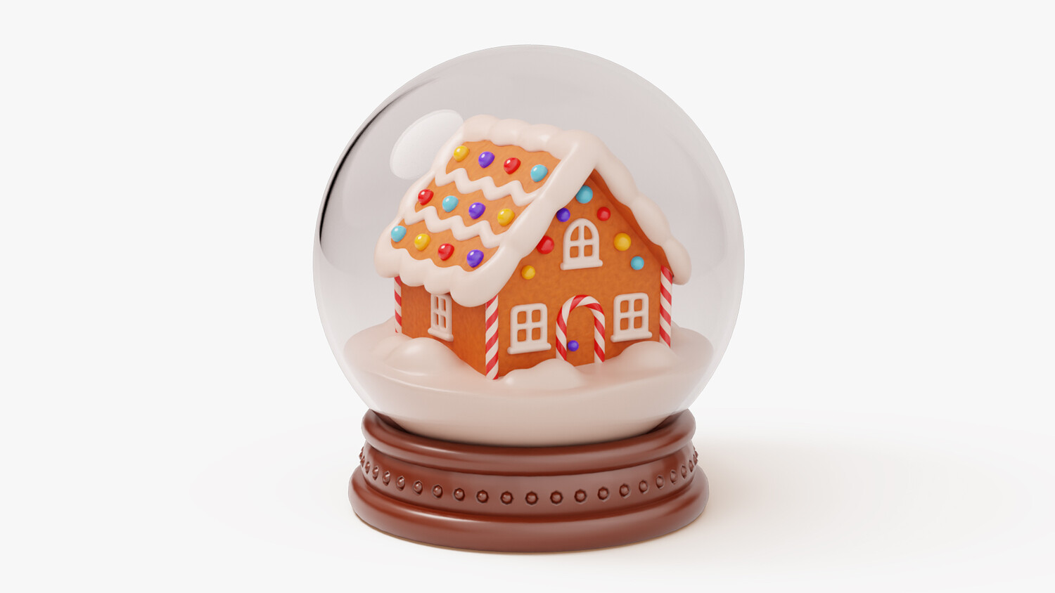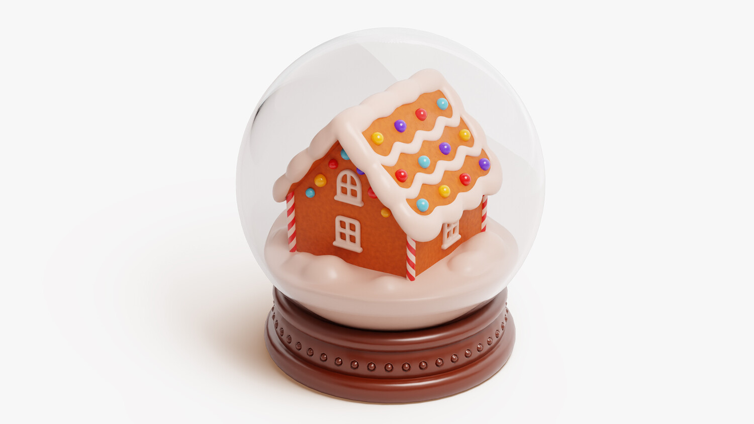 A charming holiday snow globe featuring a glossy clear dome on a neat, studded wooden-style base. Inside sits a cozy gingerbread house with piped white icing, striped candy-cane pillars, and a zigzag roof dotted with bright gumdrops. Soft snowdrifts surround the house, while rounded forms, clean edges, and gentle highlights create a friendly, stylized look that reads well in closeups and thumbnails. The palette balances warm cookie browns, creamy whites, and playful candy colors for instant festive appeal.