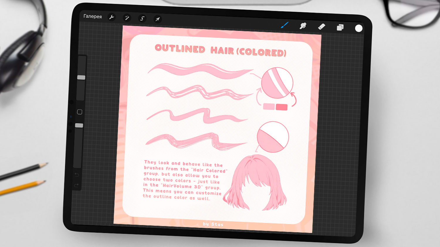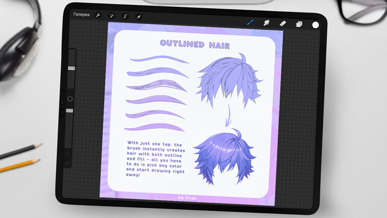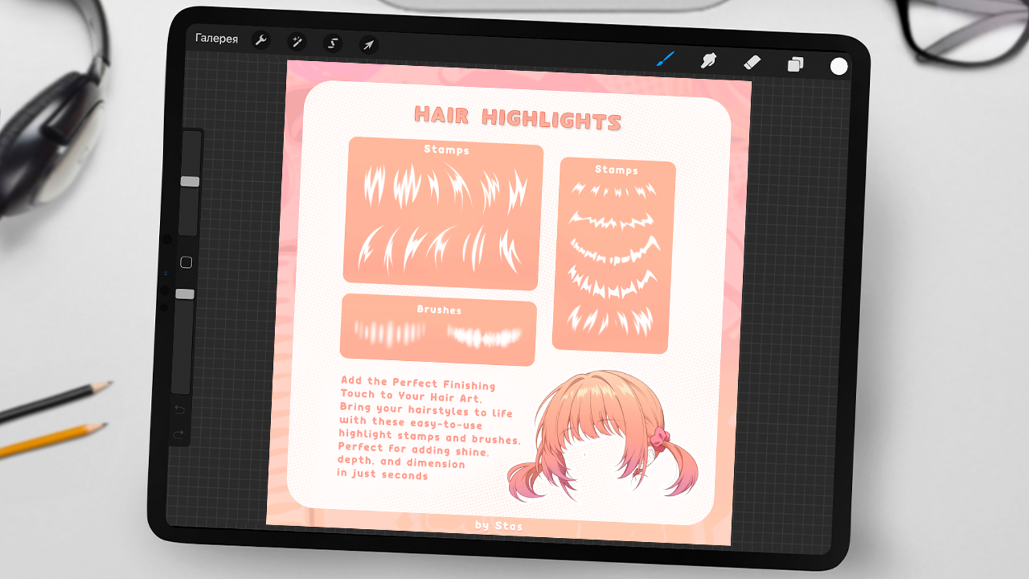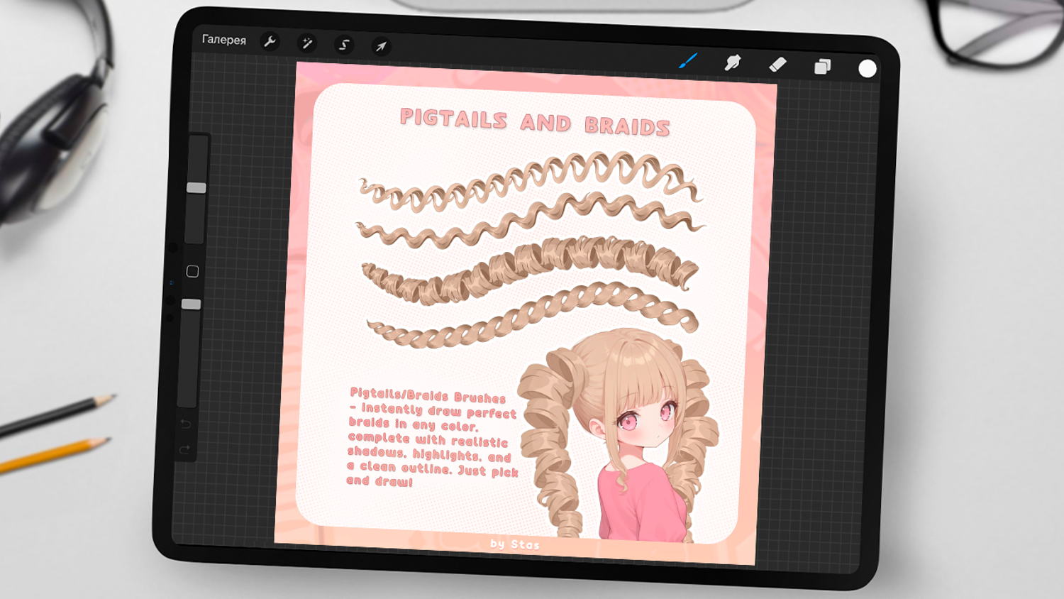 What’s inside: Outline Hair – 17 brushes, Outline Hair (Colored) – 6 brushes (outline + fill in different colors), Pigtails/Braids – 21 brushes, Pigtails/Braids Dark Version – 14 brushes, Hair Highlights – 4 brushes, 26 stamps, HairVolume 3D – 13 brushes.