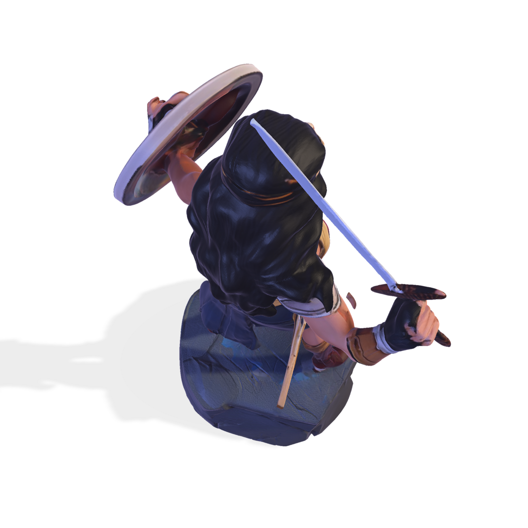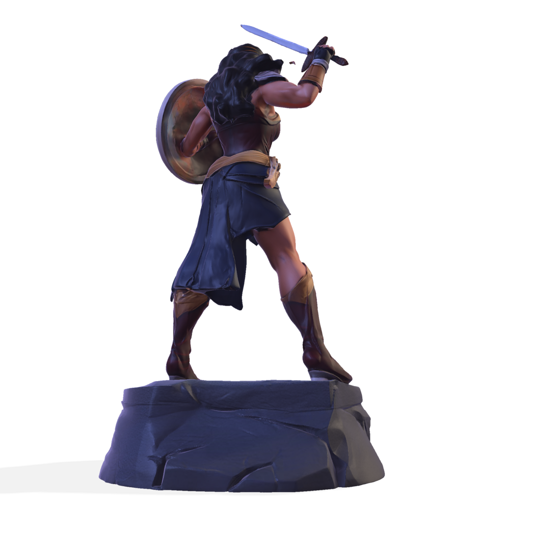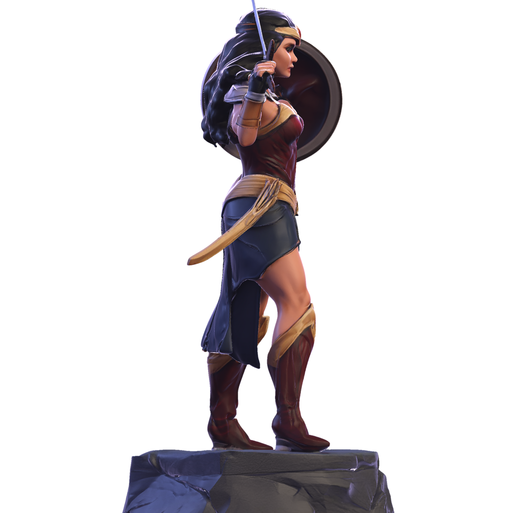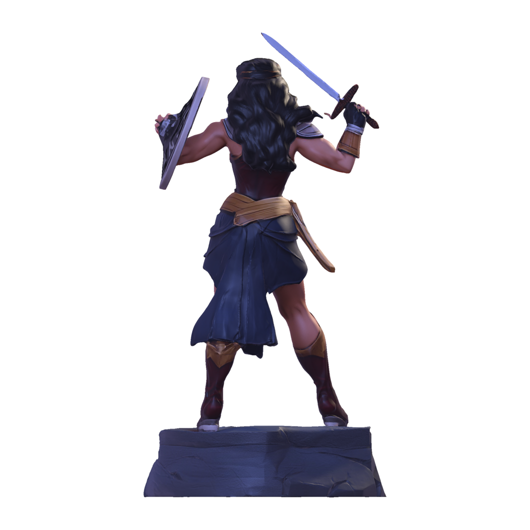 This dynamic figurine captures the essence of Wonder Woman, the iconic Amazonian warrior known for her strength, justice, and mythic heritage. Sculpted in a battle-ready pose, she stands atop a stone pedestal, wielding her sword and shield with confidence. Her red and gold armor, blue skirt, tiara, and boots are rendered with crisp, high-poly detail, ideal for resin or FDM printing.