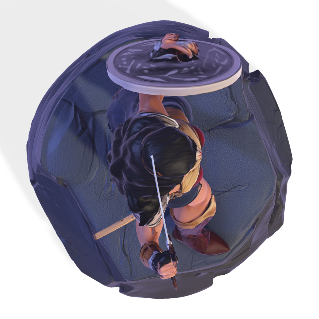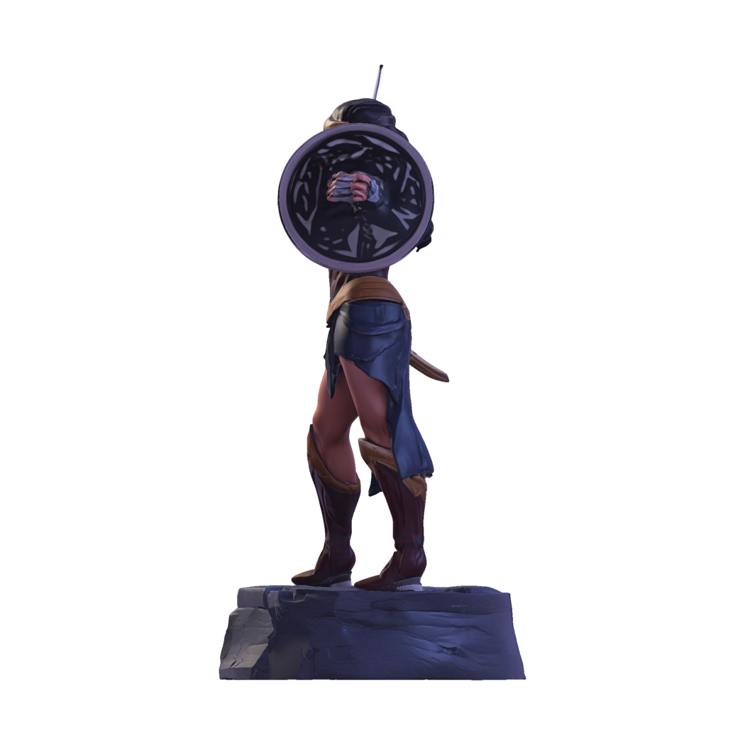 High-Poly Detail: Intricate textures on armor, shield, sword, hair, and pedestal.