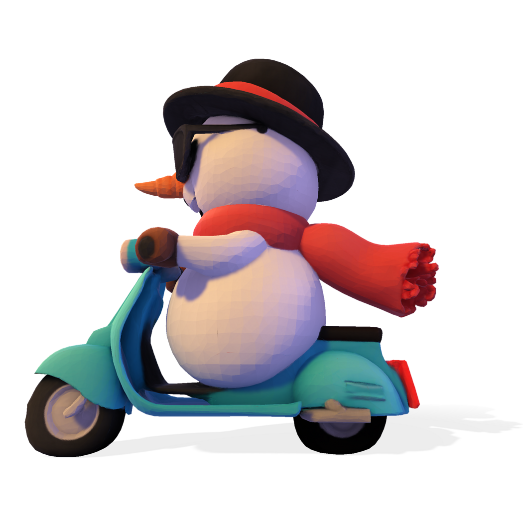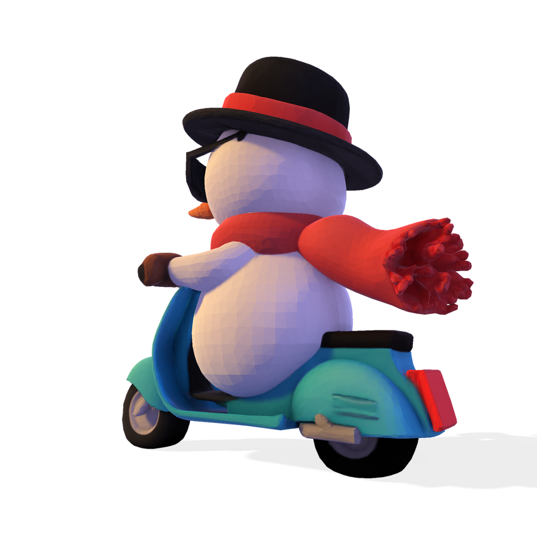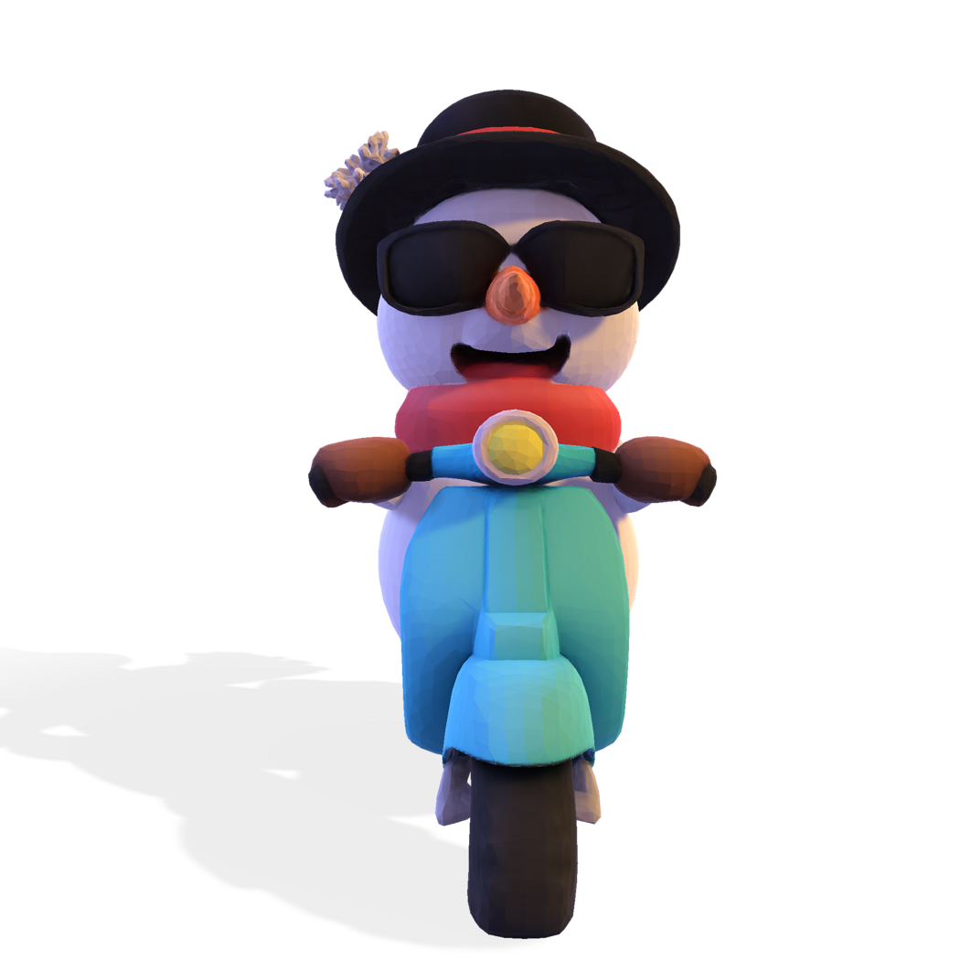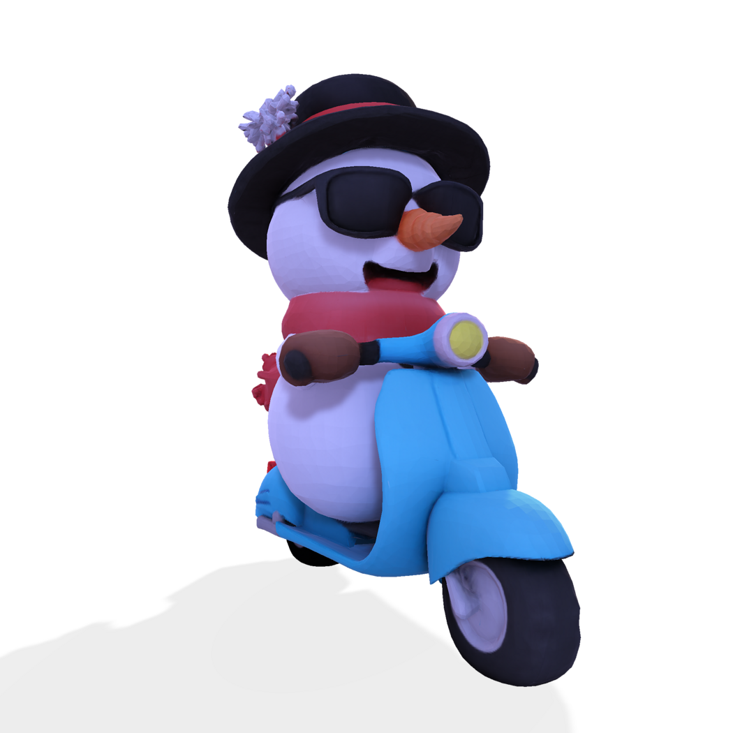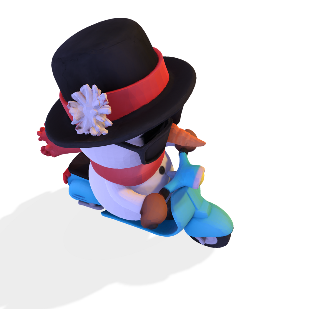 Relevant Keywords (Separated by comma): Snowman, Scooter, Vespa, Christmas, Holiday, Winter, 3D Print, Miniature, Collectible, Stylized, Cartoon, Art Toy, Festive, Vehicle, Rider, Cool, STL, FBX, GLB, Animation, Statue.