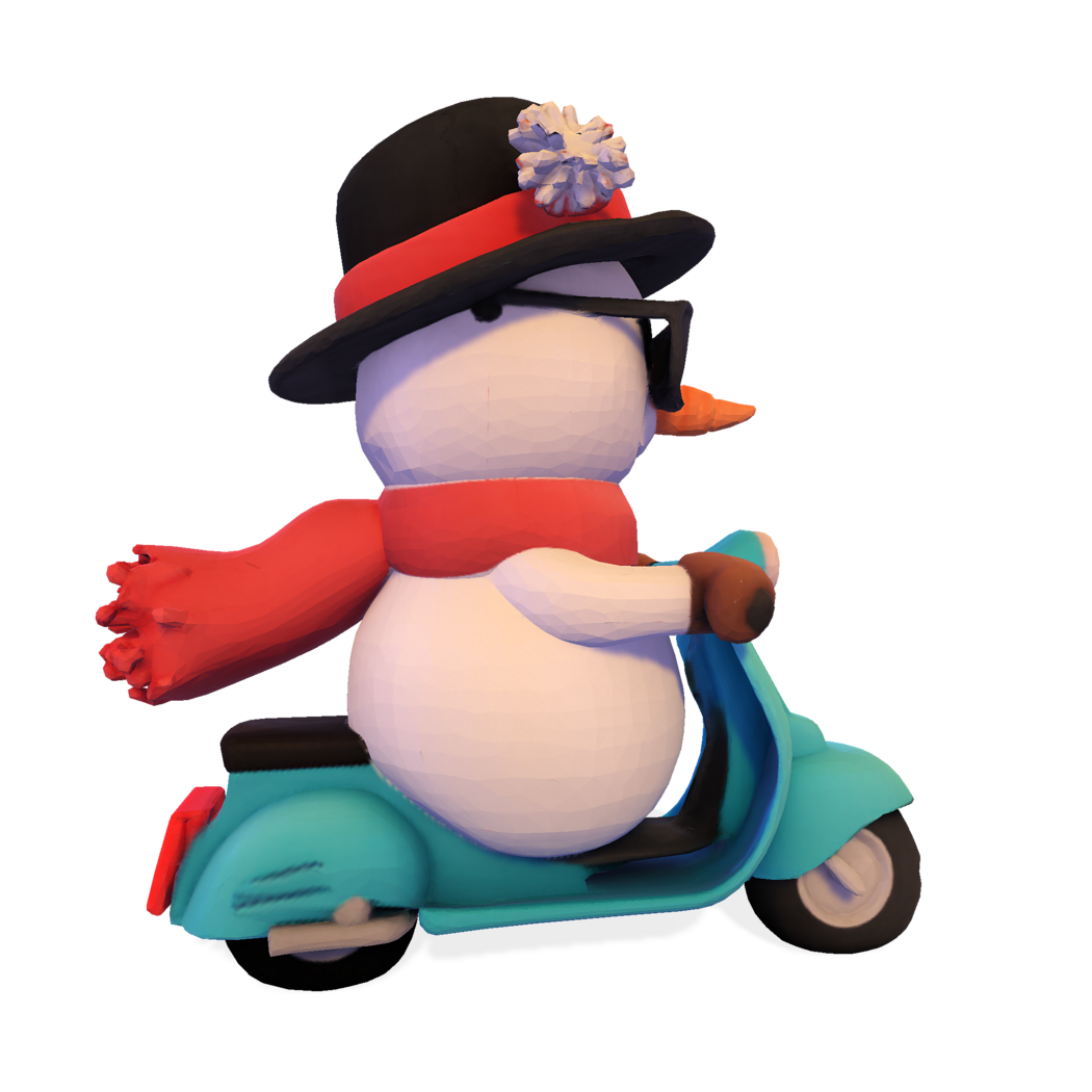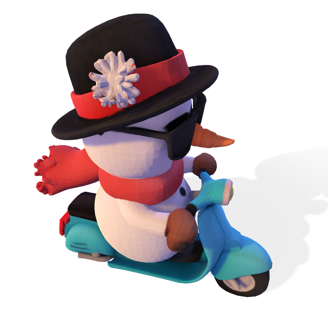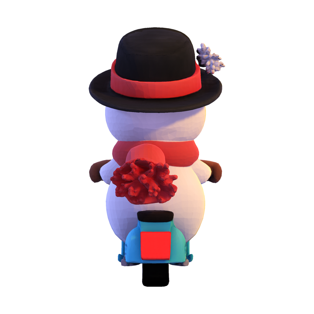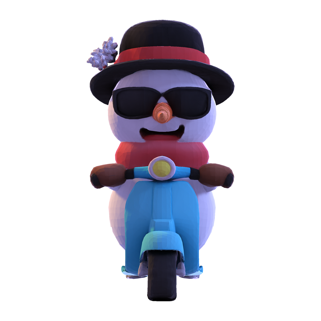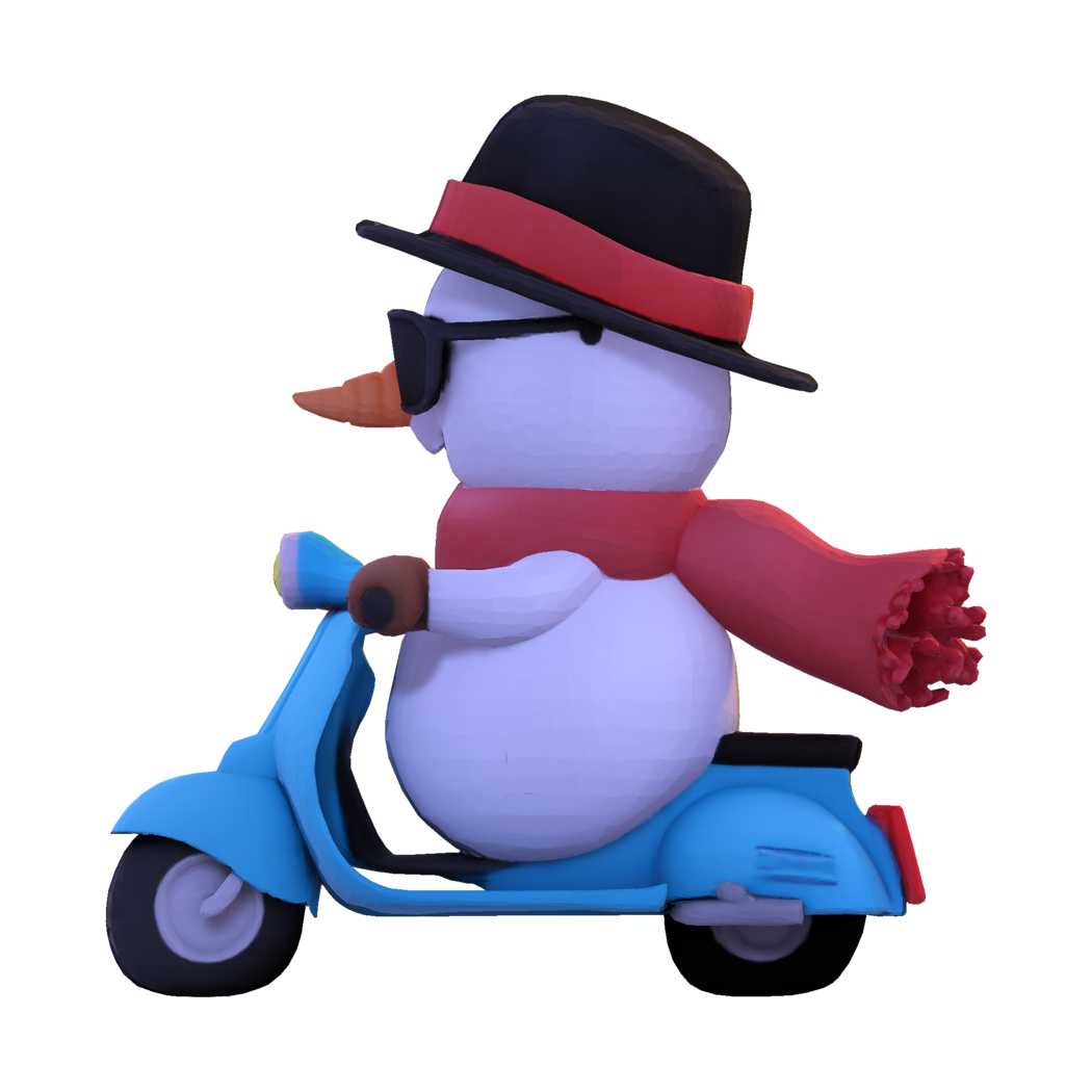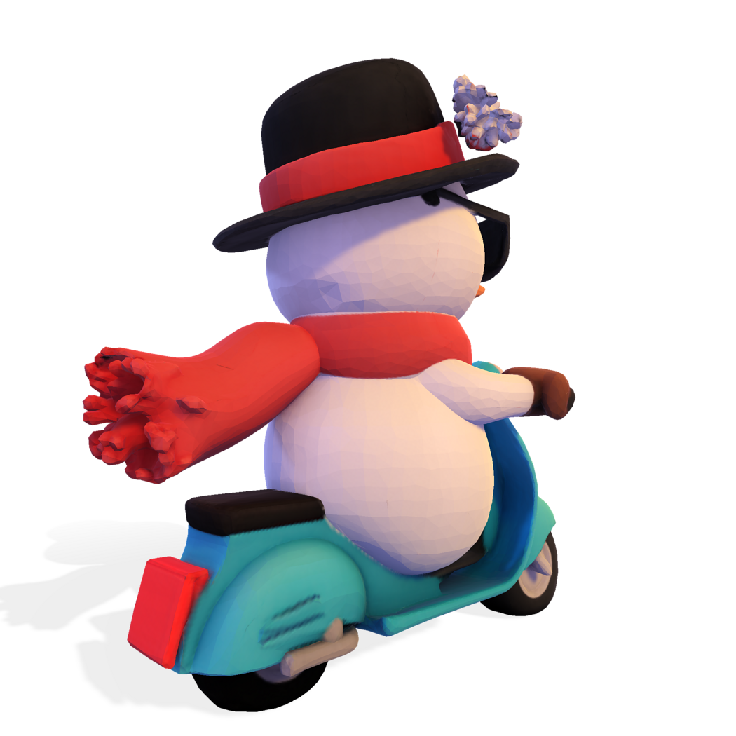 Relevant Keywords (Separated by comma): Snowman, Scooter, Vespa, Christmas, Holiday, Winter, 3D Print, Miniature, Collectible, Stylized, Cartoon, Art Toy, Festive, Vehicle, Rider, Cool, STL, FBX, GLB, Animation, Statue.