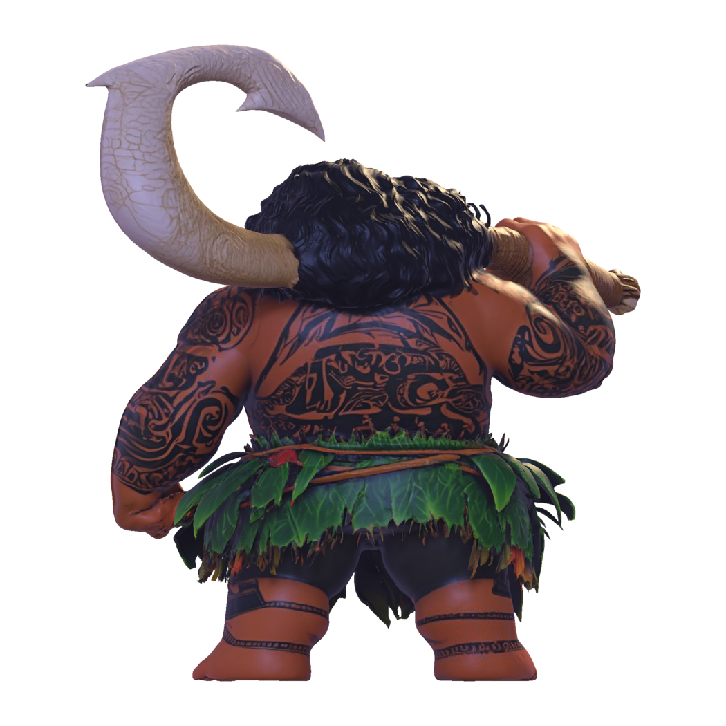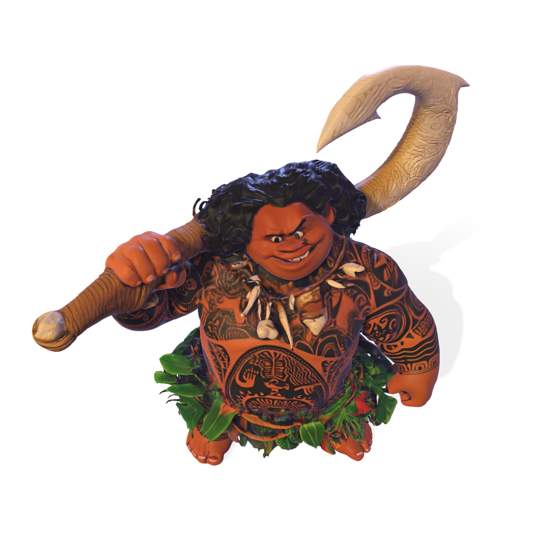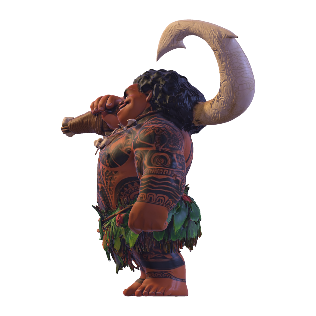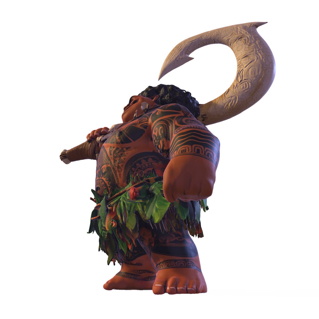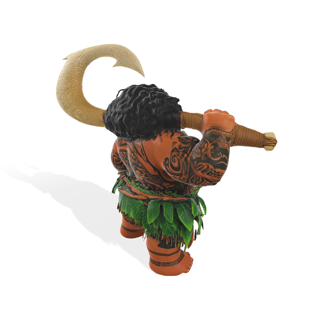 Dynamic Pose: Maui’s confident stance and raised fishhook evoke motion and mythic strength.