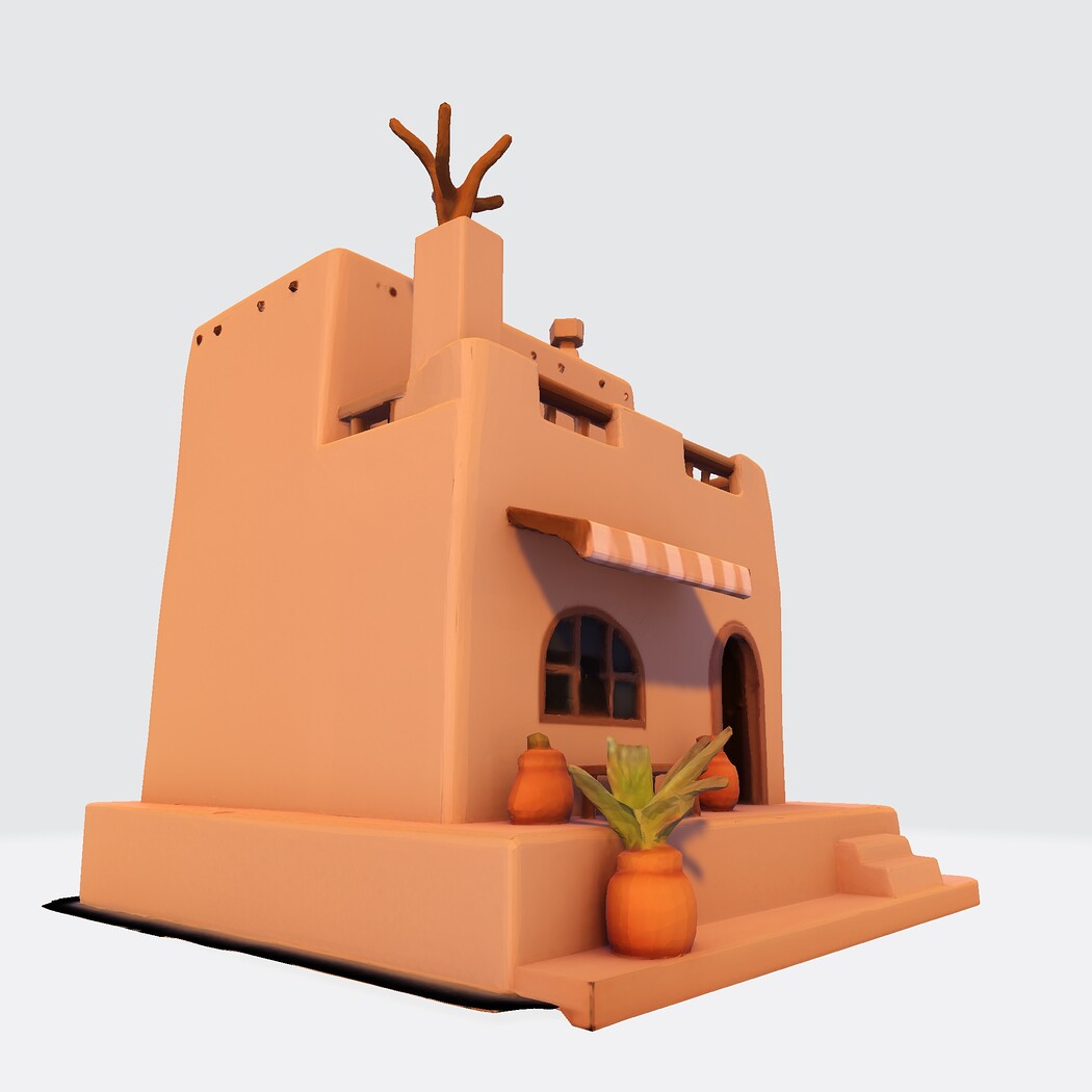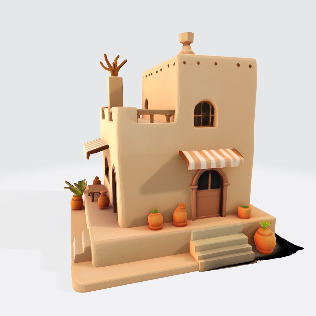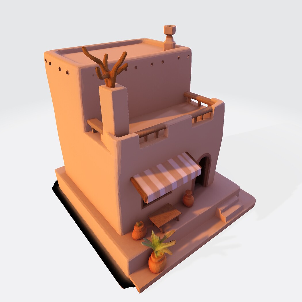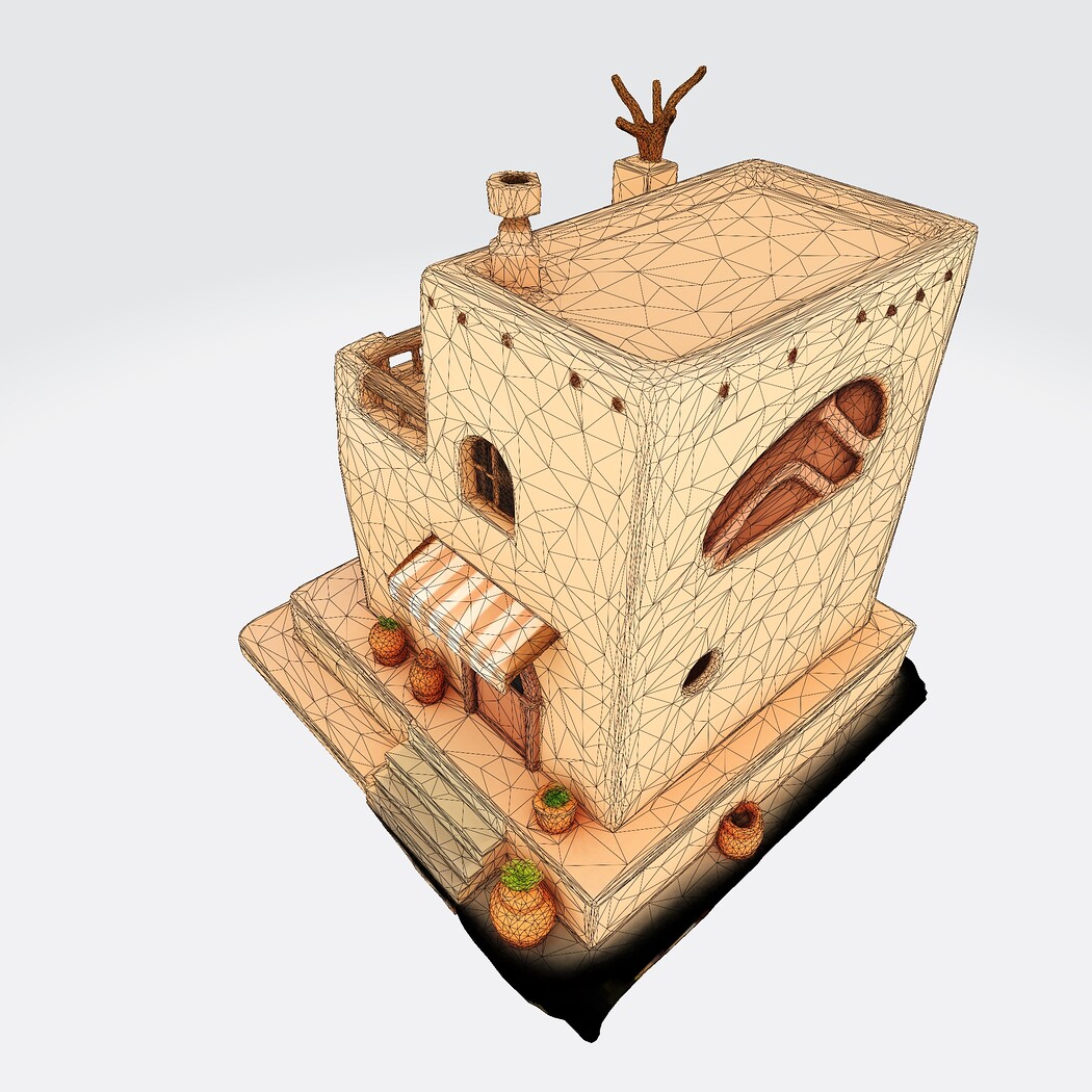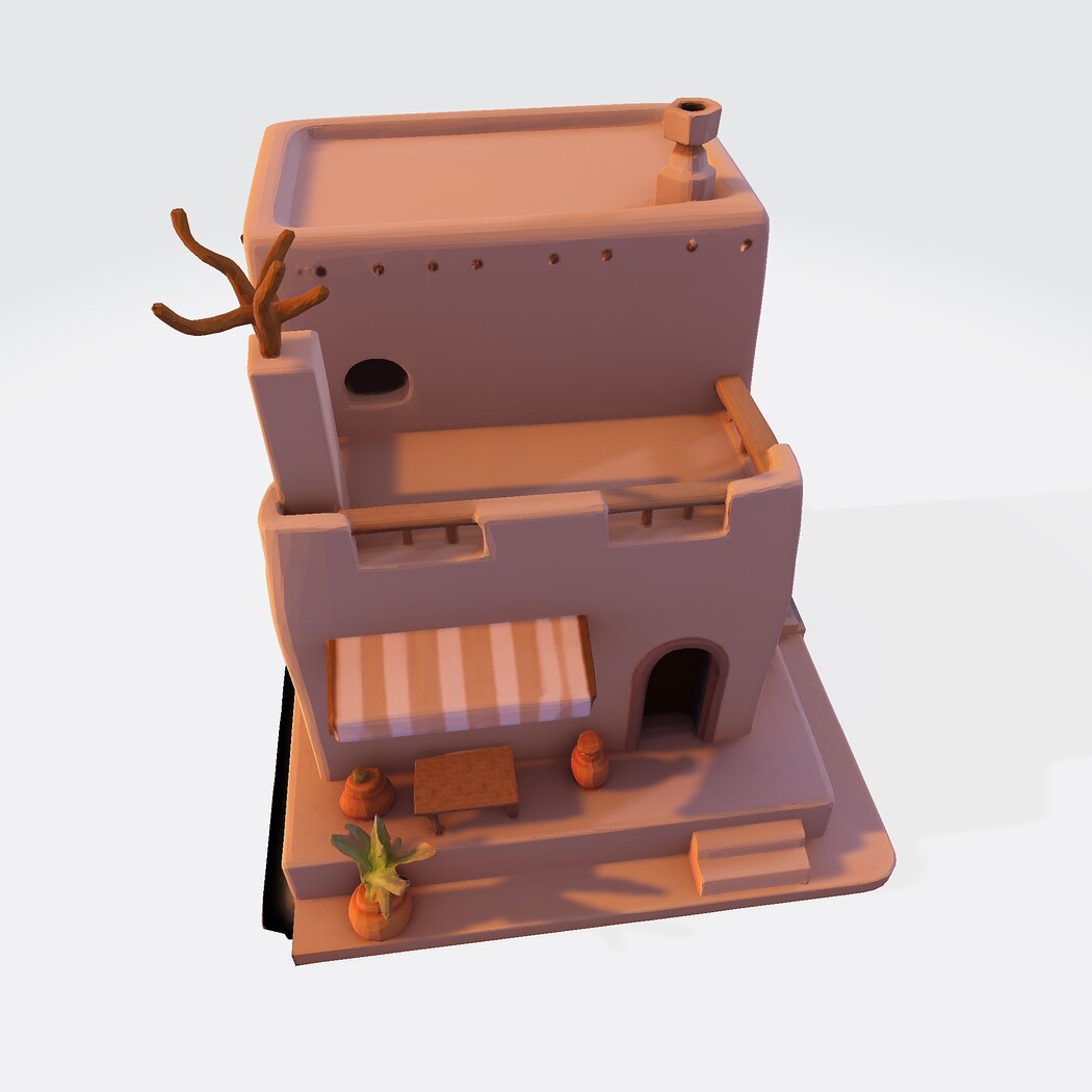 Secure Your Architectural Asset: The Versatile Low-Poly House Acquire this beautifully stylized Low-Poly Desert House model, perfectly suited for adding character to your dioramas, tabletop terrain, or game environments. This asset captures the warm, rustic aesthetic of a traditional adobe or pueblo dwelling, complete with exterior vases, steps, and a unique roof design.