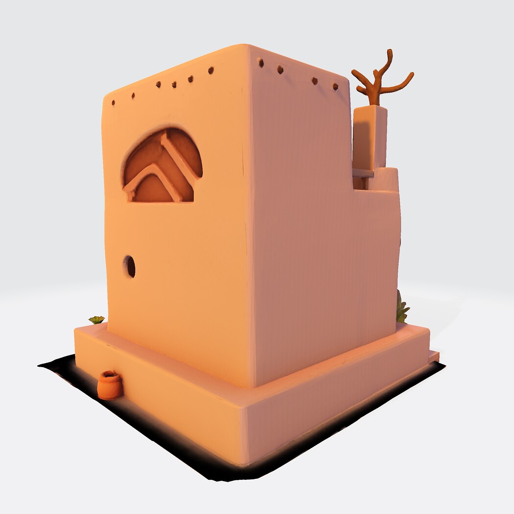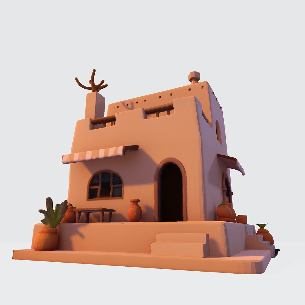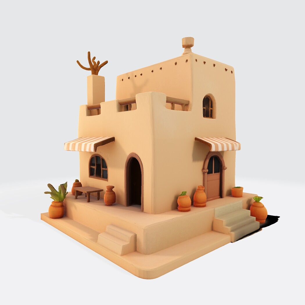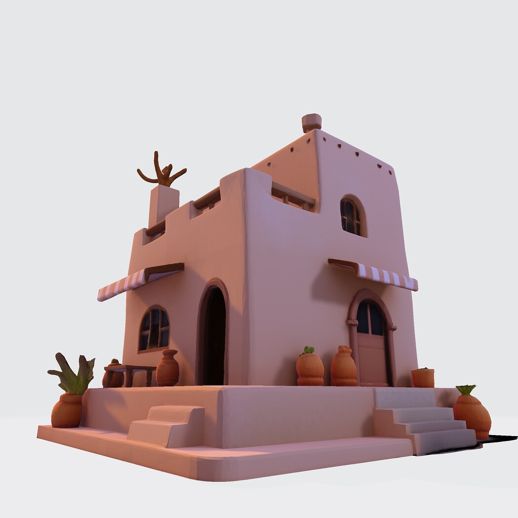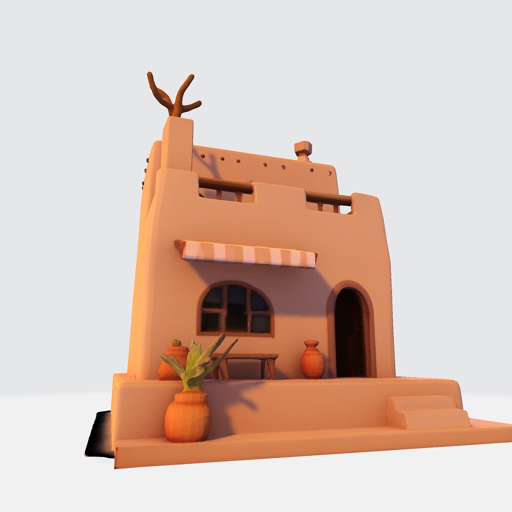 Secure Your Architectural Asset: The Versatile Low-Poly House Acquire this beautifully stylized Low-Poly Desert House model, perfectly suited for adding character to your dioramas, tabletop terrain, or game environments. This asset captures the warm, rustic aesthetic of a traditional adobe or pueblo dwelling, complete with exterior vases, steps, and a unique roof design.