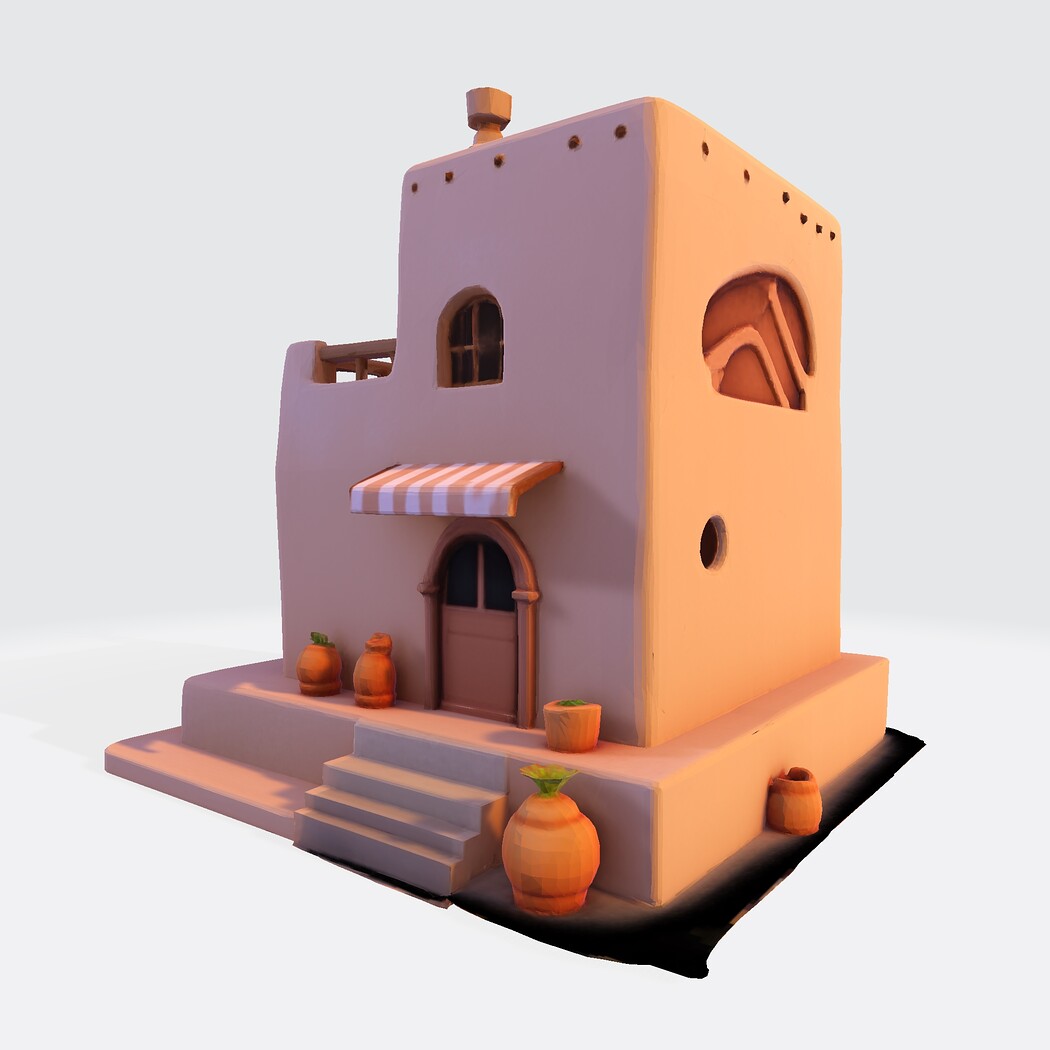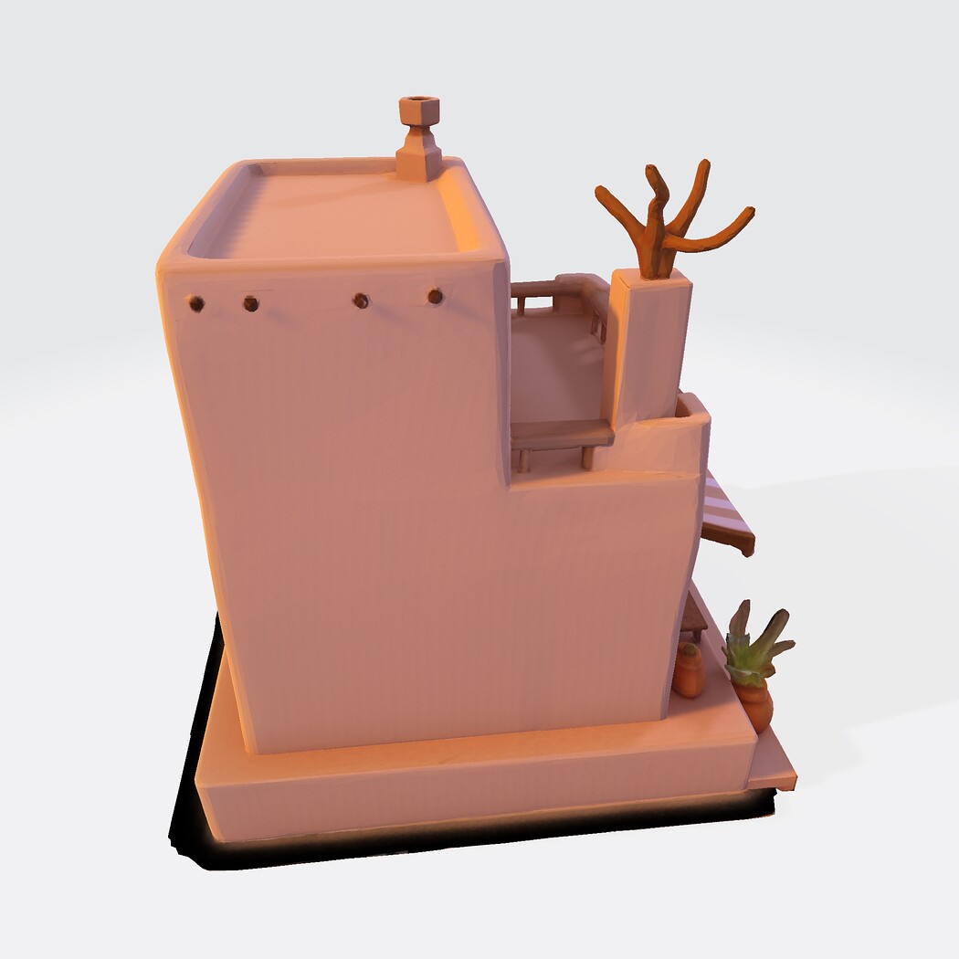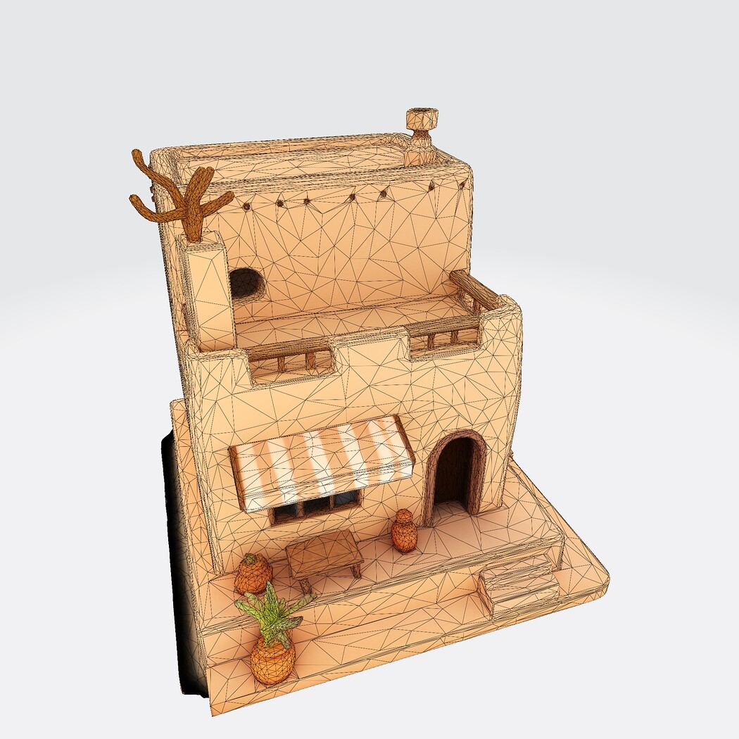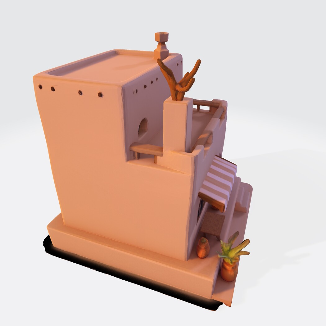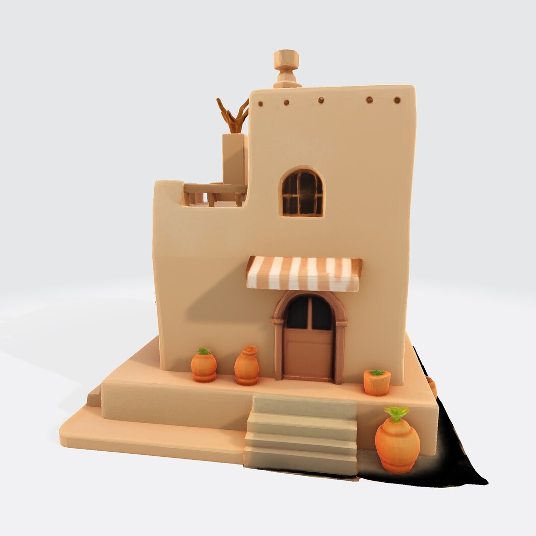 Secure Your Architectural Asset: The Versatile Low-Poly House Acquire this beautifully stylized Low-Poly Desert House model, perfectly suited for adding character to your dioramas, tabletop terrain, or game environments. This asset captures the warm, rustic aesthetic of a traditional adobe or pueblo dwelling, complete with exterior vases, steps, and a unique roof design.