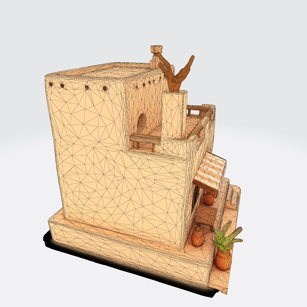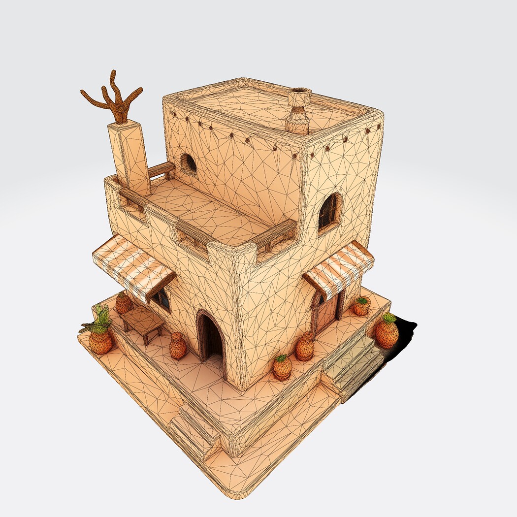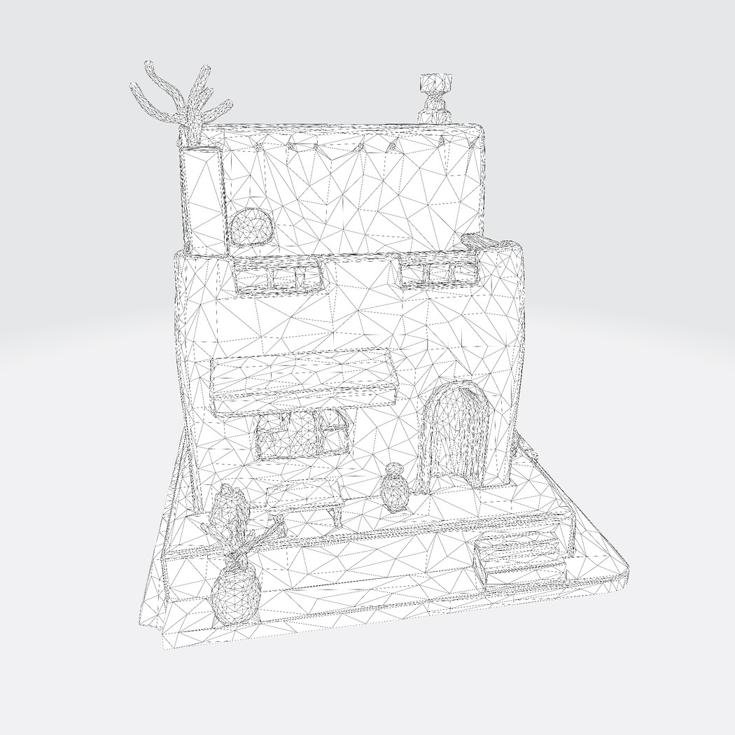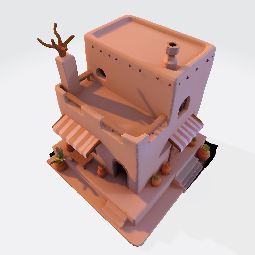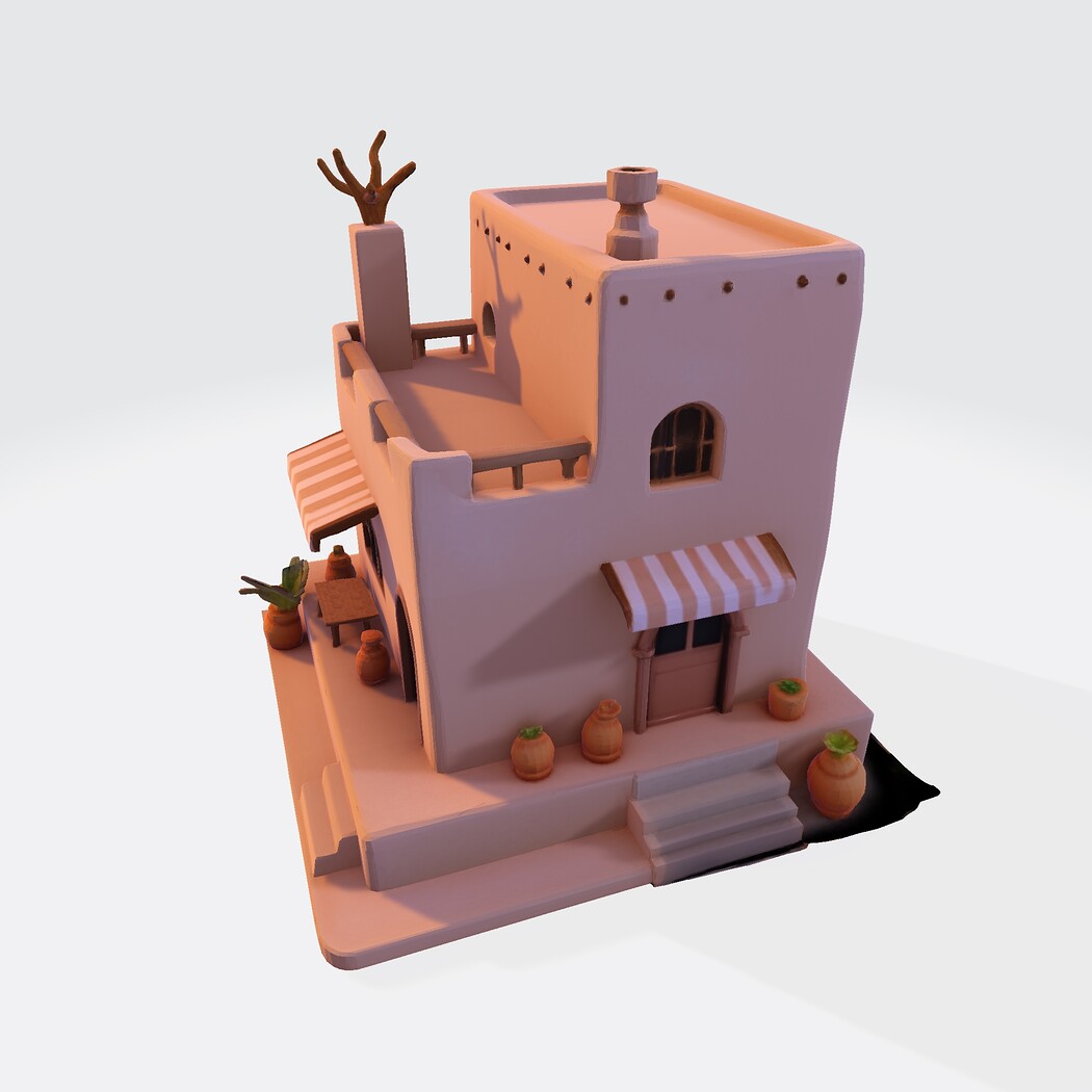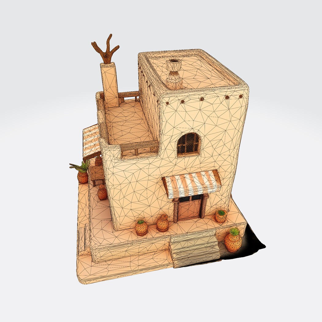 Secure Your Architectural Asset: The Versatile Low-Poly House Acquire this beautifully stylized Low-Poly Desert House model, perfectly suited for adding character to your dioramas, tabletop terrain, or game environments. This asset captures the warm, rustic aesthetic of a traditional adobe or pueblo dwelling, complete with exterior vases, steps, and a unique roof design.