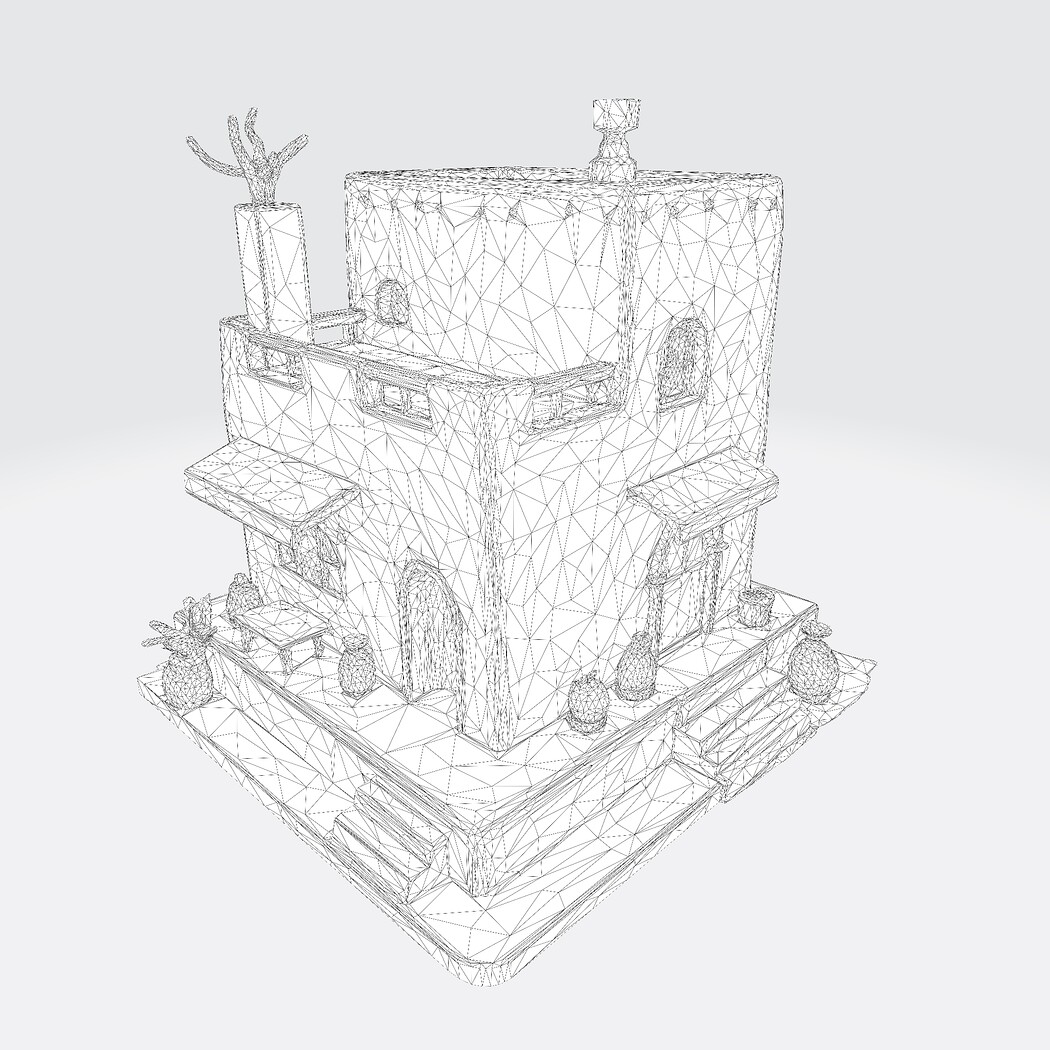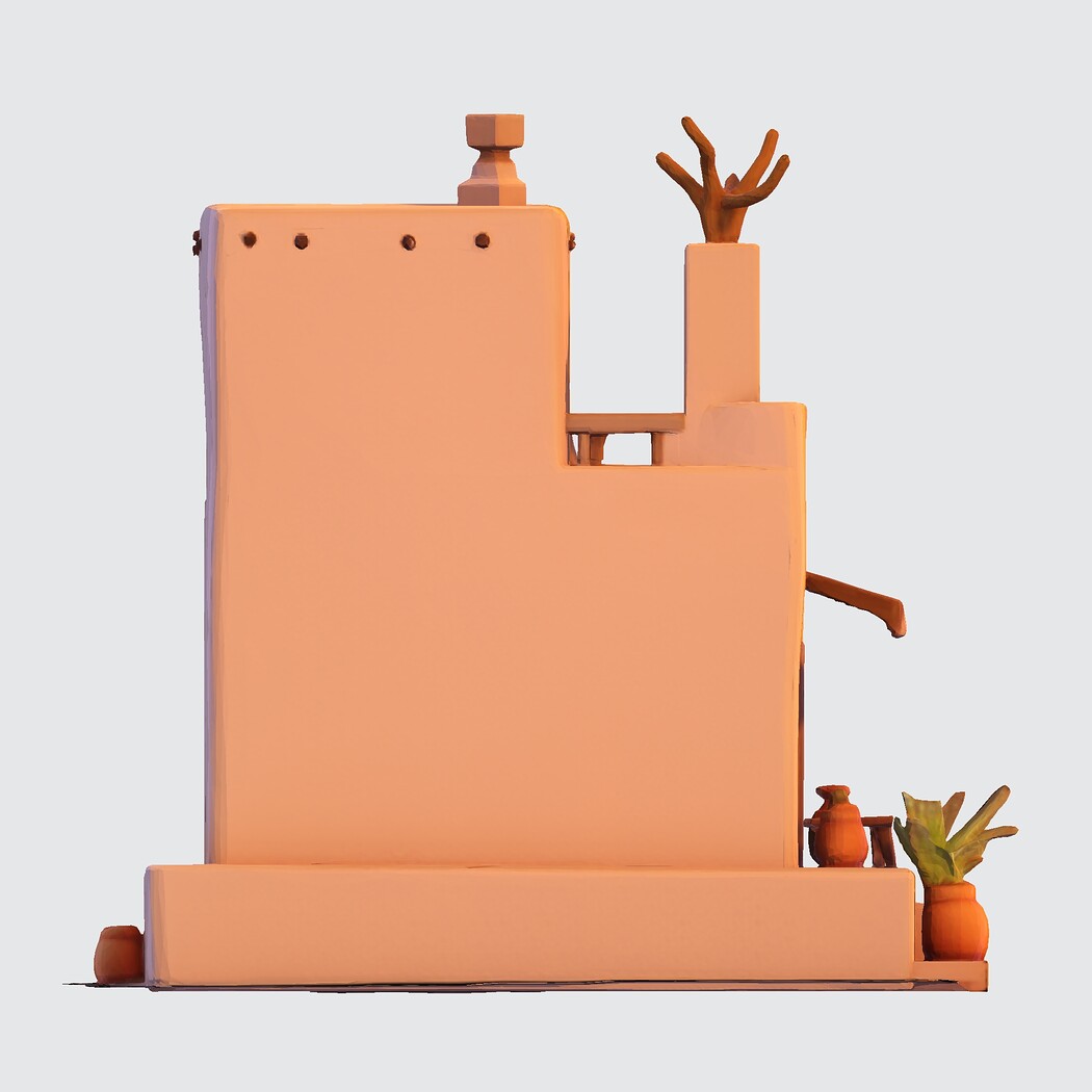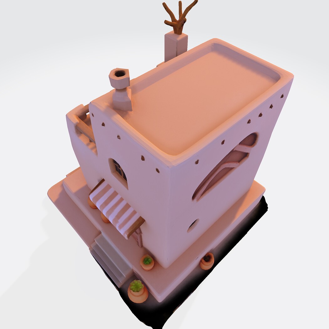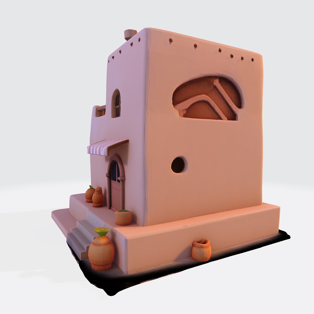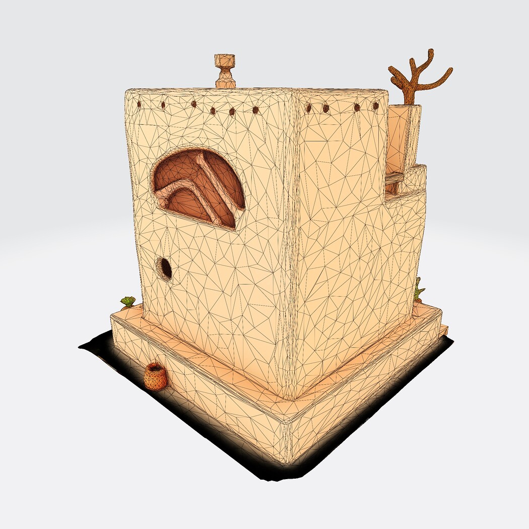 Secure Your Architectural Asset: The Versatile Low-Poly House Acquire this beautifully stylized Low-Poly Desert House model, perfectly suited for adding character to your dioramas, tabletop terrain, or game environments. This asset captures the warm, rustic aesthetic of a traditional adobe or pueblo dwelling, complete with exterior vases, steps, and a unique roof design.