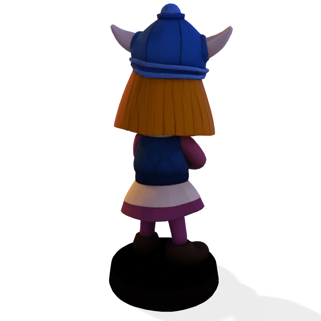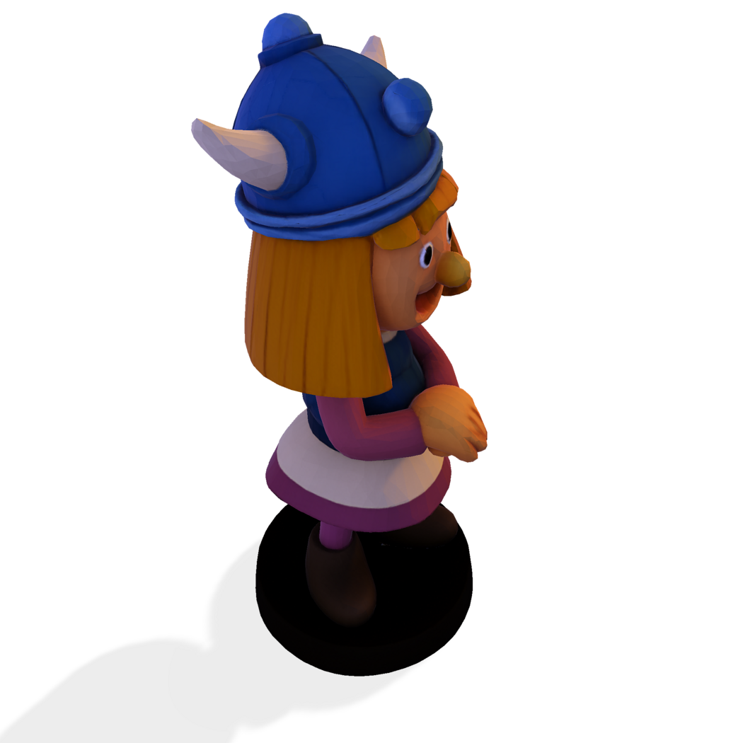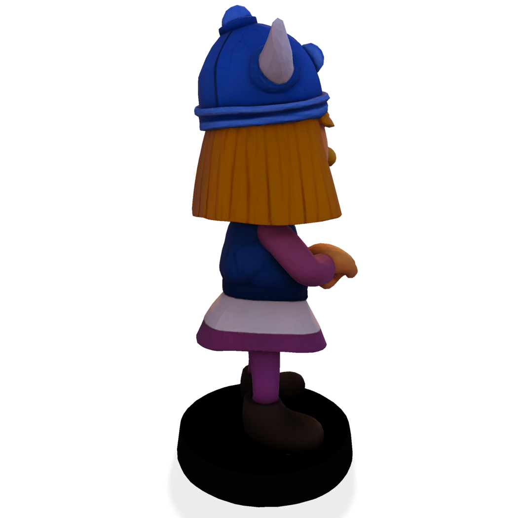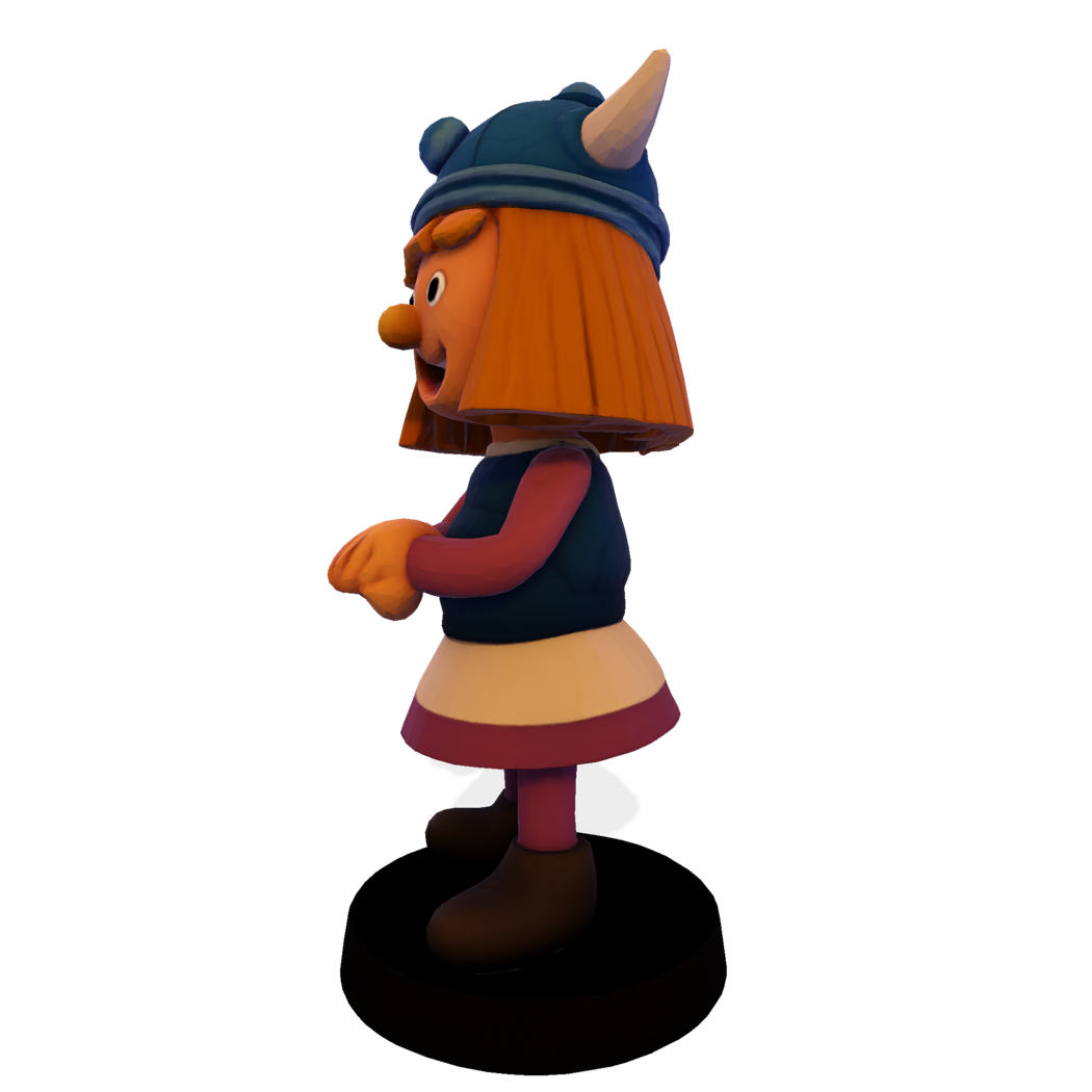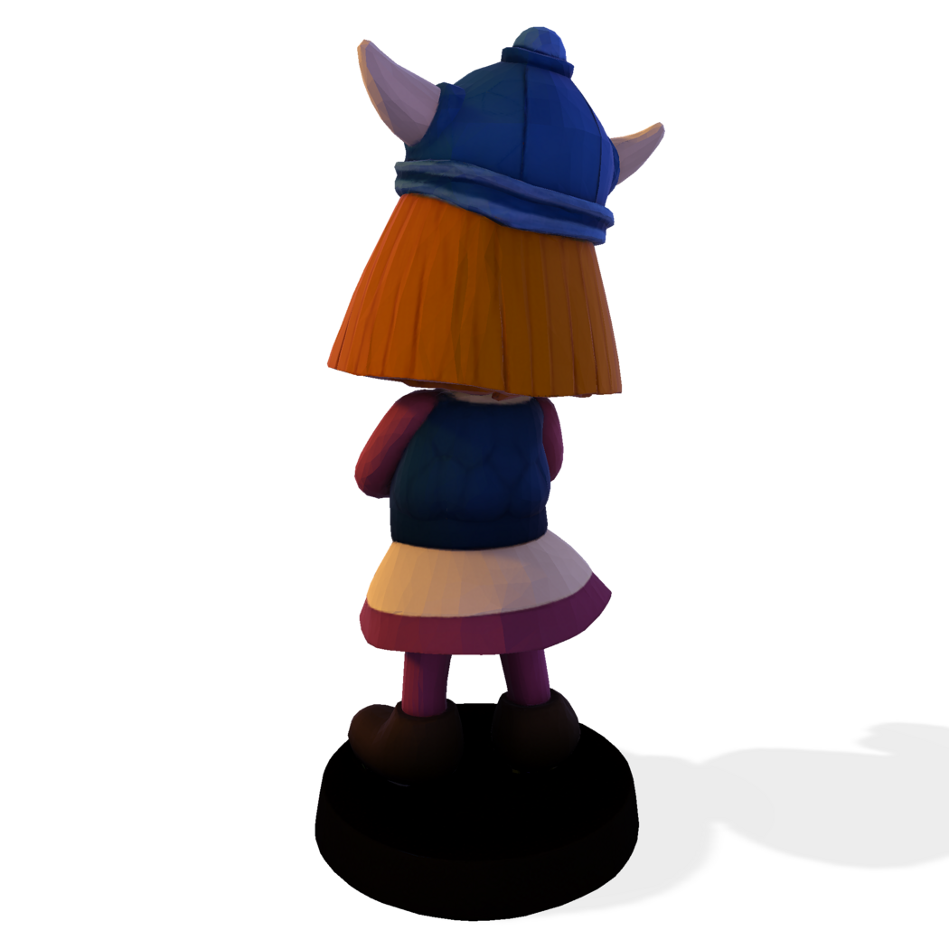 This stylized Viking girl 3D model features a cheerful character with orange hair, horned helmet, and layered clothing, standing gracefully on a black circular base. Her expressive pose, clasped hands, and cartoonish proportions make her ideal for display, fan art collections, or themed dioramas.