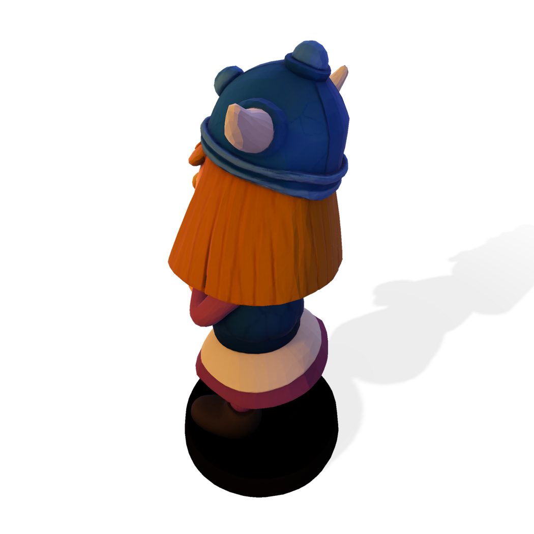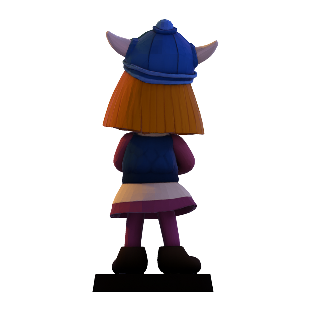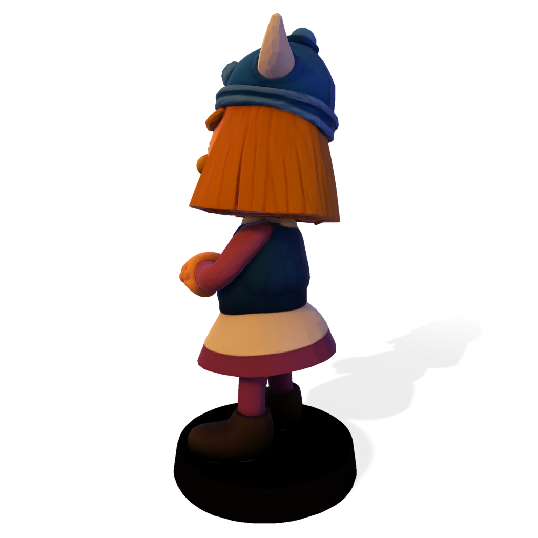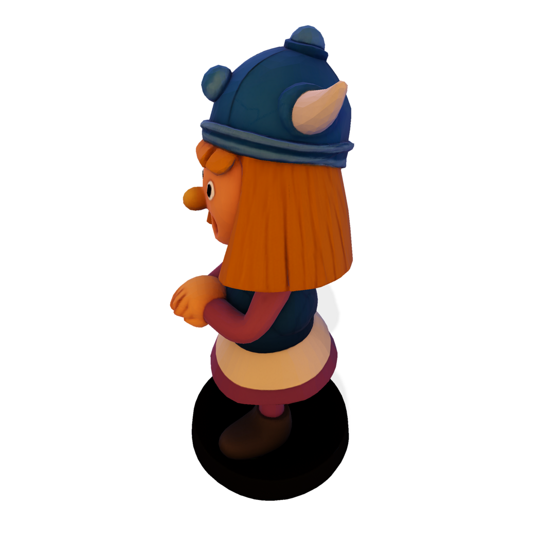 This stylized Viking girl 3D model features a cheerful character with orange hair, horned helmet, and layered clothing, standing gracefully on a black circular base. Her expressive pose, clasped hands, and cartoonish proportions make her ideal for display, fan art collections, or themed dioramas.