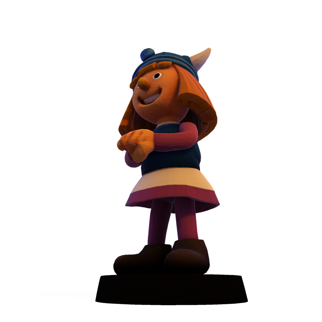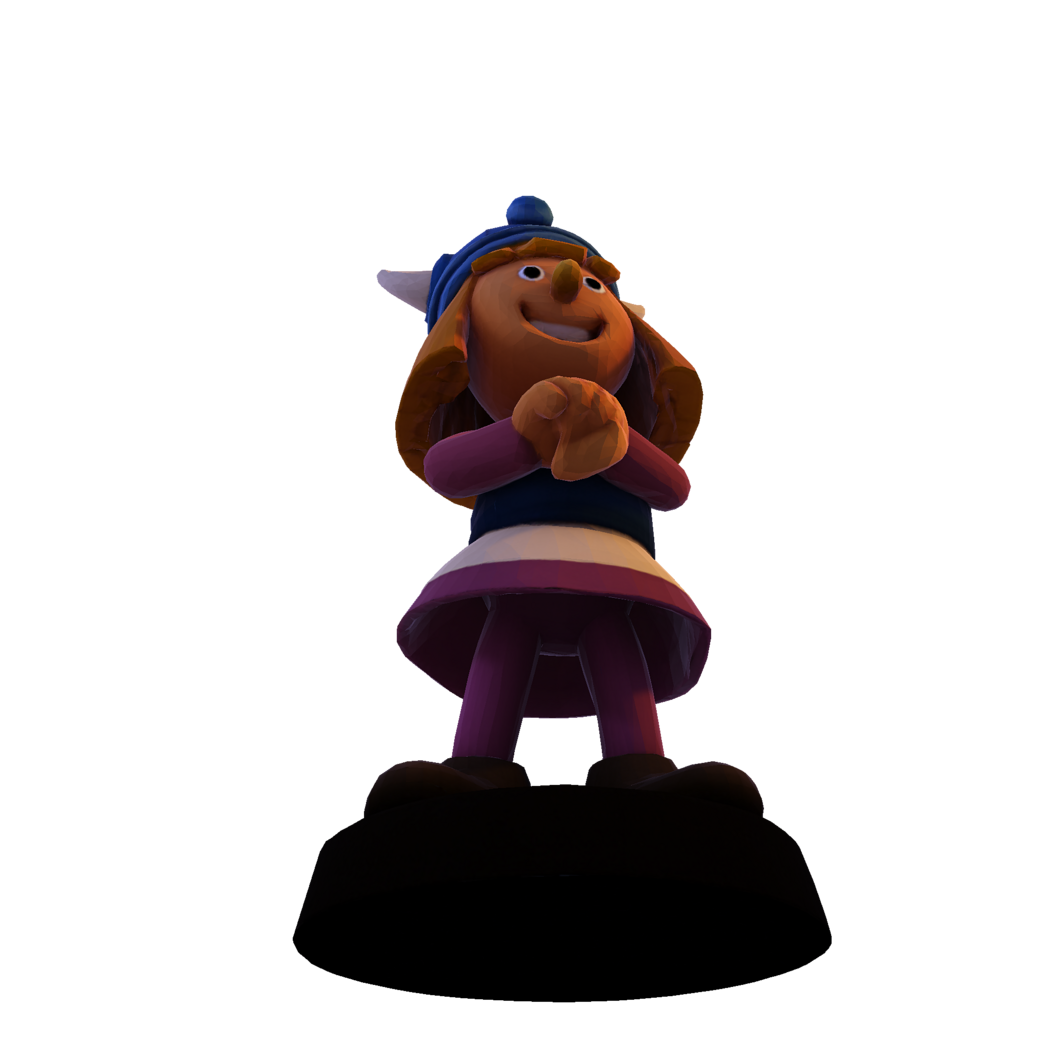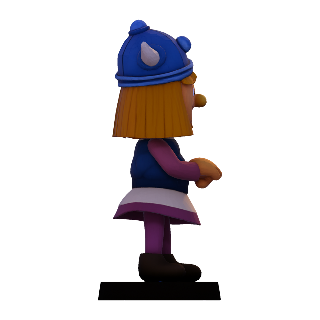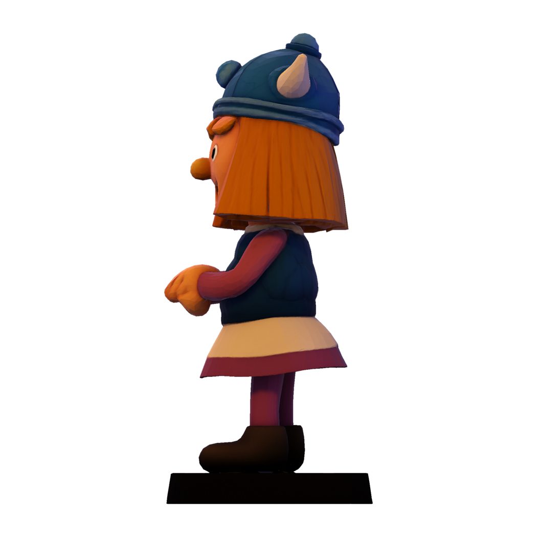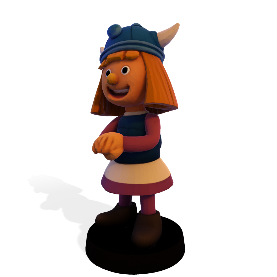 This stylized Viking girl 3D model features a cheerful character with orange hair, horned helmet, and layered clothing, standing gracefully on a black circular base. Her expressive pose, clasped hands, and cartoonish proportions make her ideal for display, fan art collections, or themed dioramas.
