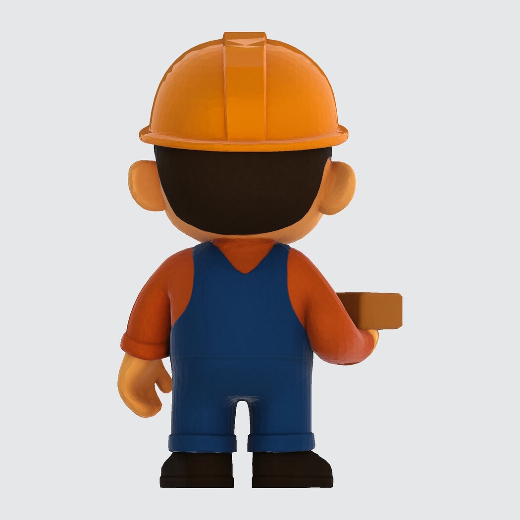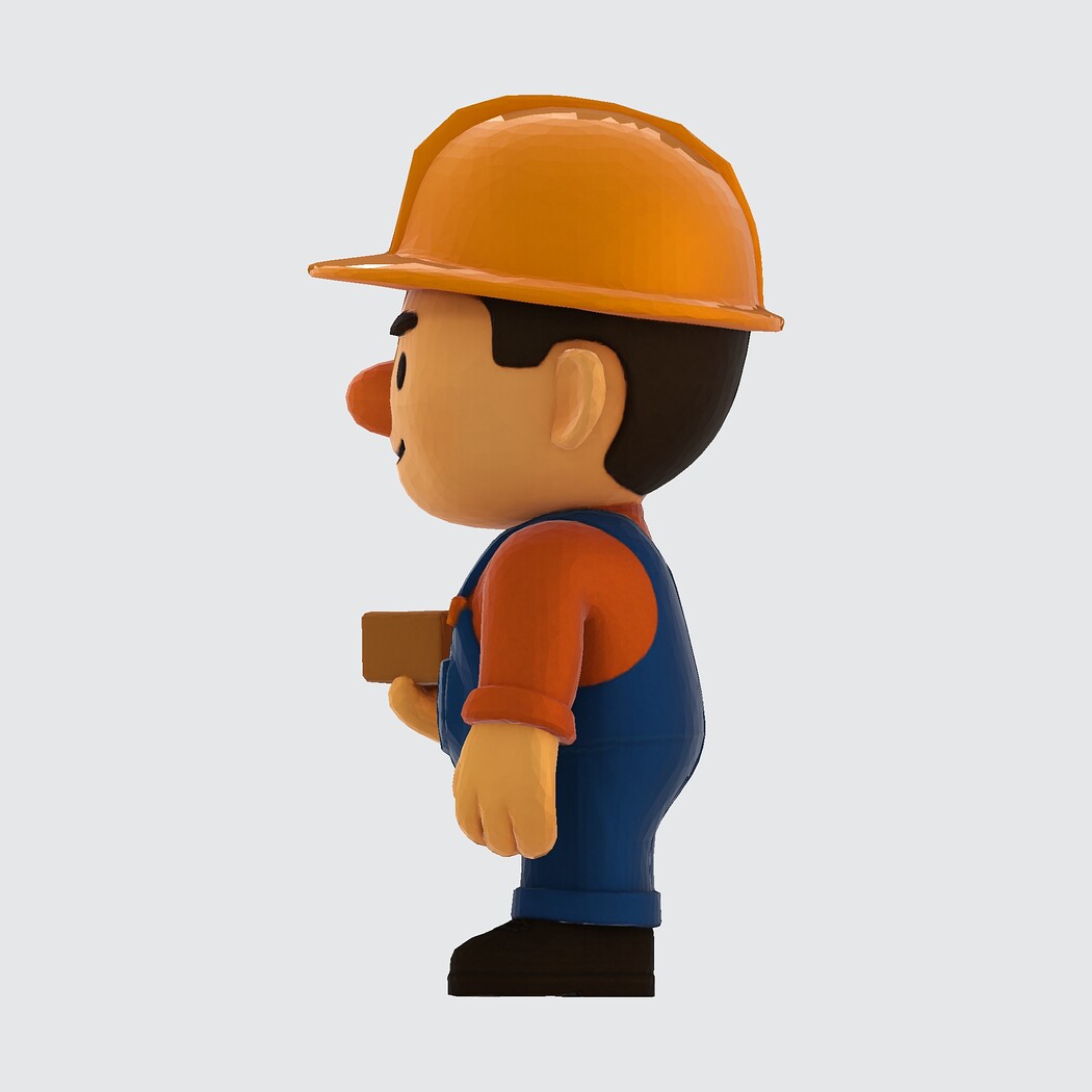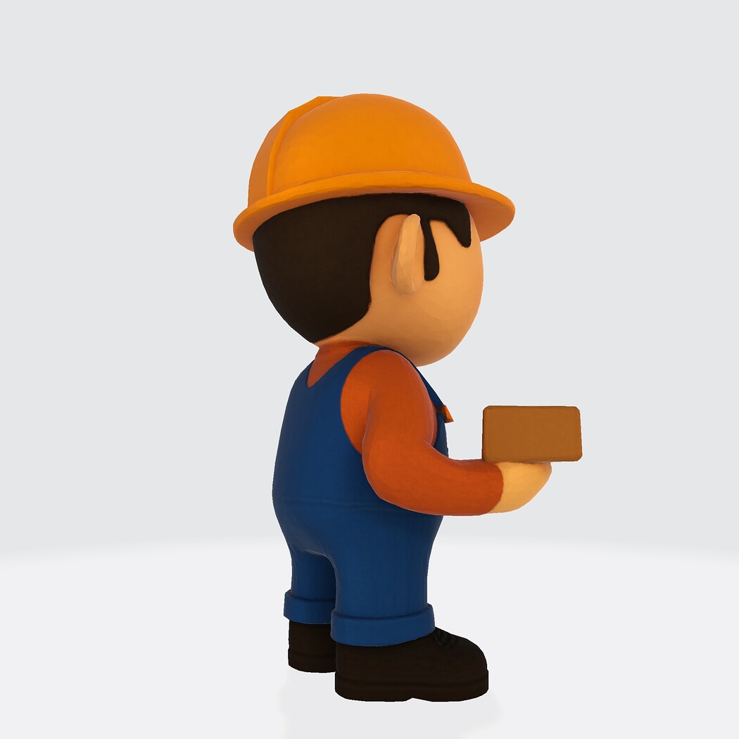 The character features an essential construction worker in a classic orange hard hat and blue overalls, proudly holding a brick. The low-poly design ensures excellent stability and a fast, clean print every time.