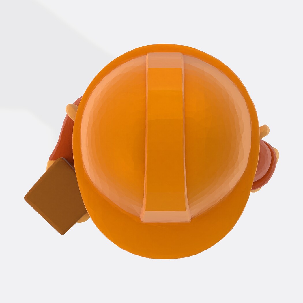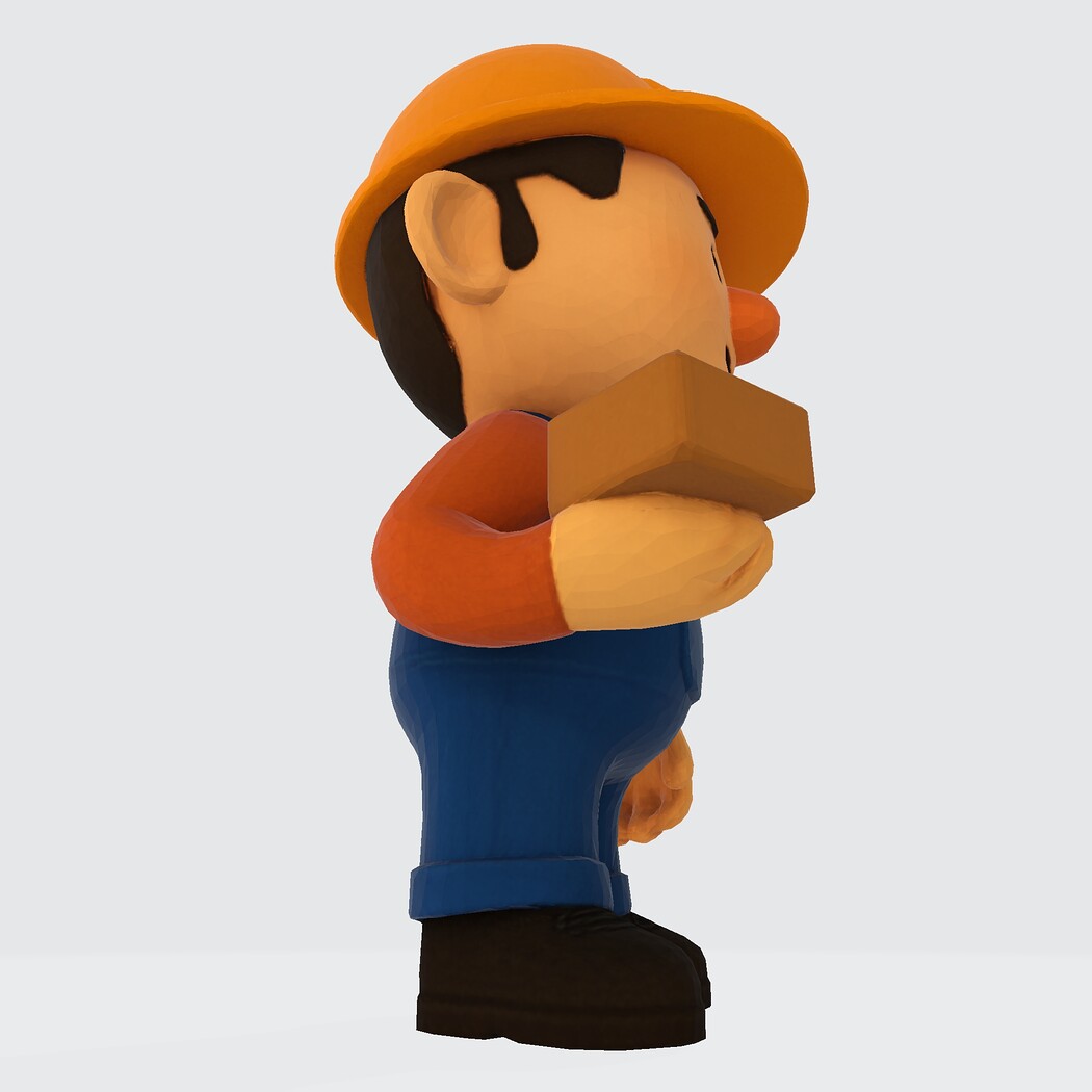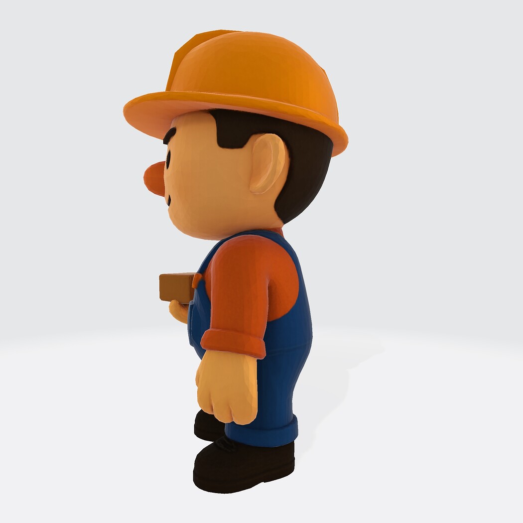 The character features an essential construction worker in a classic orange hard hat and blue overalls, proudly holding a brick. The low-poly design ensures excellent stability and a fast, clean print every time.