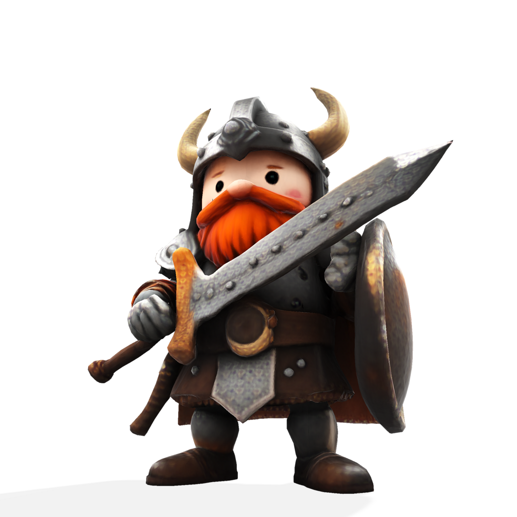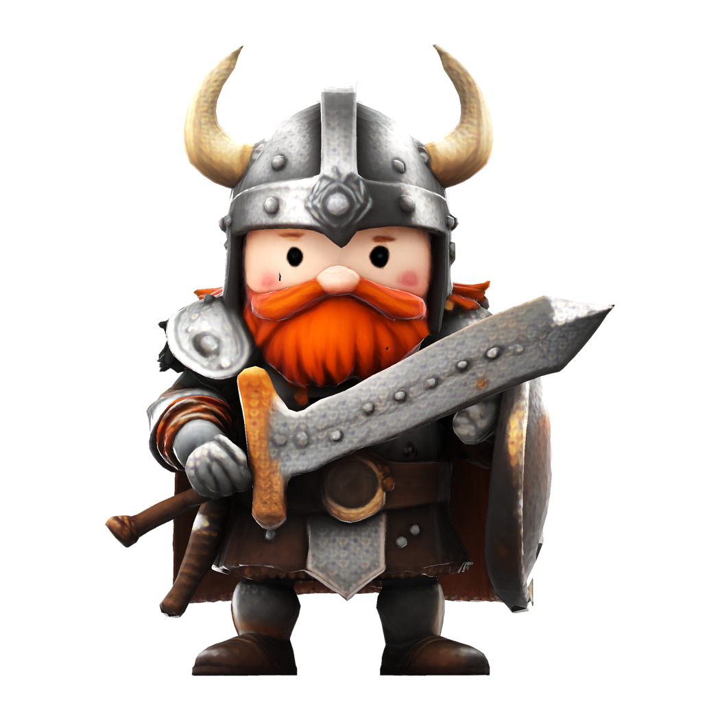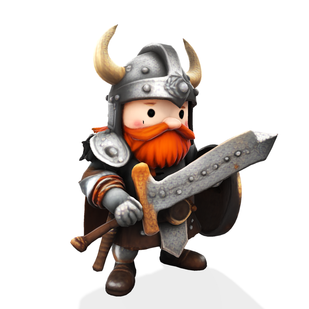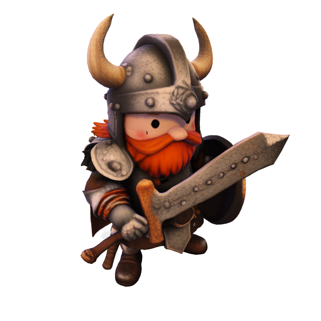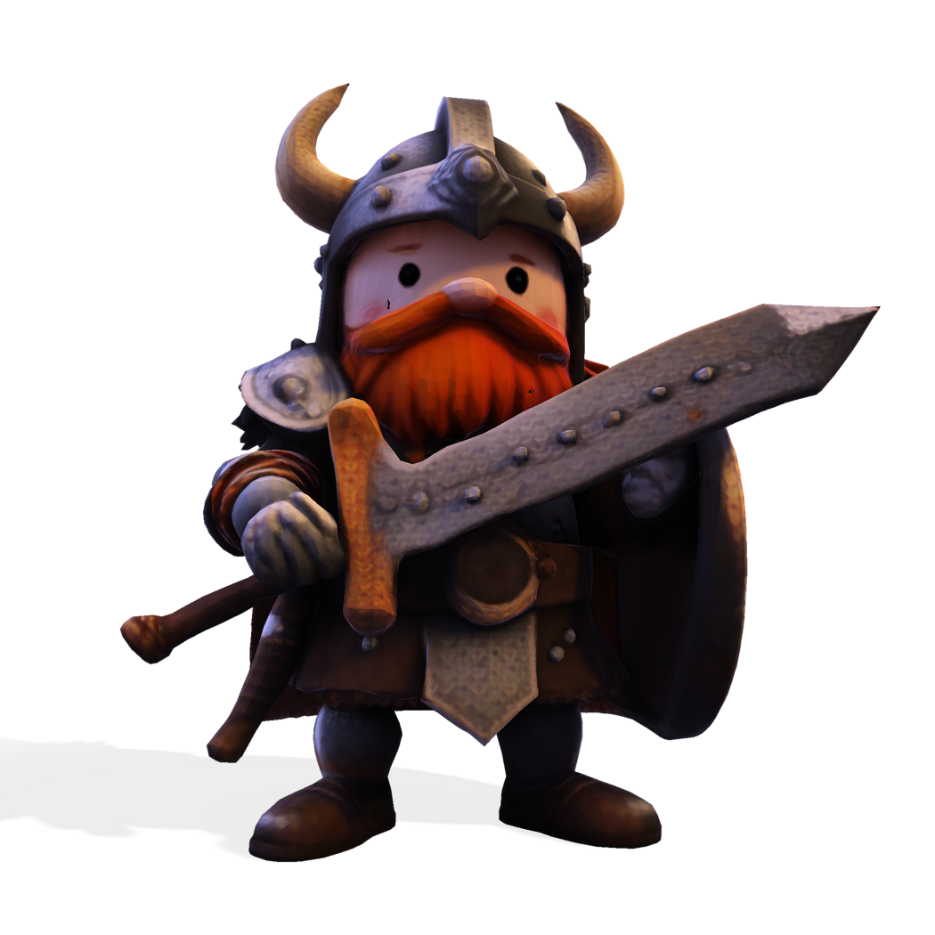Presenting the powerful Chibi Viking Warrior! This incredibly detailed 3D model showcases a formidable but charming fighter, featuring a distinctive orange beard, polished armor, a fierce horned helmet, and wielding a massive, imposing greatsword. This model masterfully captures the essence of a heroic fantasy character in an appealing, chunky, stylized format.