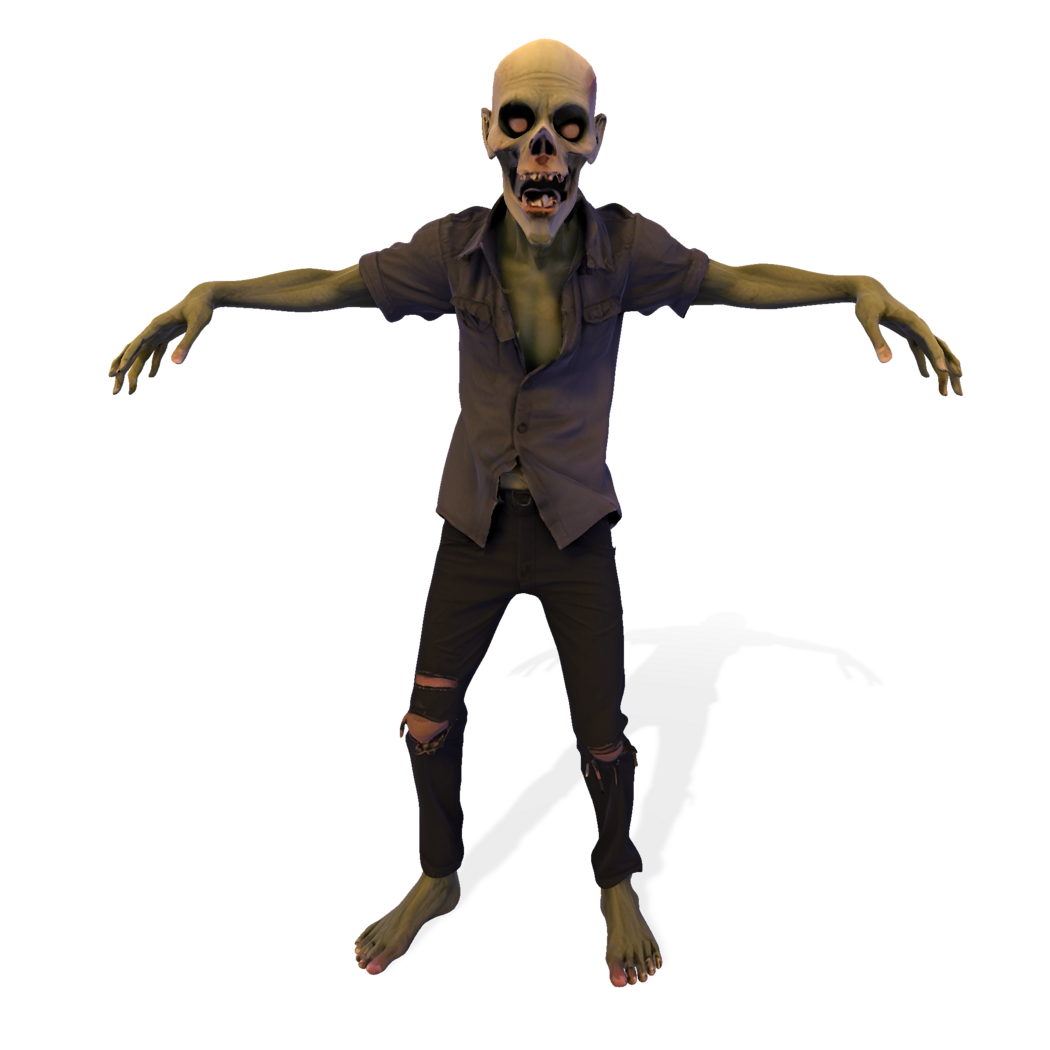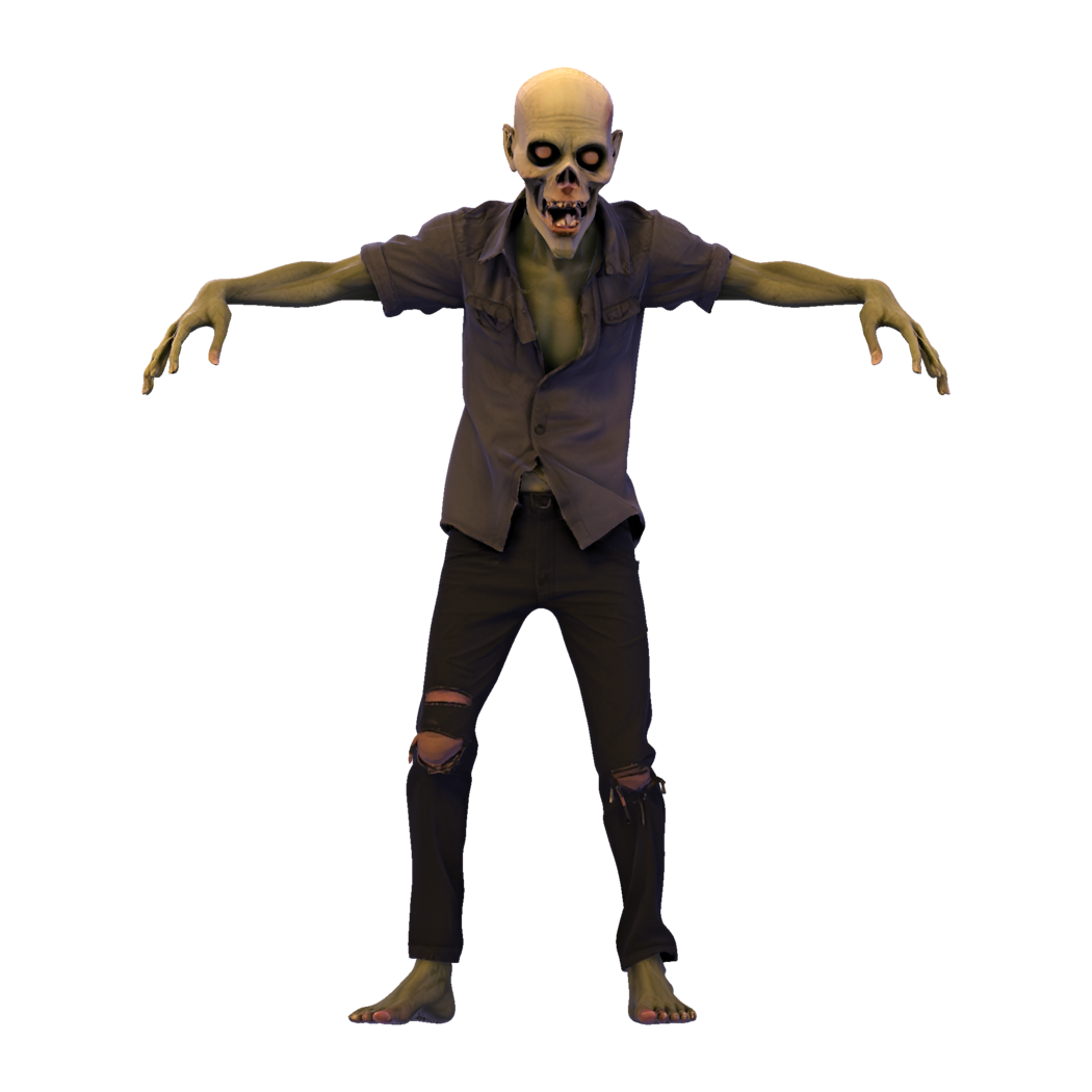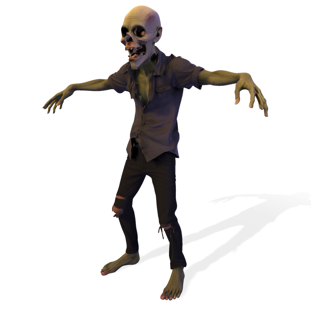 This stylized zombie figurine captures the classic undead aesthetic with greenish skin, skeletal facial features, and a tattered outfit. Posed with arms outstretched and feet planted firmly on a rugged base, it evokes the eerie, slow-moving menace of traditional horror lore. The model is sculpted with high-poly detail, from exposed teeth and wrinkled skin to ripped clothing and bone structure.