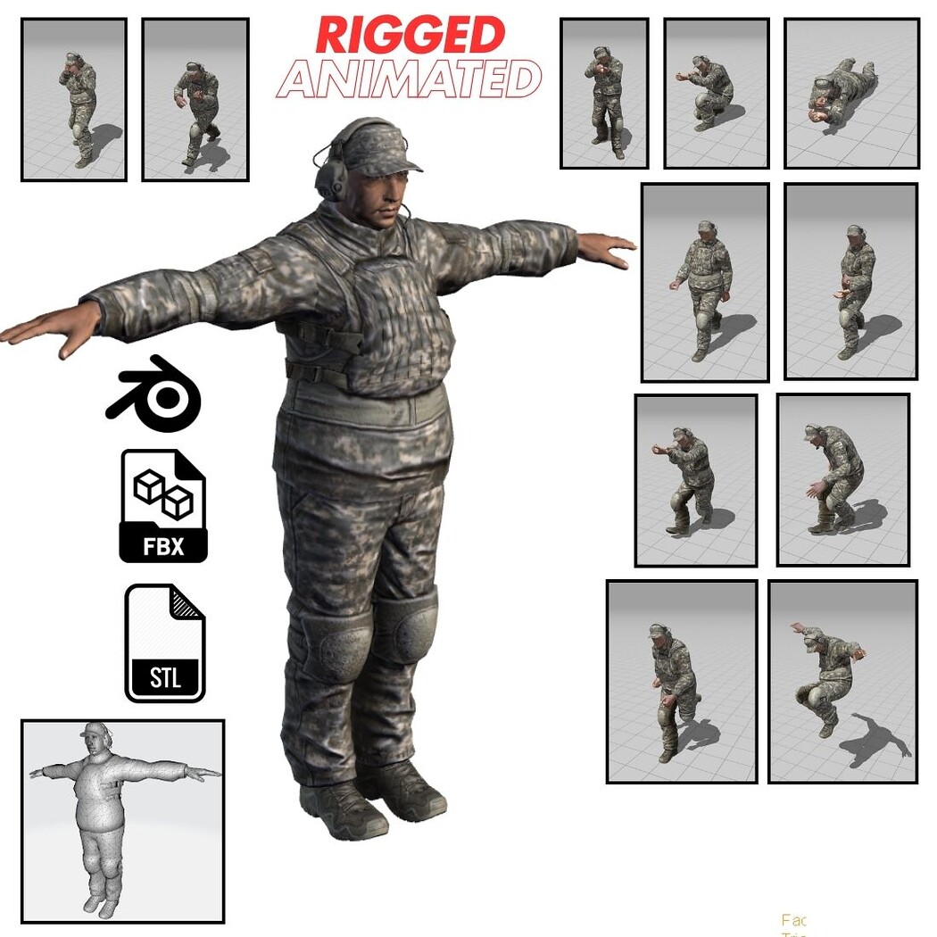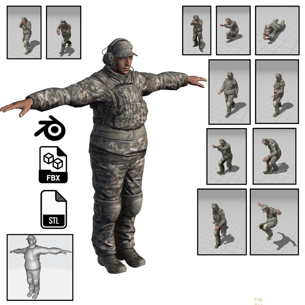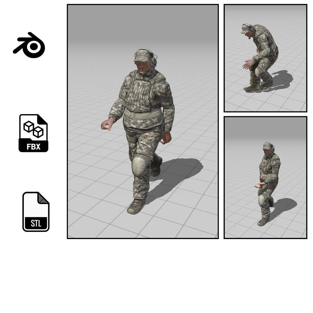This is a realistic low poly 3D character model of a modern soldier, fully optimized for games, movies, VR/AR applications, and real-time environments. The model comes in OBJ format with all textures included, making it easy to import and use in any 3D software or game engine (Unity, Unreal Engine, Blender, 3ds Max, Maya, etc.).