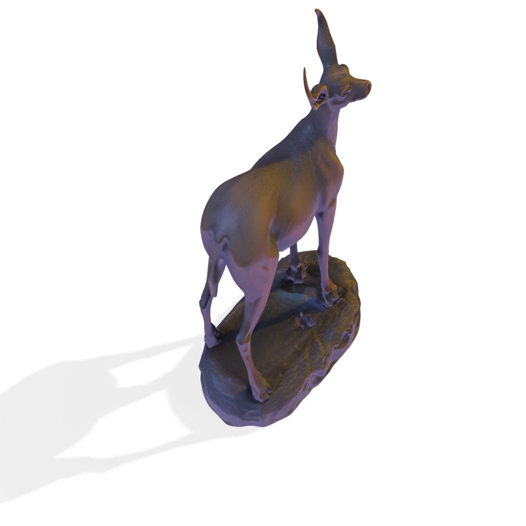 This model is optimized for resin printers to capture fine details such as fur texture, antler ridges, and terrain contours. It is also compatible with FDM machines using high-resolution settings (0.1 mm layer height or finer). Recommended materials include PLA, ABS, PETG, and UV-curable resin. The model prints best at a scale of 150–200 mm in height, with an estimated print time of 8–12 hours depending on machine and settings. Infill should be set between 20–30% for FDM prints; resin prints should be solid. Supports are required under the antlers, legs, and base edges to ensure structural integrity.