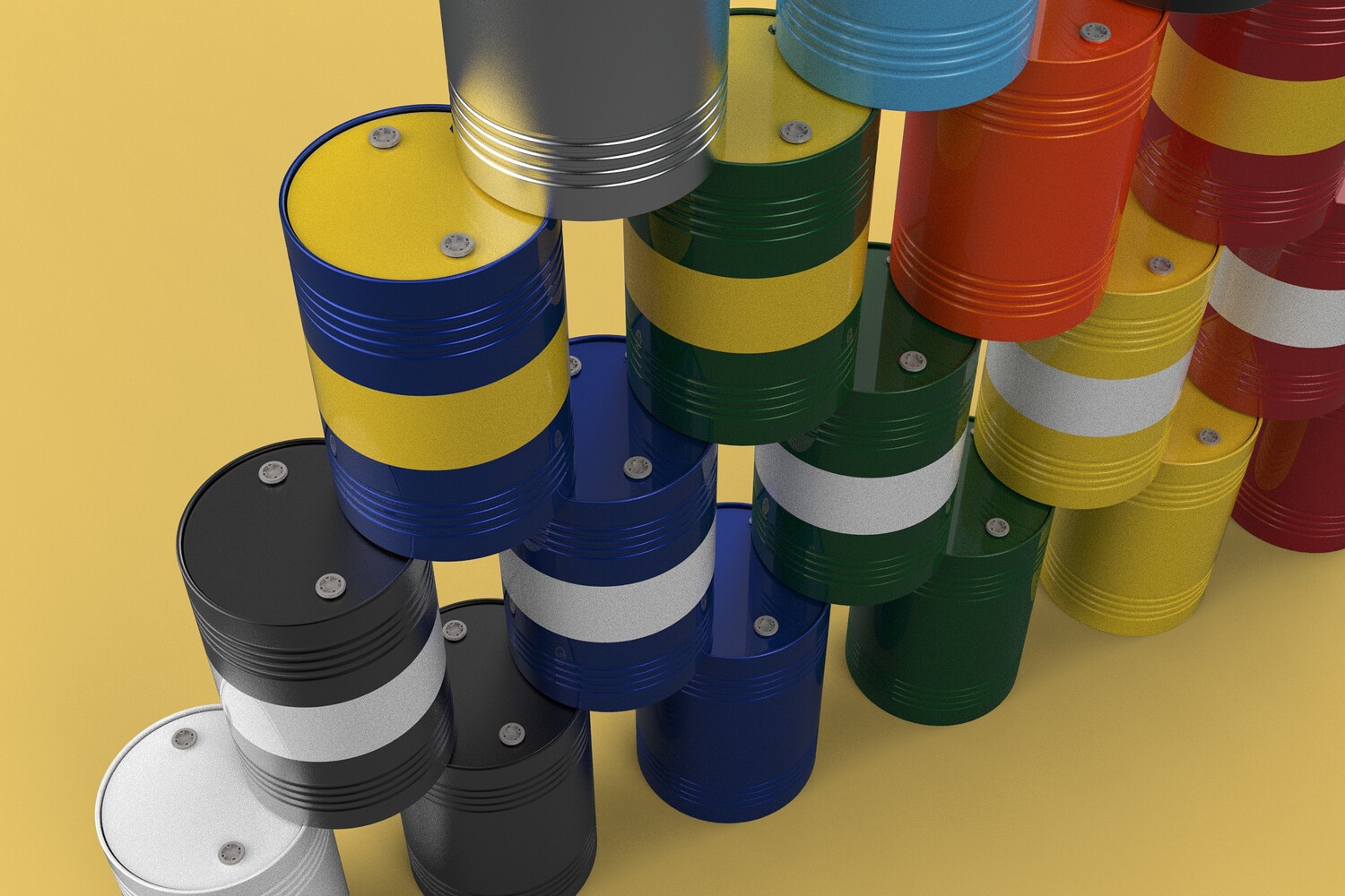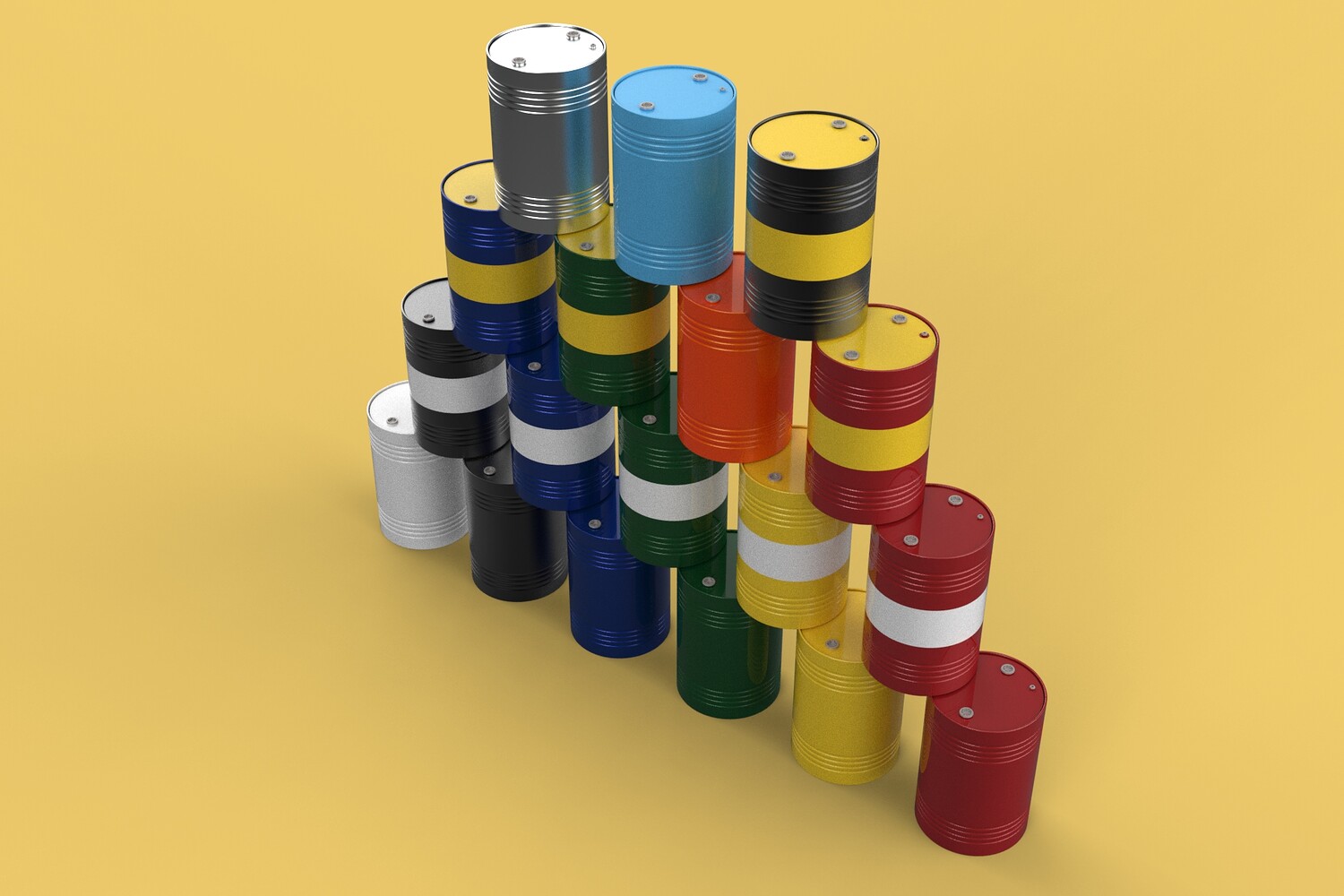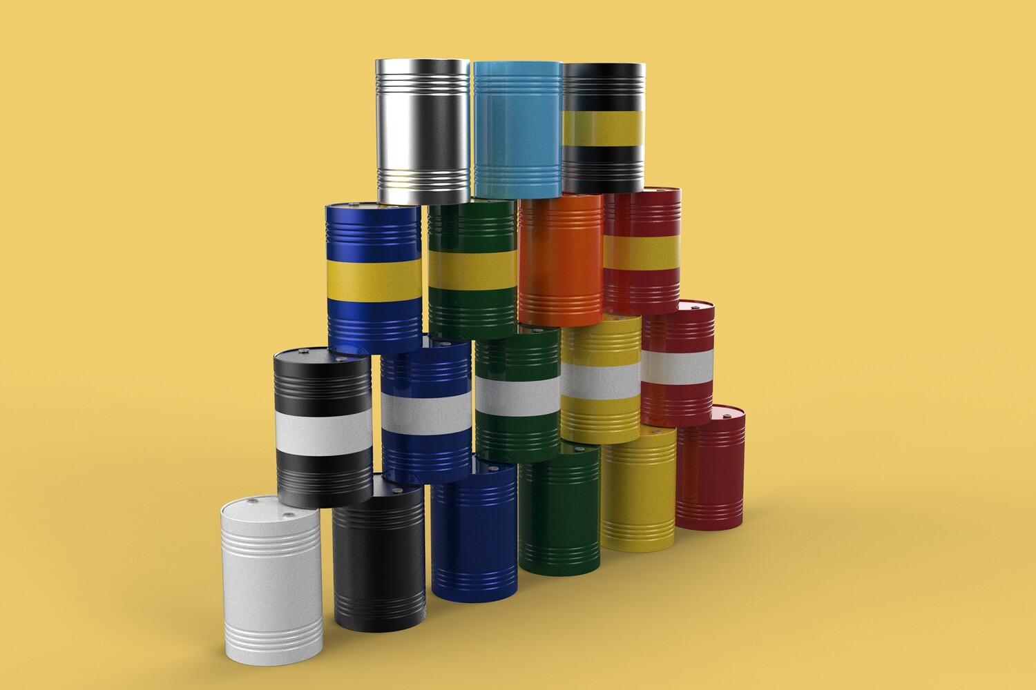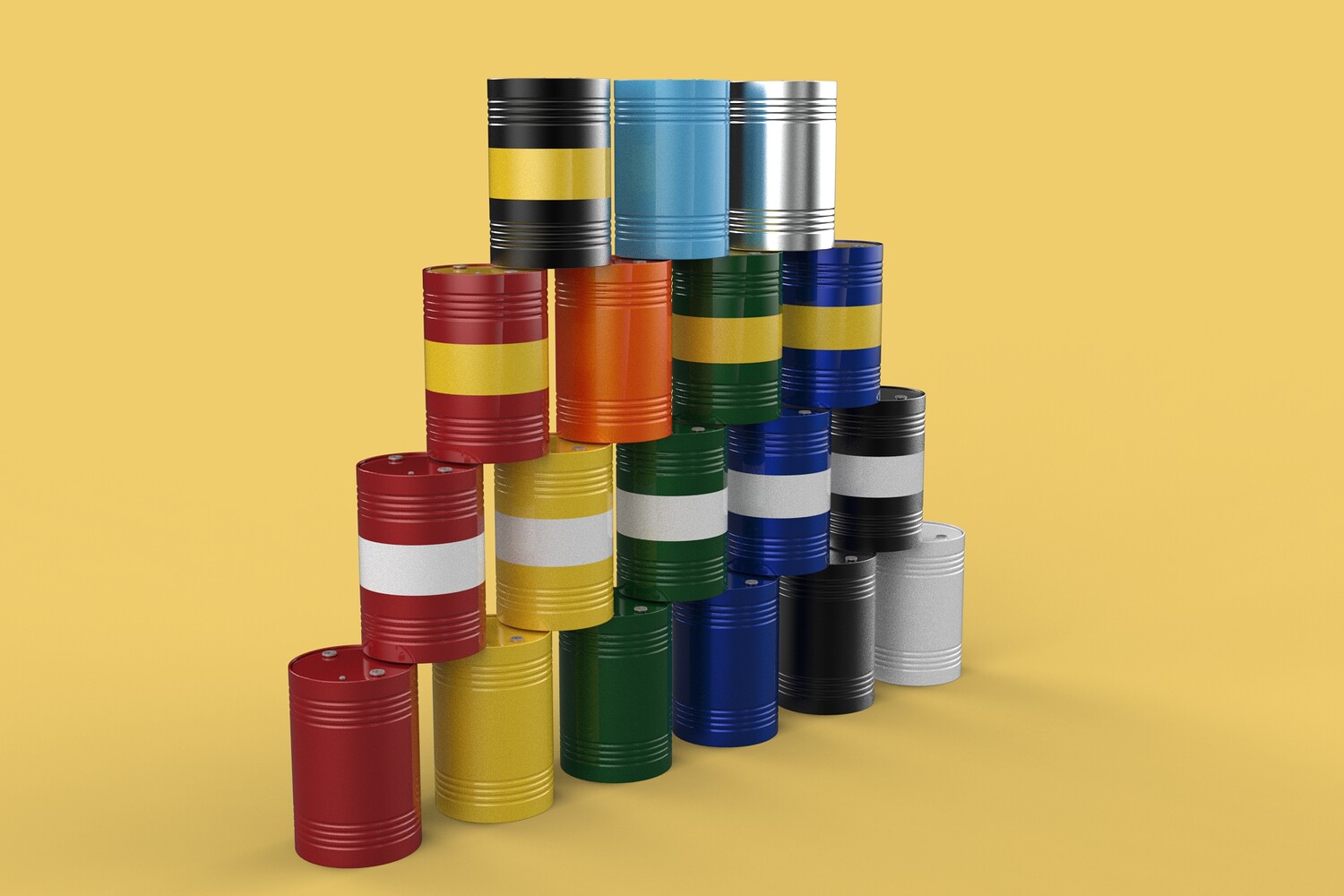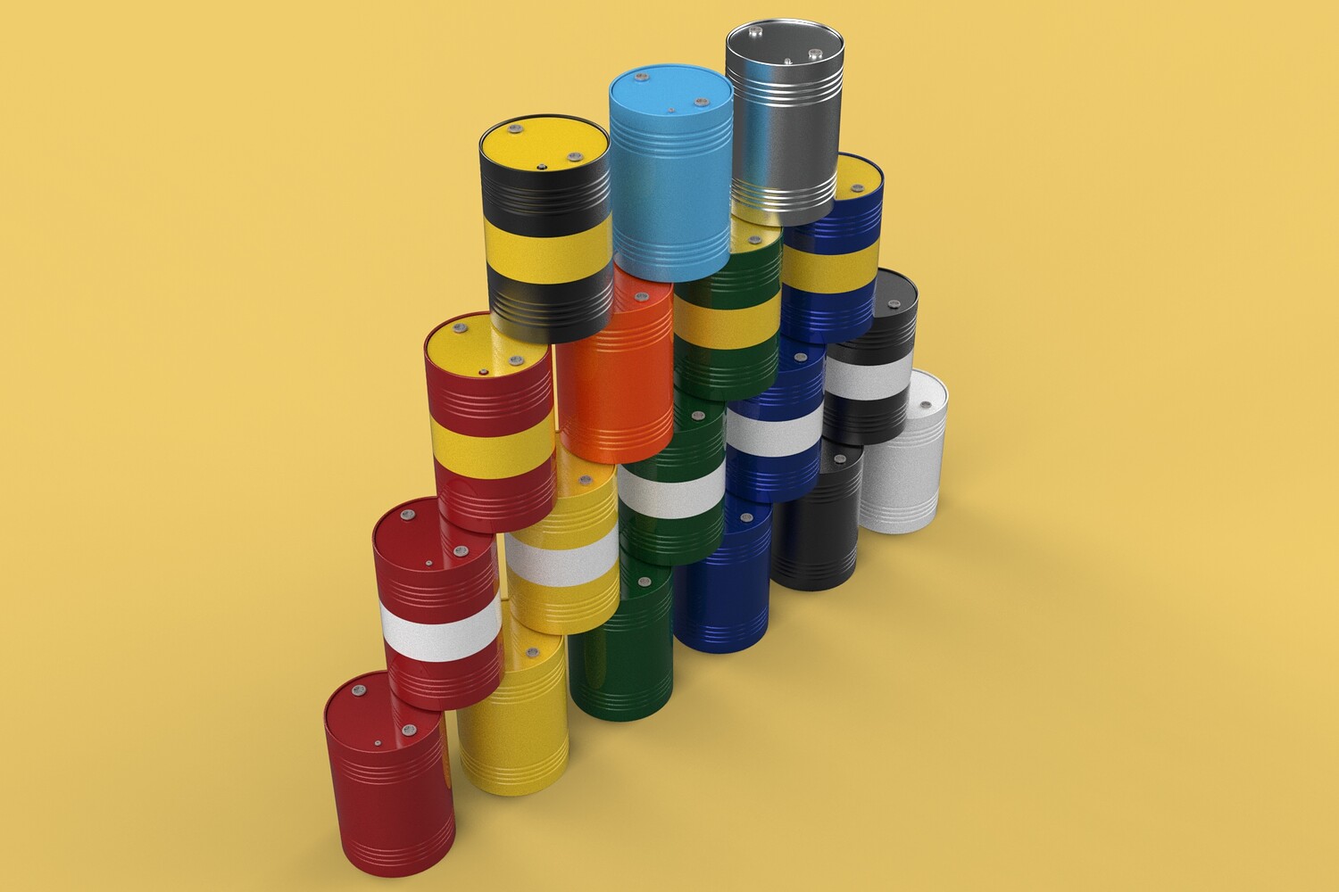 Bulk Storage: Indicates a need for storing a significant quantity of fuel oil. Categorization: Different colors likely represent different grades, types, or batches of fuel oil. Space Management: Stacking is a common method for maximizing storage capacity. Safety Considerations: Proper stacking procedures and handling of potentially flammable materials are crucial. Inventory Management: Color-coding can aid in visually managing fuel oil inventory. Possible Scenarios: