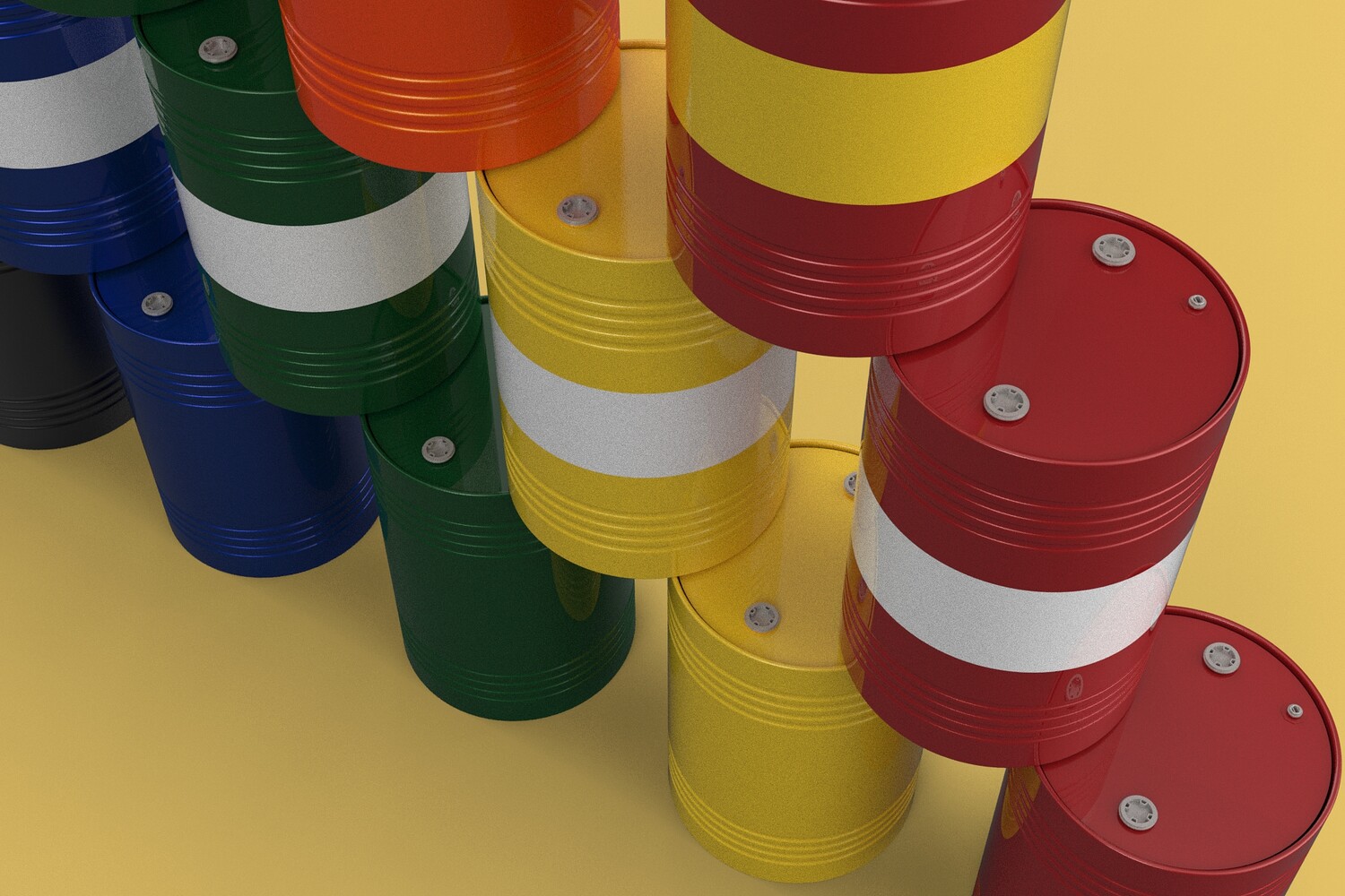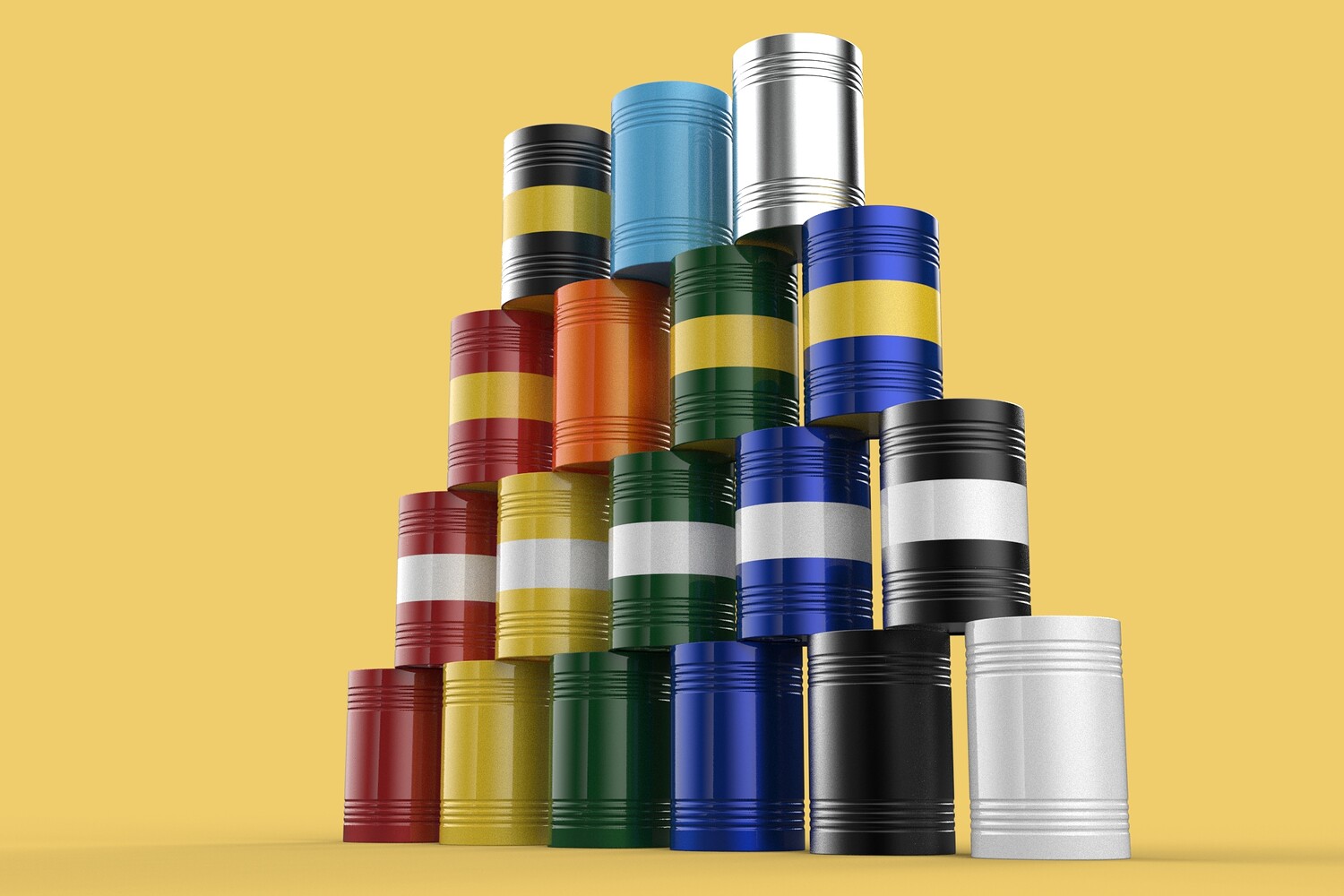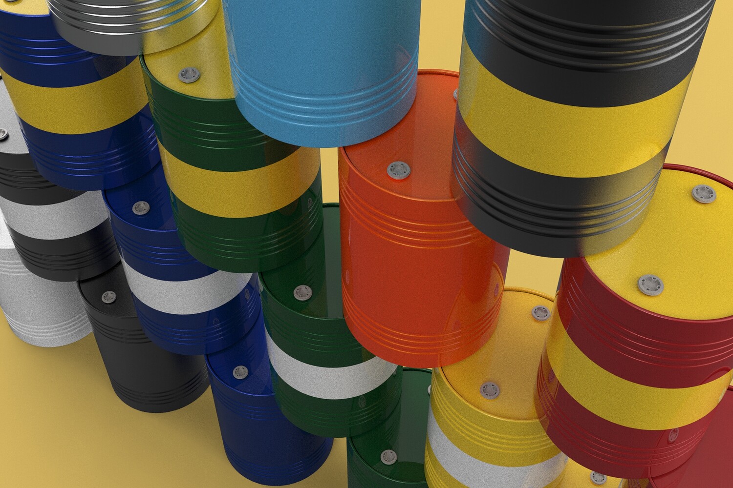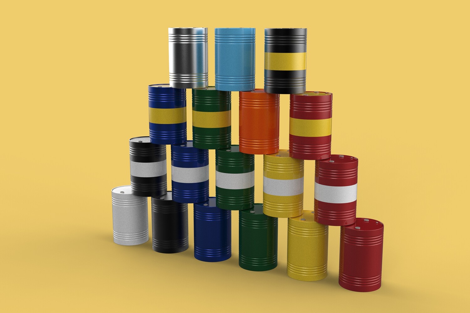Bulk Storage: Indicates a need for storing a significant quantity of fuel oil. Categorization: Different colors likely represent different grades, types, or batches of fuel oil. Space Management: Stacking is a common method for maximizing storage capacity. Safety Considerations: Proper stacking procedures and handling of potentially flammable materials are crucial. Inventory Management: Color-coding can aid in visually managing fuel oil inventory. Possible Scenarios: