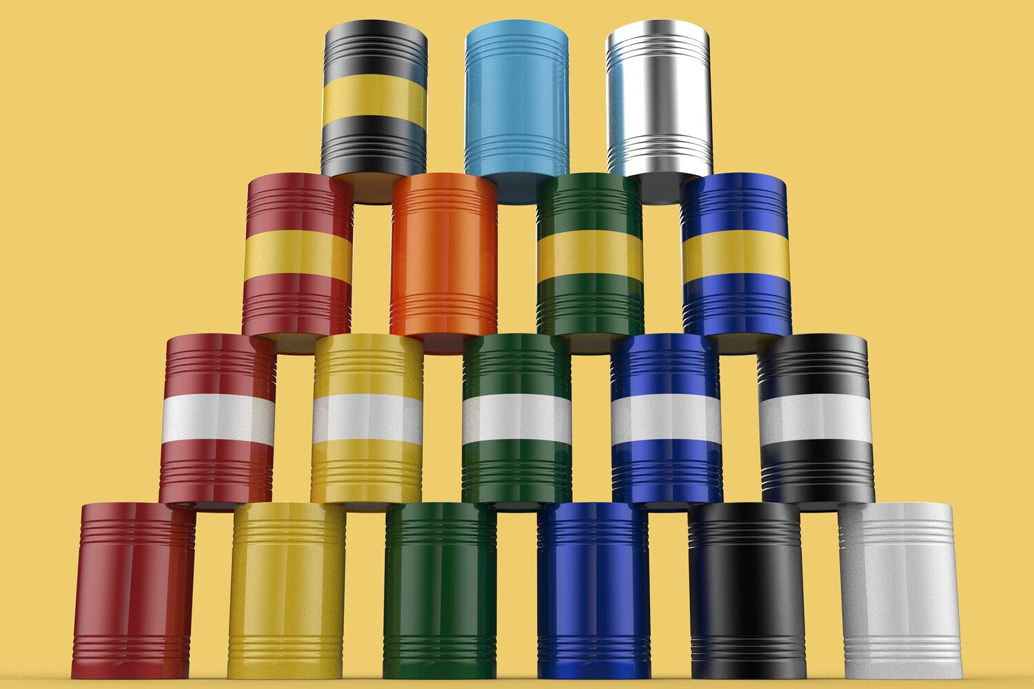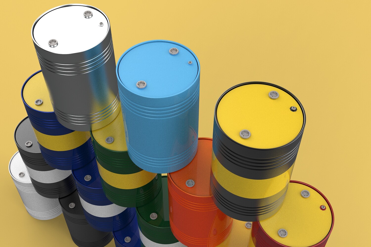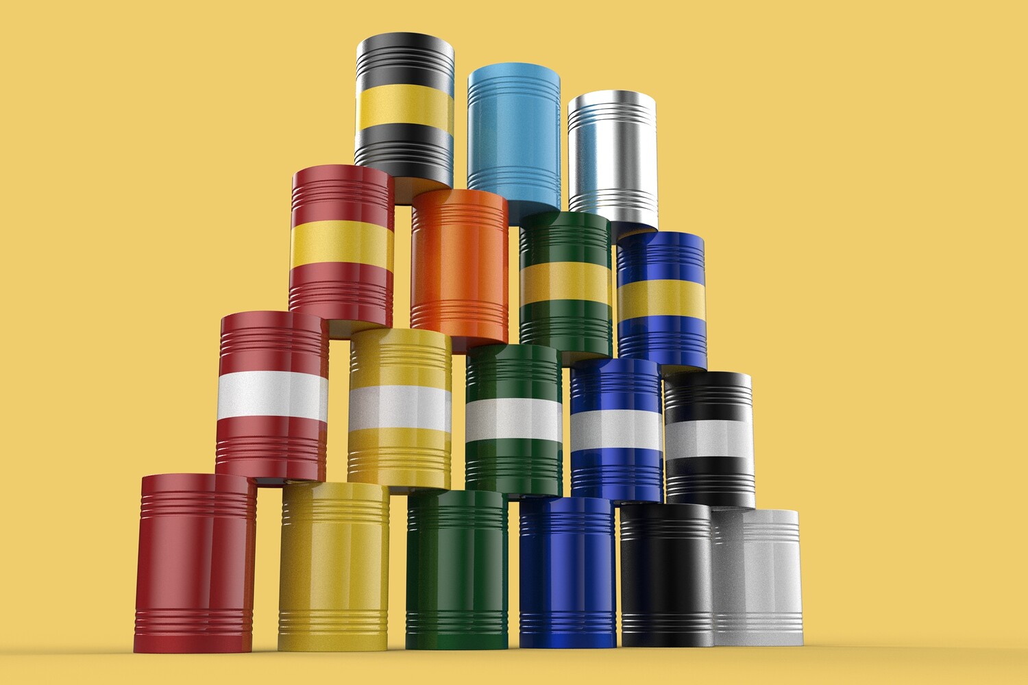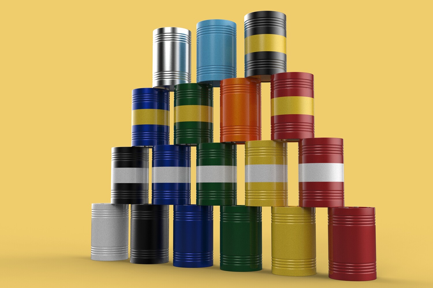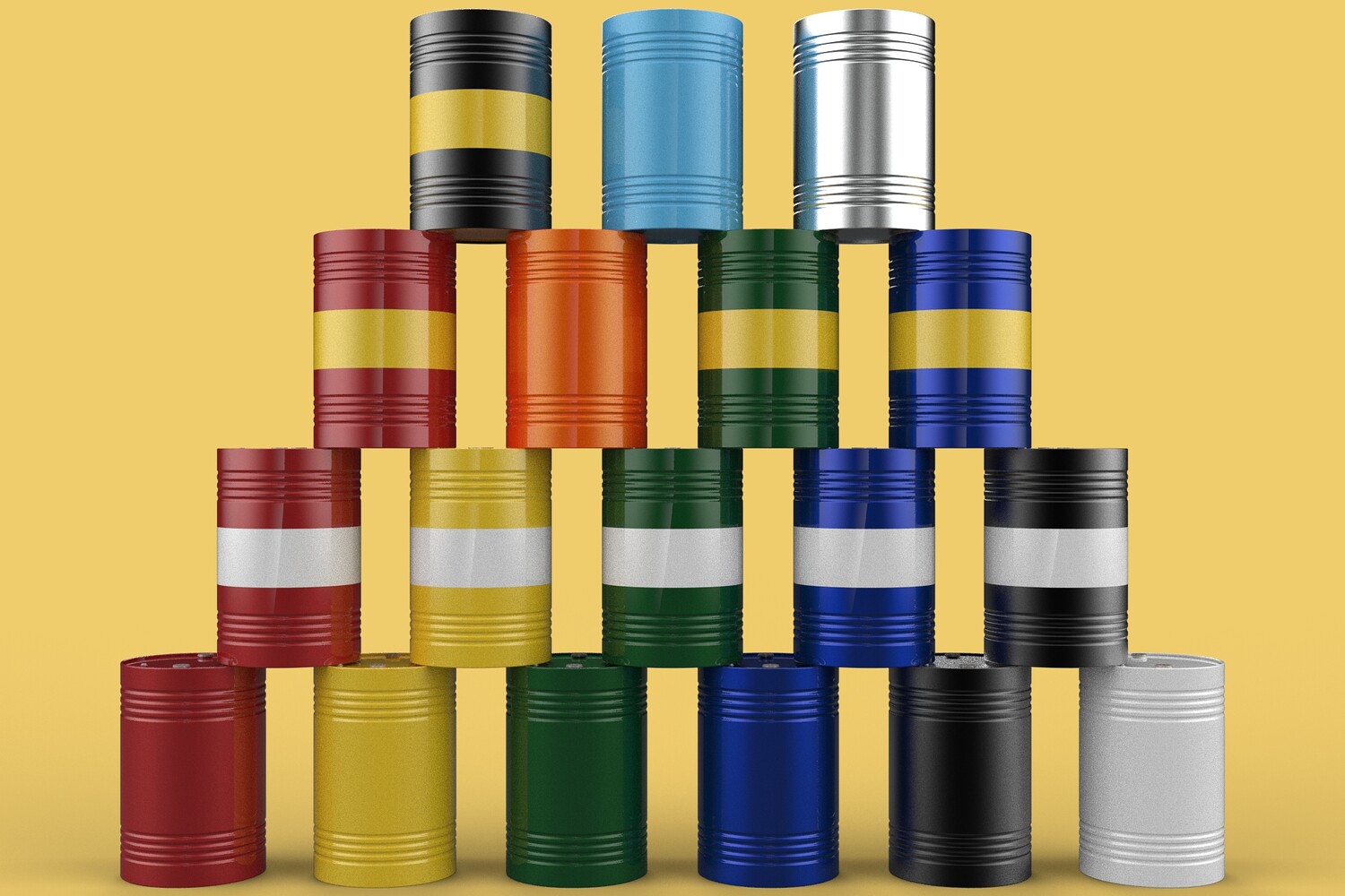 Bulk Storage: Indicates a need for storing a significant quantity of fuel oil. Categorization: Different colors likely represent different grades, types, or batches of fuel oil. Space Management: Stacking is a common method for maximizing storage capacity. Safety Considerations: Proper stacking procedures and handling of potentially flammable materials are crucial. Inventory Management: Color-coding can aid in visually managing fuel oil inventory. Possible Scenarios: