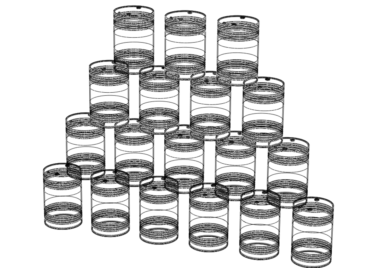 This describes a scene or inventory of multiple steel drums, barrels, or gas tanks, specifically intended for fuel oil storage, that are stacked upon one another and come in a variety of colors. This indicates a system for organized bulk storage, potentially for different grades or types of fuel oil.
