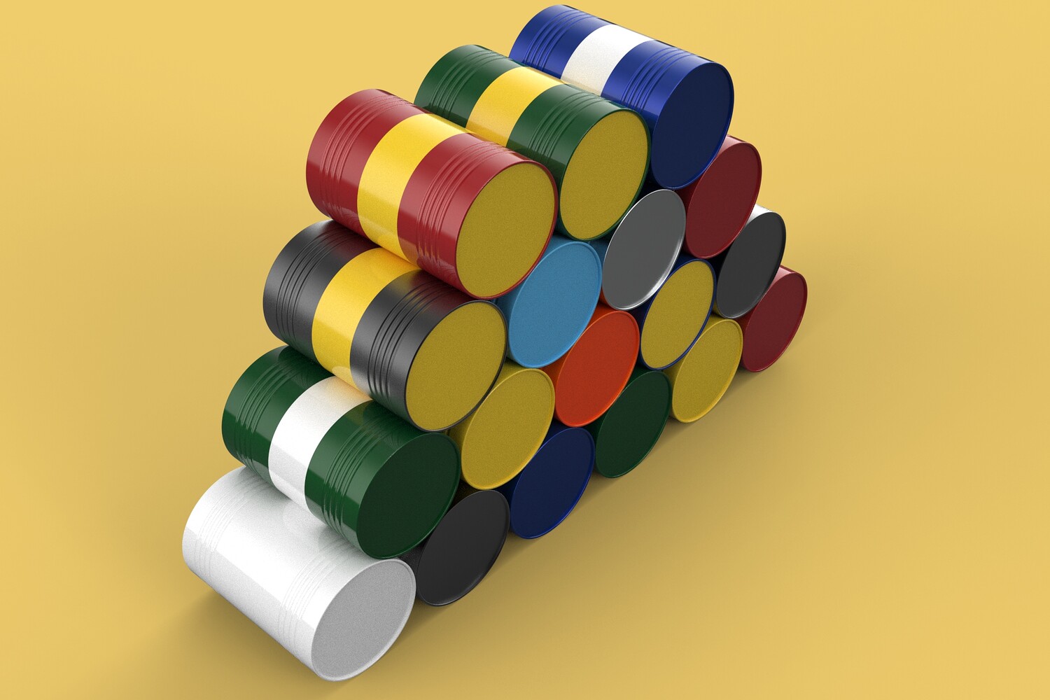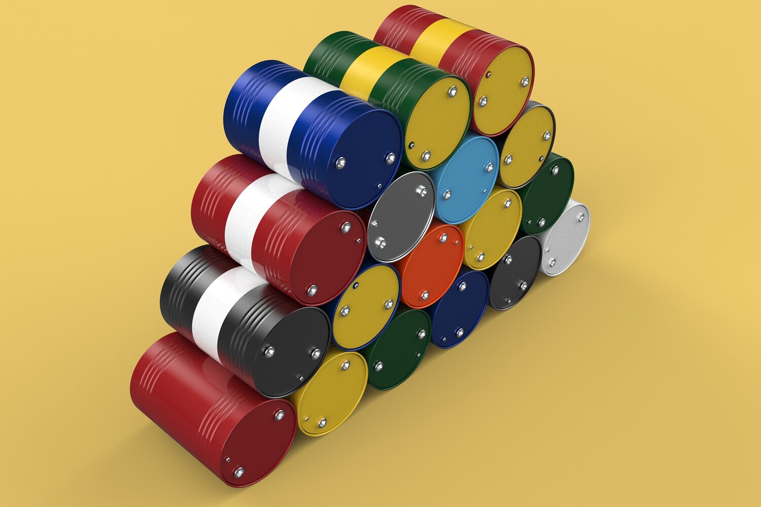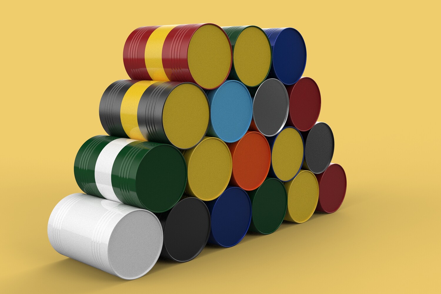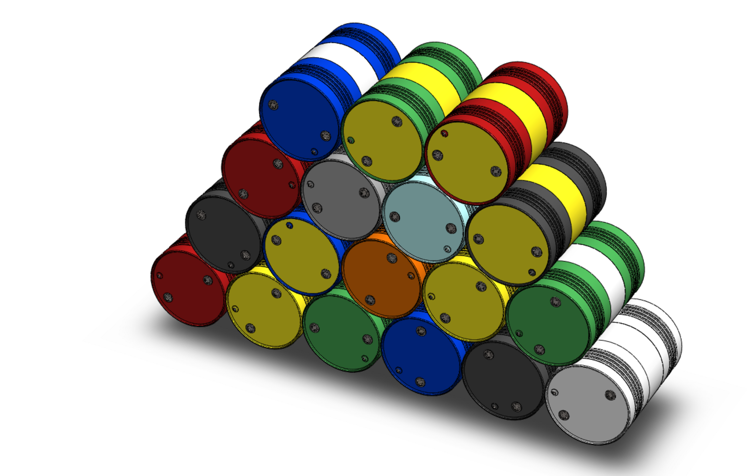 Bulk Storage: Indicates a need for storing a significant quantity of fuel oil. Categorization: Different colors likely represent different grades, types, or batches of fuel oil. Space Management: Stacking is a common method for maximizing storage capacity. Safety Considerations: Proper stacking procedures and handling of potentially flammable materials are crucial. Inventory Management: Color-coding can aid in visually managing fuel oil inventory. Possible Scenarios: