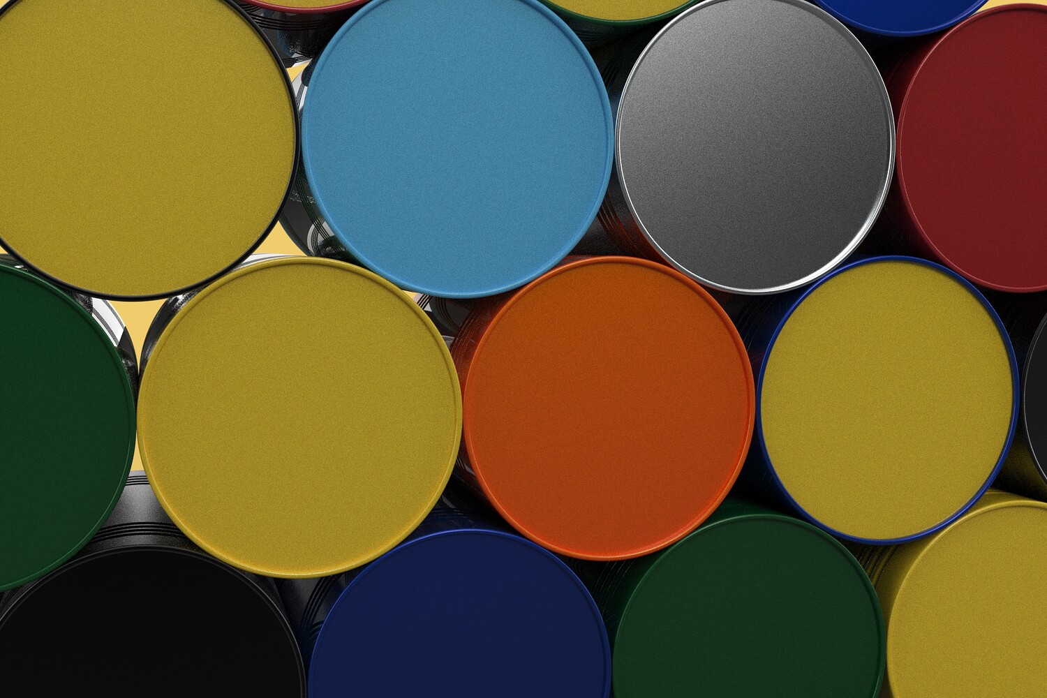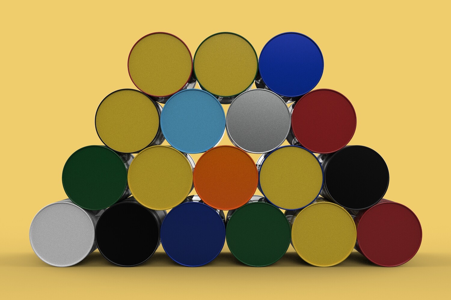 A fuel distribution depot with organized storage of different fuel grades. An industrial facility with separate storage for various types of oil used in operations. A large agricultural operation storing different fuels for machinery. A bulk storage facility awaiting distribution. In summary, a scene of various colored, stacked fuel oil steel drums, barrels, or gas tanks signifies an organized and space-efficient system for storing bulk quantities of potentially different types of fuel oil, emphasizing durability, categorization, and space management. tag : RED YELLOW GREEN BLUE BLACK WHITE metal silver container colorful colored FUEL colour stack stacking Rusty collection bulk Barrel drum