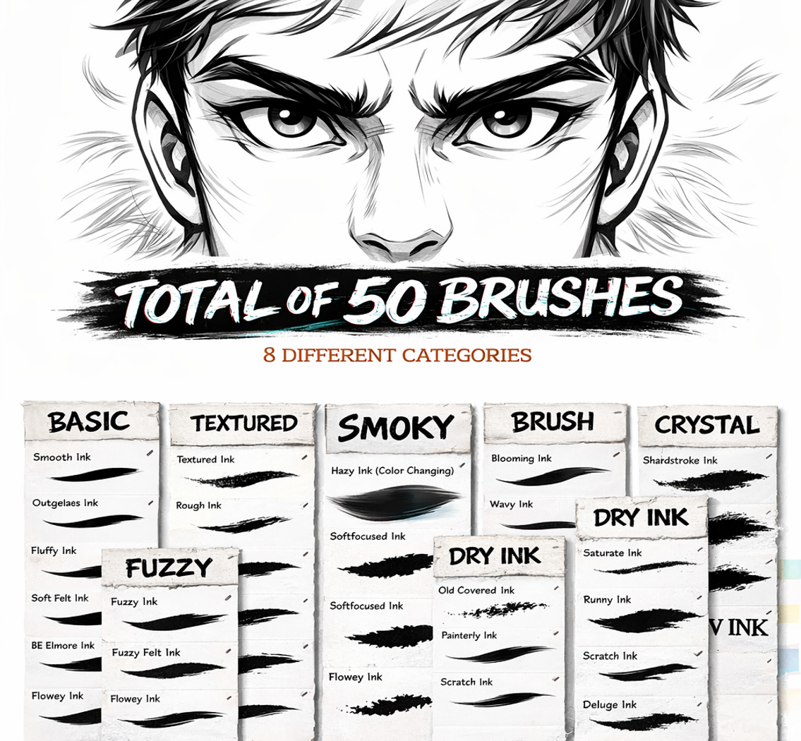 A total of 50 high-quality ink brushes, carefully organized into 8 different categories for maximum versatility: Basic Ink – Smooth, clean strokes for precise line work Textured Ink – Dusty, rough, sand-like, wood bark, and grainy textures Fuzzy Ink – Soft, fluffy, jittered, and hazy ink effects Smoky Ink – Cloudy, patchy, and grain-filled strokes with atmospheric depth Dry Ink – Crackled, chalked, and dry-grain ink styles Wet Ink – Runny, soaked, puddle-stroke, and ink-wash effects Brush Ink – Soft-bleed and wispy traditional brush looks Crystal Ink – Sharp, shard-like strokes with bold texture Each brush reacts naturally to Apple Pencil pressure, giving you full control over thickness, opacity, and flow.