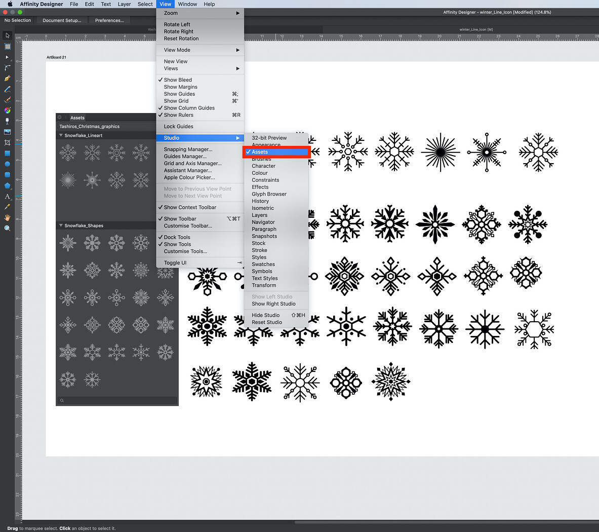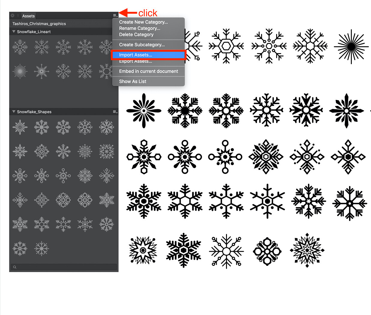 These SNOWFLAKE ASSETS is created for the application Affinity Designer and can also be used as assets in Affinity Photo and Affinity Publisher too or other vector-based applications. Just open the applications Affinity Designer/Photo or Publisher. Go to menu • view • Assets. In the panel Assets, you can open on the right pop-up menu Assets import. Choose the file Tashiro_snowflake.afassets! Have fun! Please leave me a review.