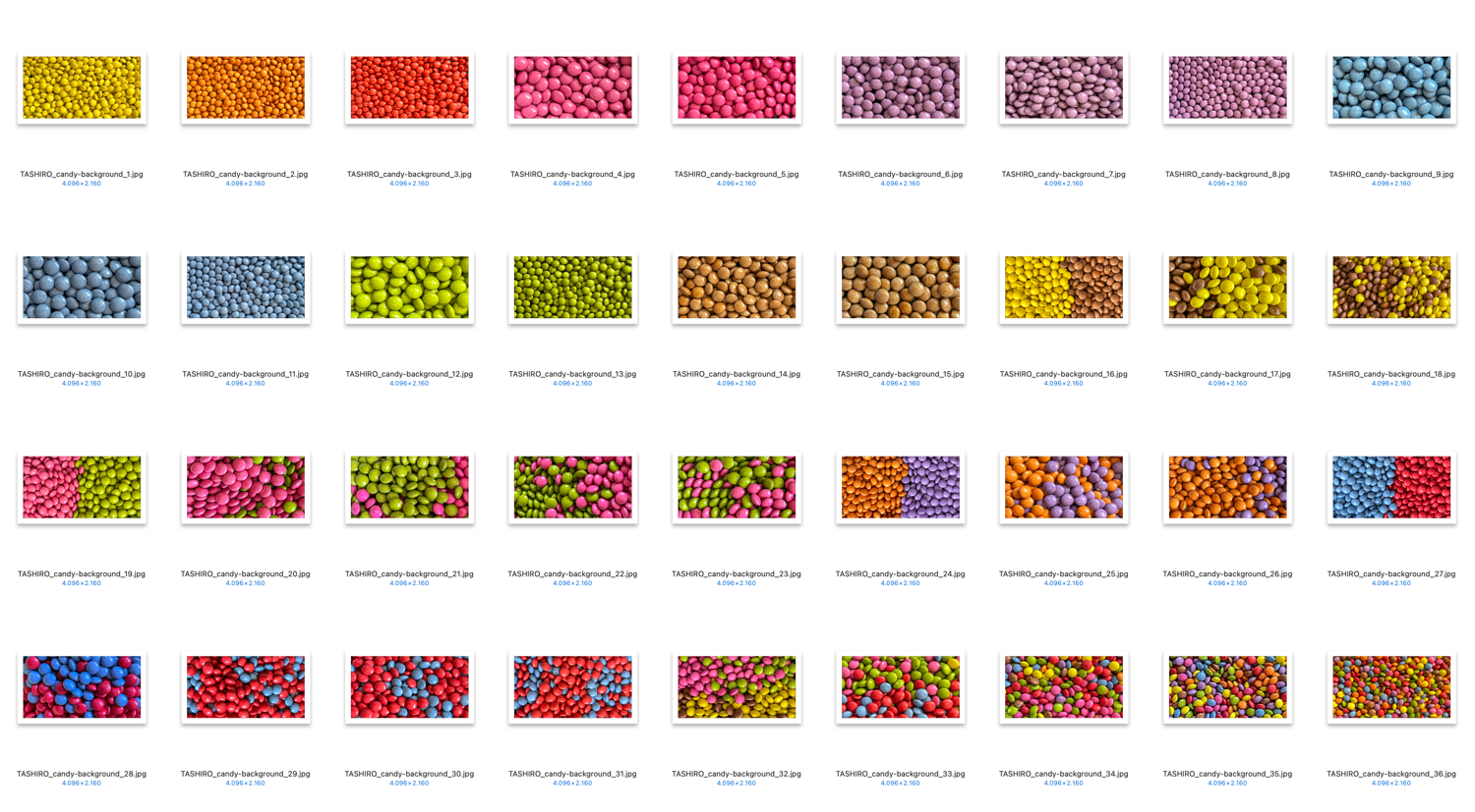 Key Features: 36 unique images of colourful candy textures Ultra high resolution: 4096 x 2160 pixels Professional print quality: 300 DPI