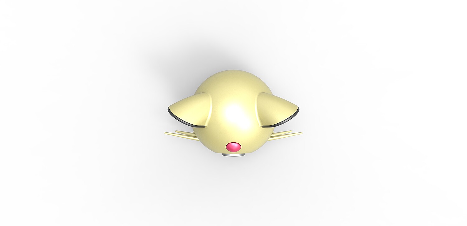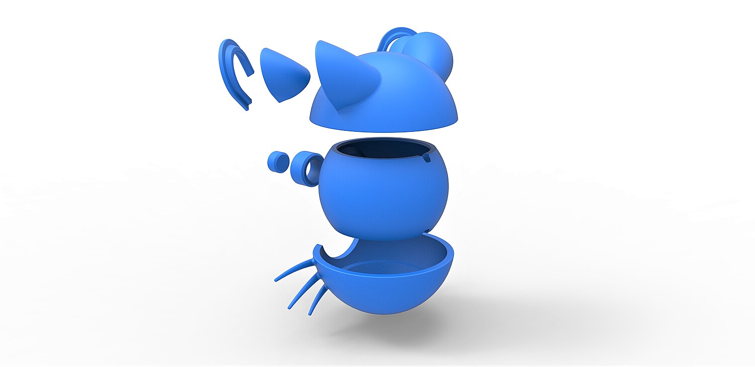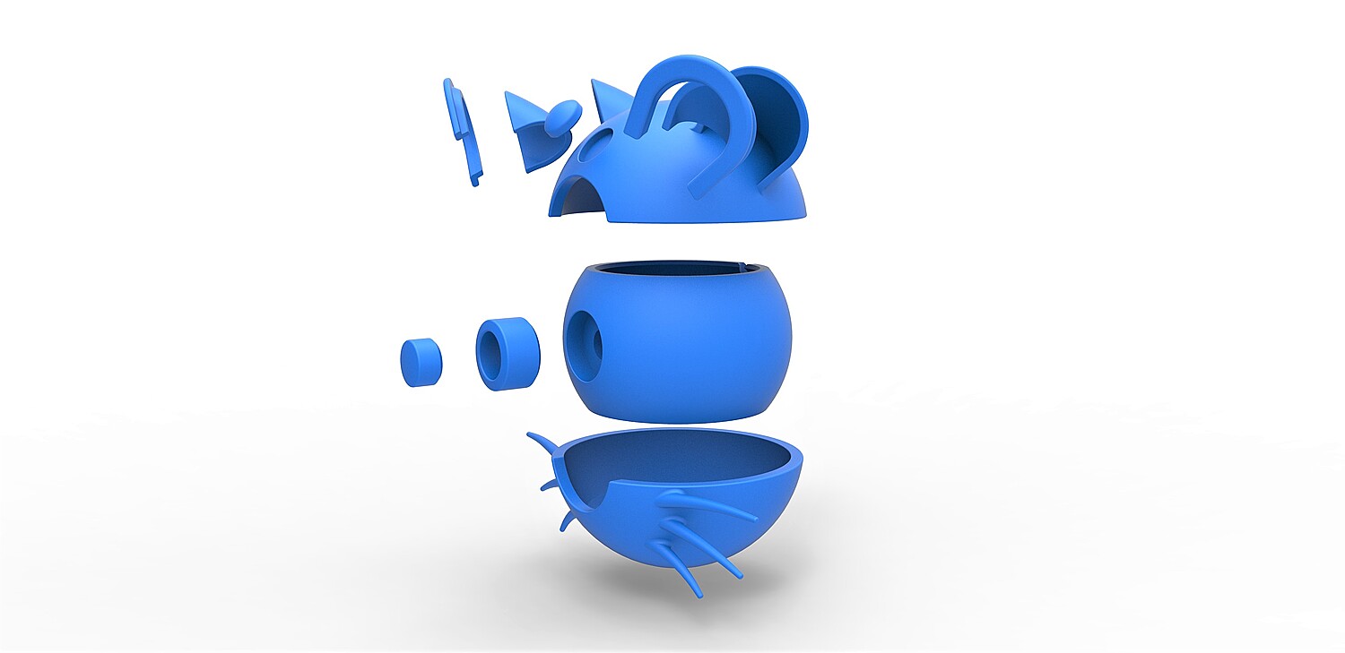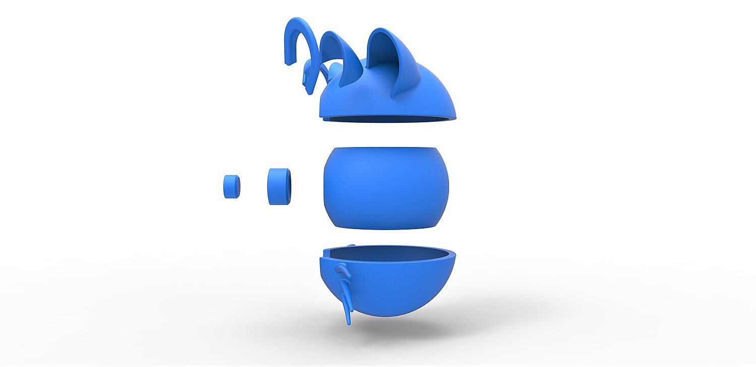 The model consists of parts: Bottom part, Button part 1,2, Central part, Left ear edge, Left ear insert, Right ear edge, Right ear insert, Top insert, Top part.