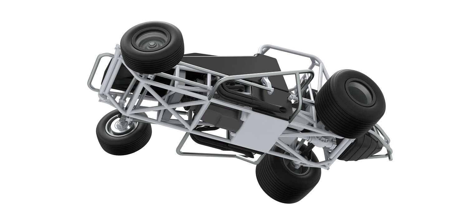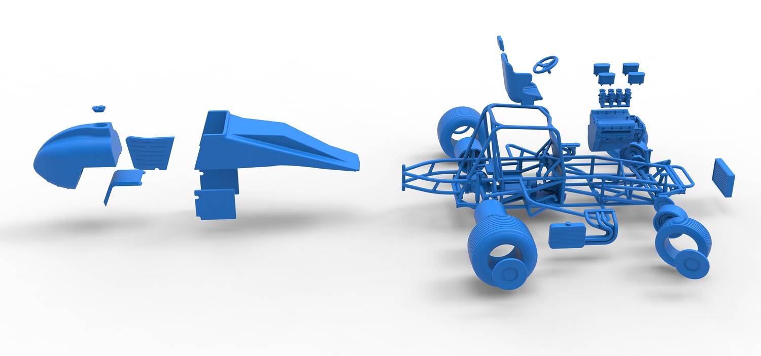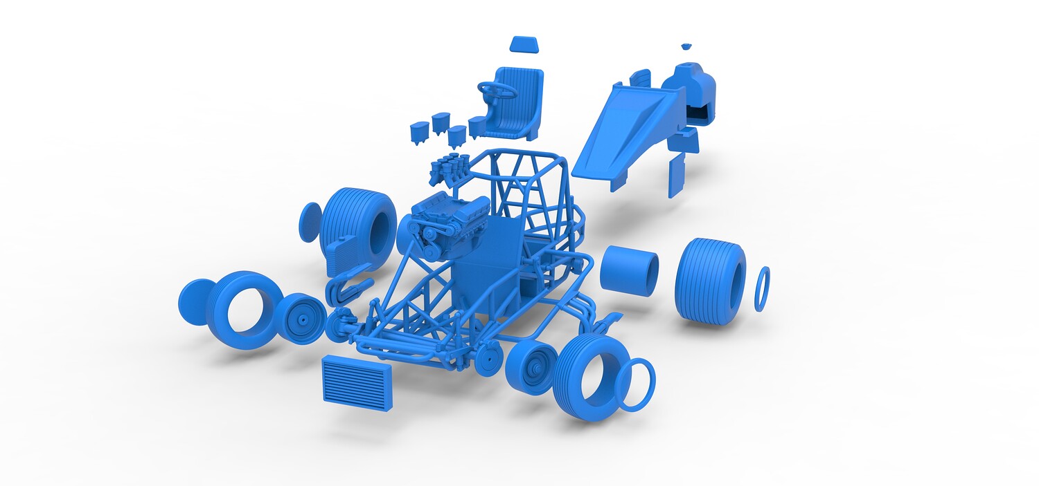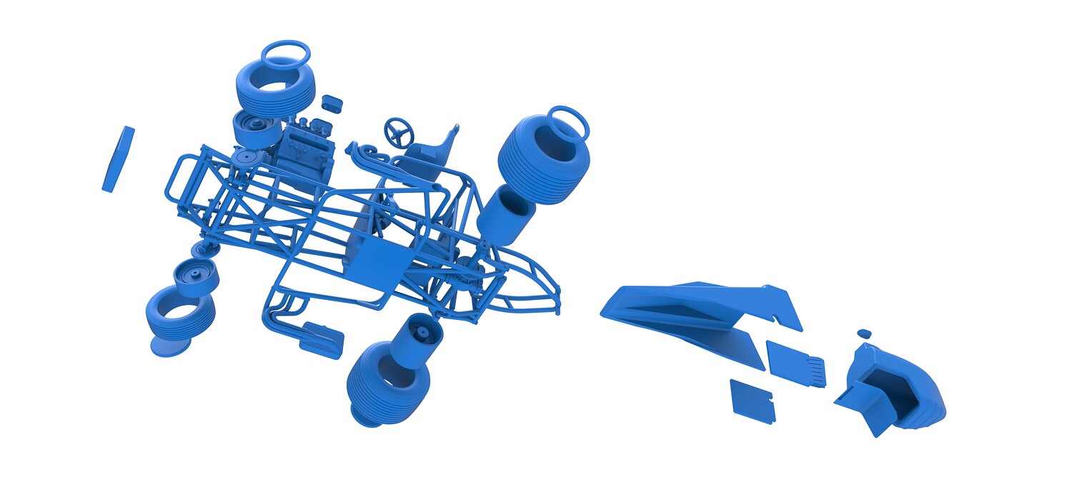 The model consists of parts: Air filters, Air intake, Beadlock rings, Engine, Frame, Front rims, Front tires, Fuel tank bottom plate, Fuel tank insert, Fuel tank, Headrest, Hood, Left exhaust, Oil tank, Radiator, Rear left tire, Rear right tire, Rear rims, Right exhaust, Right side shield, Rim covers, Seat, Side plates, Steering wheel.